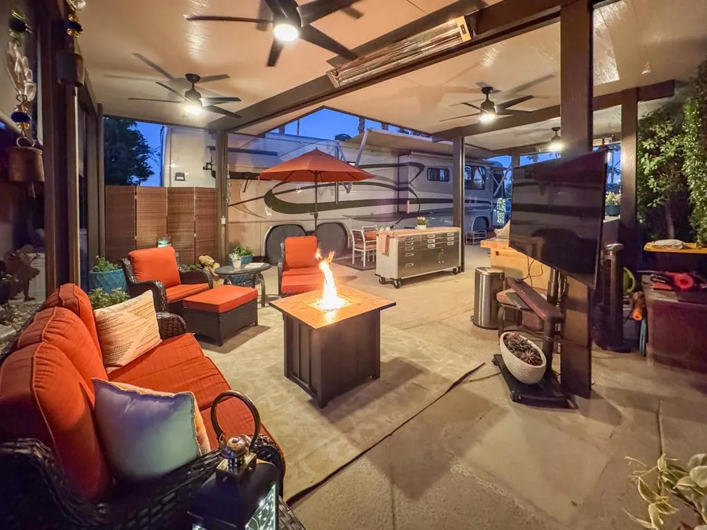 RV lot #94 offers a serene and private retreat tucked near the HOA office, where tranquil water features create a relaxing ambient backdrop. Ideally located close to a satellite pool and just a short walk to the clubhouse, the property combines convenience with calm resort living. A custom, fully permitted, one-year-old Alumawood pergola with a solid insulated roof and baked-on enamel finish provides lasting elegance and comfort, featuring 10-foot ceilings, four ceiling fans, and two ceiling heaters for effortless enjoyment throughout the season.Under the pergola, a large outdoor kitchen with tile counters and new stainless appliances--including a refrigerator, oven, cooktop BBQ, dishwasher, and microwave--sets the stage for entertaining or relaxing in style. The space also includes rolling island storage, three large storage cabinets, and a fire table for cozy evenings under the desert sky. With manual screens at the front and back, ample lighting, and a surfaced RV pad, this private lot blends beauty, comfort, and functionality. Enjoy stunning sunsets, soothing fountain sounds, and a peaceful atmosphere that make this one of the most desirable escapes in Outdoor Resort Indio. This lot has a recent survey.Outdoor Resort Indio is a Class A only motorcoach resort.