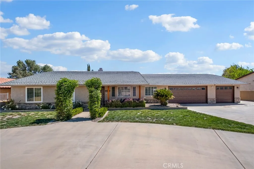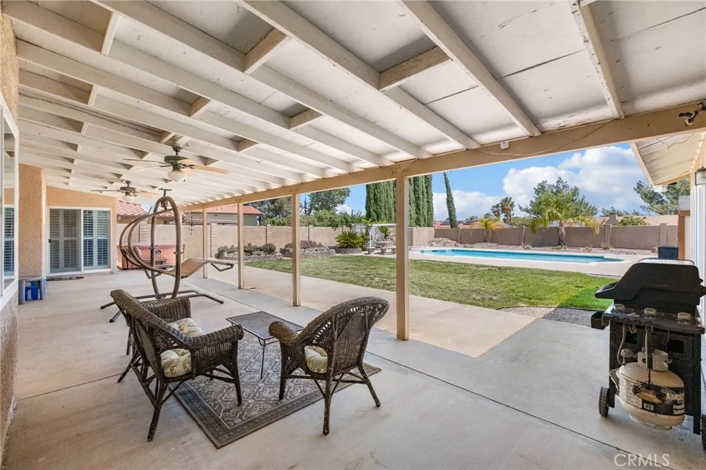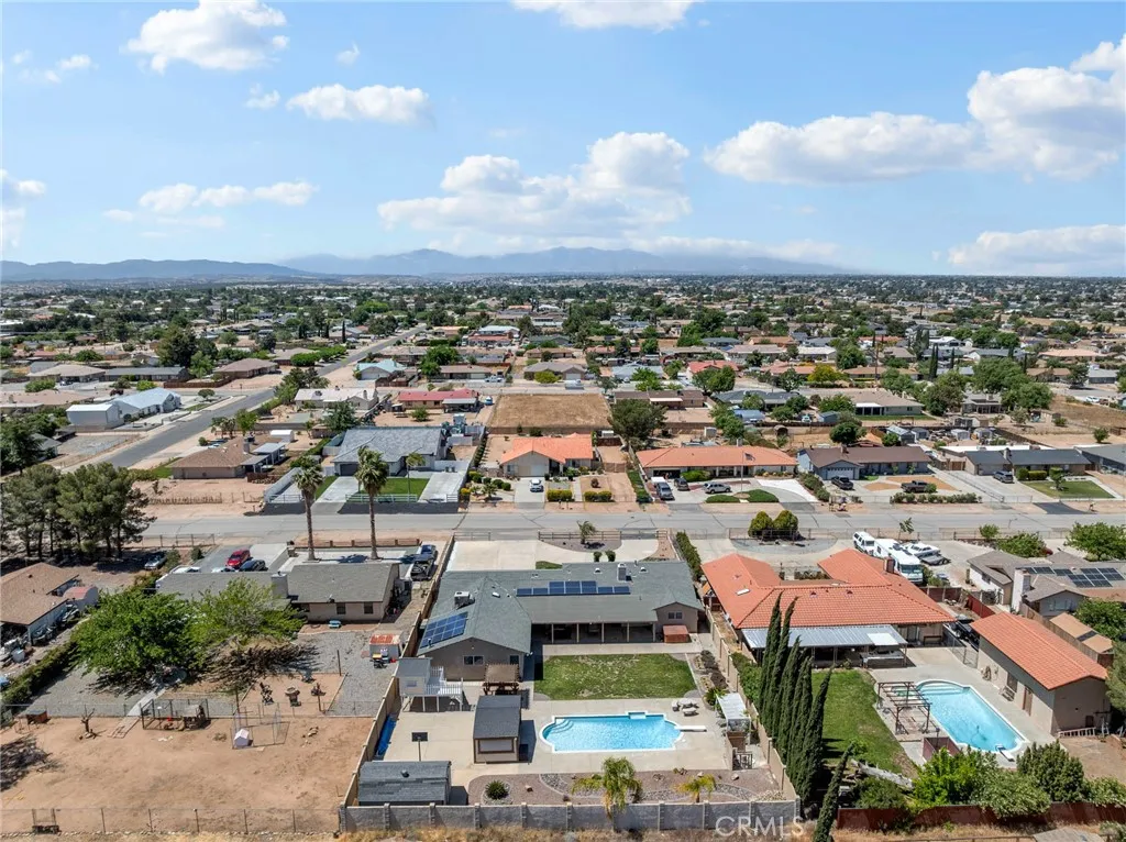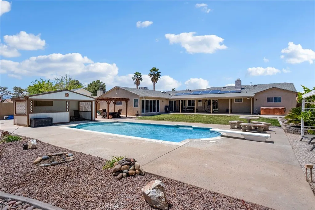 Welcome to this beautifully maintained 4-bedroom, 3-bathroom home located on "The Mesa" in Hesperia, offering a perfect blend of comfort, functionality, and exceptional indoor-outdoor living. From the moment you step inside, you’ll notice the stunning hardwood floors, plantation shutters throughout, and the pride of ownership that makes this home truly turnkey. The well-designed layout includes a formal living room, dining room, and a cozy reading room featuring a pellet stove and custom built-in storage. The spacious great room (approximately 21’ x 27’) serves as the heart of the home, complete with tall ceilings, a gas insert fireplace, built-in audio, and a pool table that stays with the property. This versatile space also provides direct access to the fourth bedroom, ideal for guests or multigenerational living. The upgraded kitchen features granite countertops and flows seamlessly into the home’s living areas. A highly functional laundry room offers a utility sink and abundant storage, and connects to an additional room providing even more storage along with an oversized pantry. A flex room adjacent to the great room adds versatility for a home office, gym, or playroom and features a skylight that brings in natural light. The recently remodeled third bathroom adds a fresh, modern touch. Step outside to enjoy a backyard designed for both relaxation and entertainment. Large windows and sliding glass doors showcase views of lush green grass and a sparkling blue in-ground pool. The expansive yard features a covered patio protected from both sun and wind, outdoor audio speakers, a spa, basketball hoop with concrete pad, a second-story playhouse, raised garden beds, and a wood pergola with a gas tabletop heater. Additional highlights include a pool house and a large 12’ x 18’ storage shed with electricity. The entire backyard is enclosed by a three-sided block wall, offering privacy and security. Completing the property is a spacious 3-car garage, providing ample parking and storage.