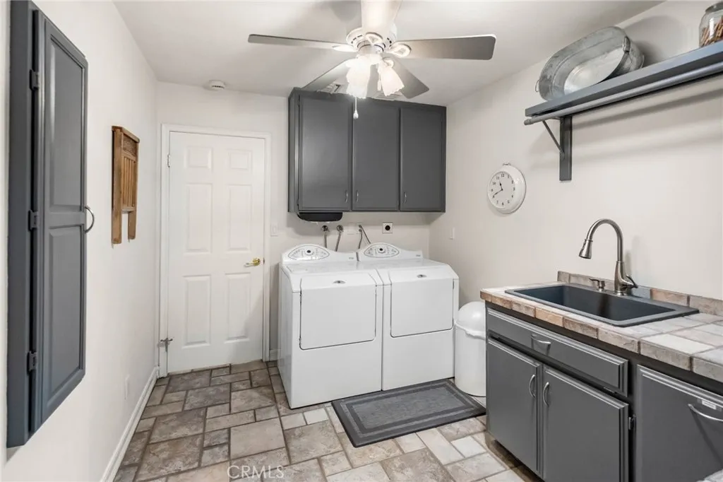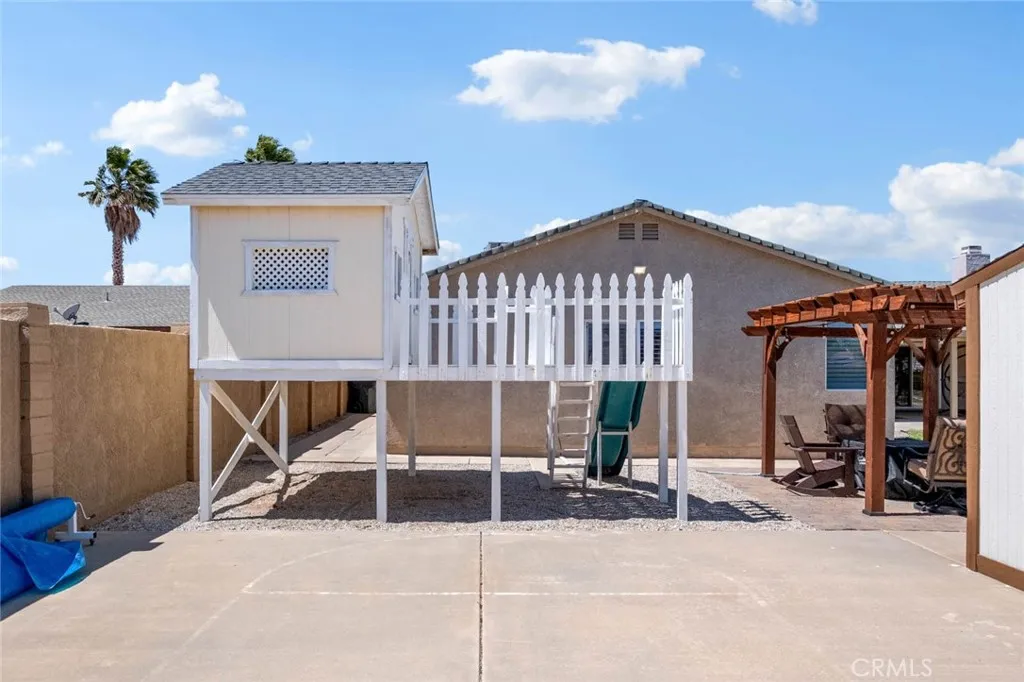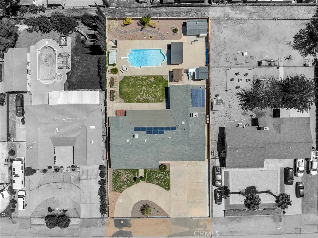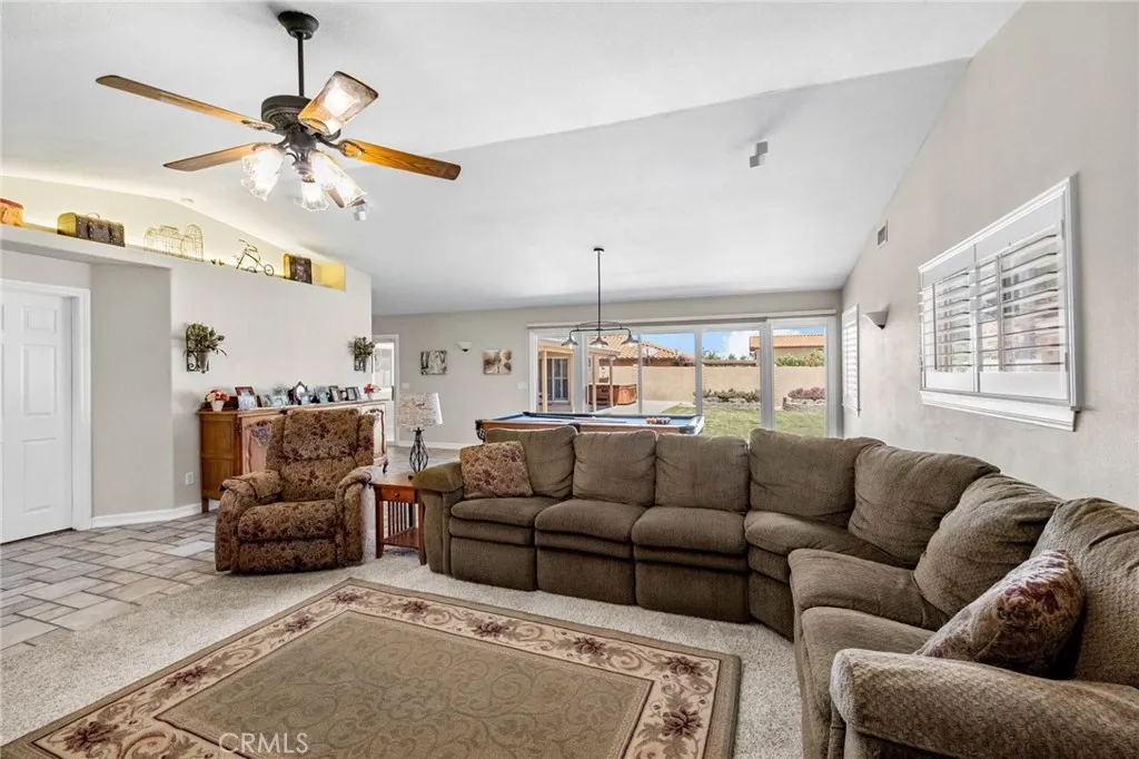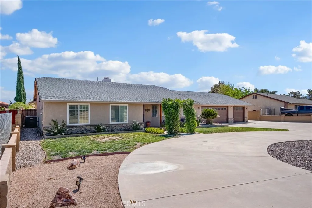 Welcome to this beautifully maintained 4-bedroom, 3-bathroom home located on "The Mesa" in Hesperia, offering a perfect blend of comfort, functionality, and exceptional indoor-outdoor living. From the moment you step inside, you’ll notice the stunning hardwood floors, plantation shutters throughout, and the pride of ownership that makes this home truly turnkey. The well-designed layout includes a formal living room, dining room, and a cozy reading room featuring a pellet stove and custom built-in storage. The spacious great room (approximately 21’ x 27’) serves as the heart of the home, complete with tall ceilings, a gas insert fireplace, built-in audio, and a pool table that stays with the property. This versatile space also provides direct access to the fourth bedroom, ideal for guests or multigenerational living. The upgraded kitchen features granite countertops and flows seamlessly into the home’s living areas. A highly functional laundry room offers a utility sink and abundant storage, and connects to an additional room providing even more storage along with an oversized pantry. A flex room adjacent to the great room adds versatility for a home office, gym, or playroom and features a skylight that brings in natural light. The recently remodeled third bathroom adds a fresh, modern touch. Step outside to enjoy a backyard designed for both relaxation and entertainment. Large windows and sliding glass doors showcase views of lush green grass and a sparkling blue in-ground pool. The expansive yard features a covered patio protected from both sun and wind, outdoor audio speakers, a spa, basketball hoop with concrete pad, a second-story playhouse, raised garden beds, and a wood pergola with a gas tabletop heater. Additional highlights include a pool house and a large 12’ x 18’ storage shed with electricity. The entire backyard is enclosed by a three-sided block wall, offering privacy and security. Completing the property is a spacious 3-car garage, providing ample parking and storage.