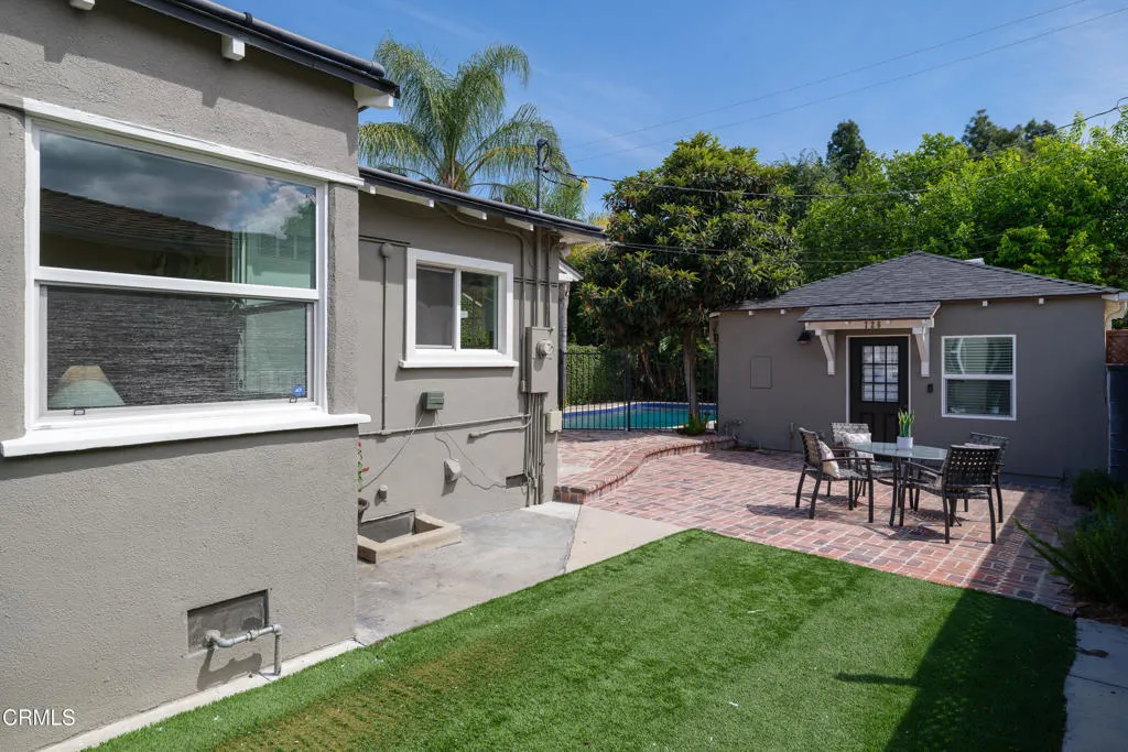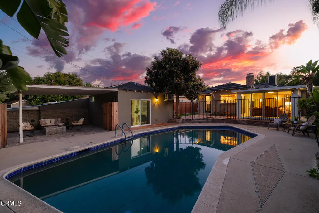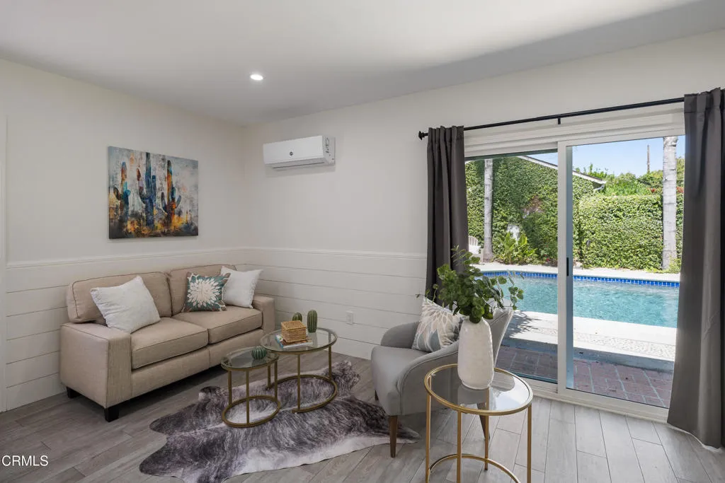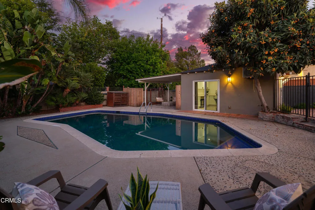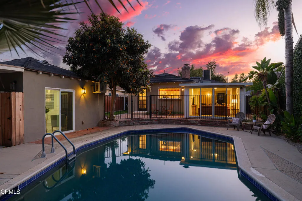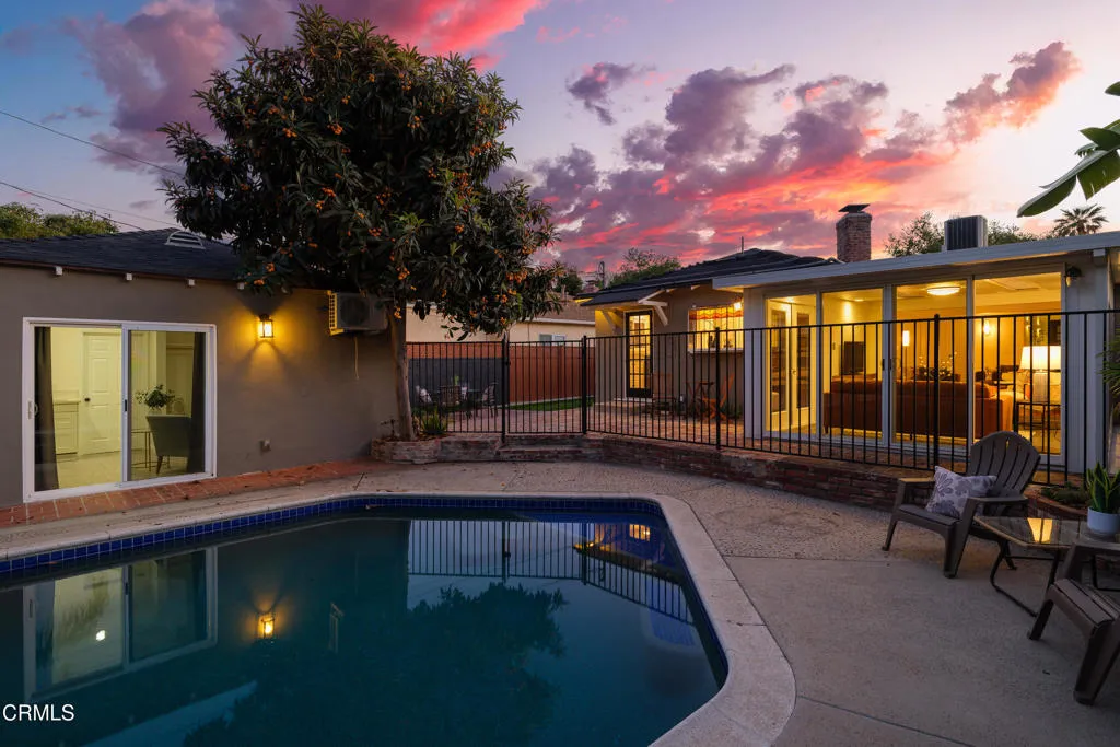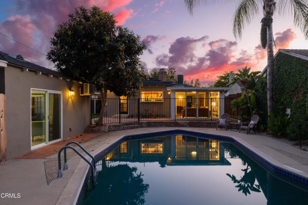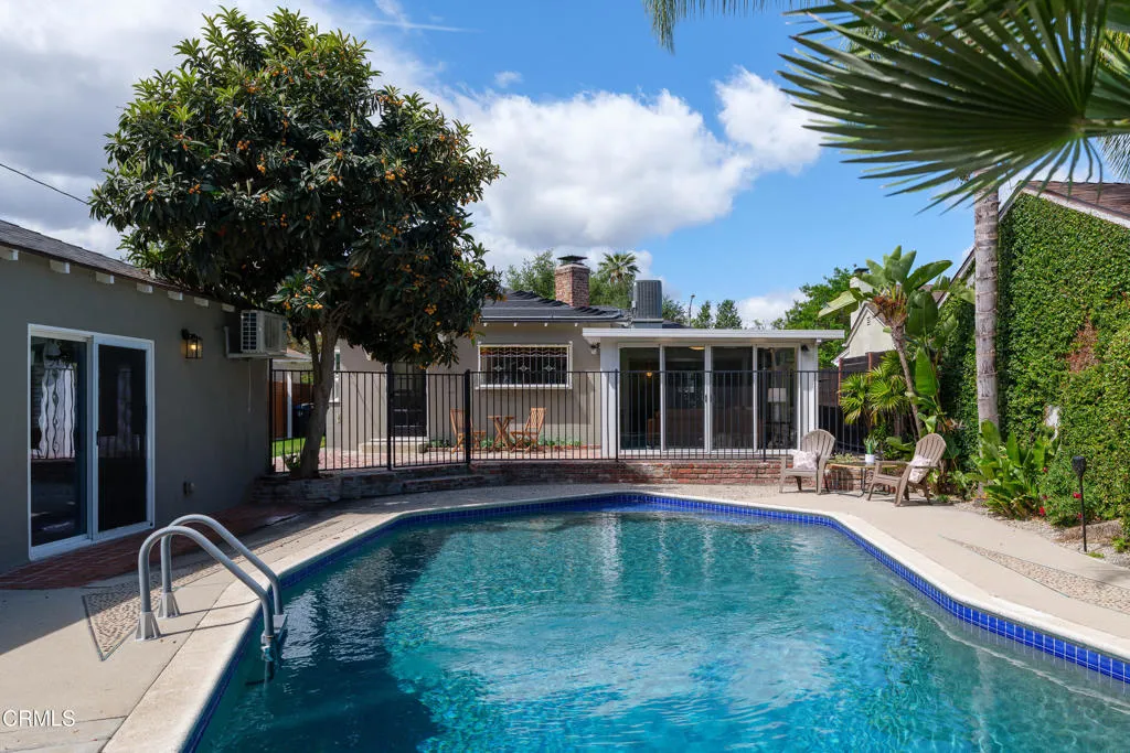 Set on a charming tree-lined street in the heart of Burbank, just moments from the studios, local parks, the Chandler bike path, and the shops and dining along Magnolia Boulevard, this beautifully updated 3-bedroom home offers style, comfort, and versatile living. Entering through a welcoming Dutch door, newly refinished hardwood floors lead into an expansive living space that seamlessly flows into a sun-filled, glass-enclosed family room with skylights. A custom-tiled fireplace with a stylish hearth anchors the main living area, creating a warm and inviting atmosphere. The updated kitchen is thoughtfully designed with tile flooring, stone countertops, a subway tile backsplash, and a stainless steel appliance suite. A standout feature is the custom copper hood above the five-burner range, complemented by abundant cabinetry and recessed lighting. A convenient laundry area with side-by-side front-loading washer and dryer is also located within the kitchen. The primary suite offers a comfortable retreat with wood-louvered shutters and a walk-in closet complete with built-in shelving and drawers. The ensuite bathroom features penny-tile flooring, a single-sink vanity, and a tub and shower combination with custom tile extending to the ceiling. Two additional bedrooms are well-sized and feature crown molding and charming coved ceilings. One includes a walk-in closet with built-ins, while the other offers ample closet space. A centrally located full bathroom serves these bedrooms and includes tile flooring, a stone countertop vanity, a tub and shower combination with subway tile surround, recessed lighting, and clerestory windows for natural light. Just outside the kitchen is a private backyard designed for both relaxation and entertaining. A brick patio and artificial turf area provide space for dining and play, while the gated pool area and a permitted covered patio offer a true outdoor retreat. Adding exceptional value is a fully permitted detached ADU, complete with wood-like flooring, a kitchenette with cabinetry, a refrigerator, and a bathroom featuring a walk-in shower with river rock flooring and tile to the ceiling. Sliding doors open to the pool deck, and a mini-split air-conditioning system ensures year-round comfort. This turnkey property combines classic charm with modern updates in one of Burbank's most desirable locations.