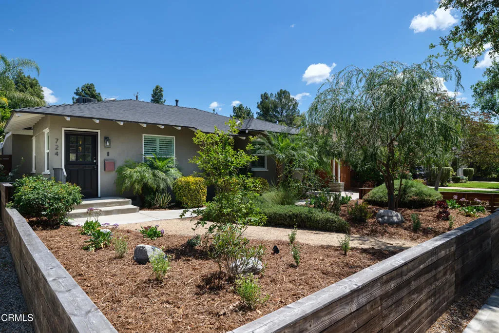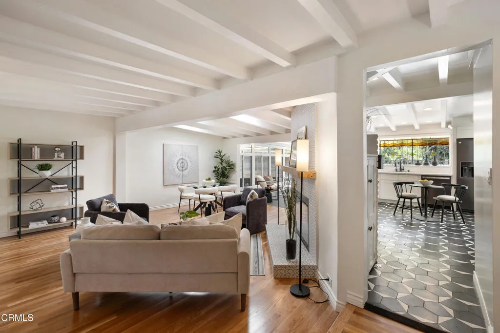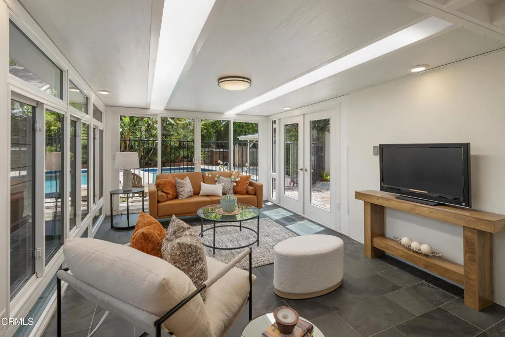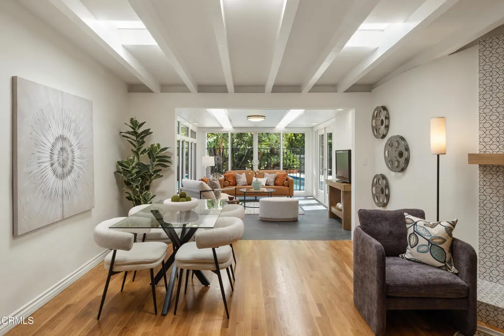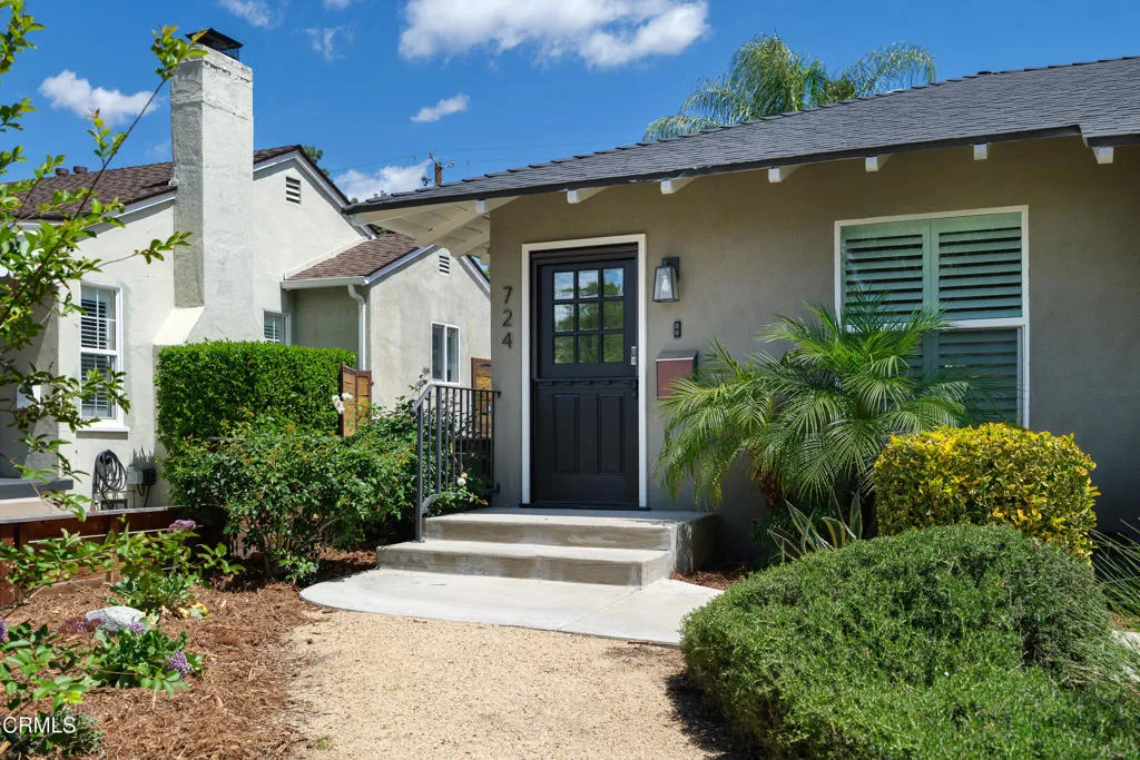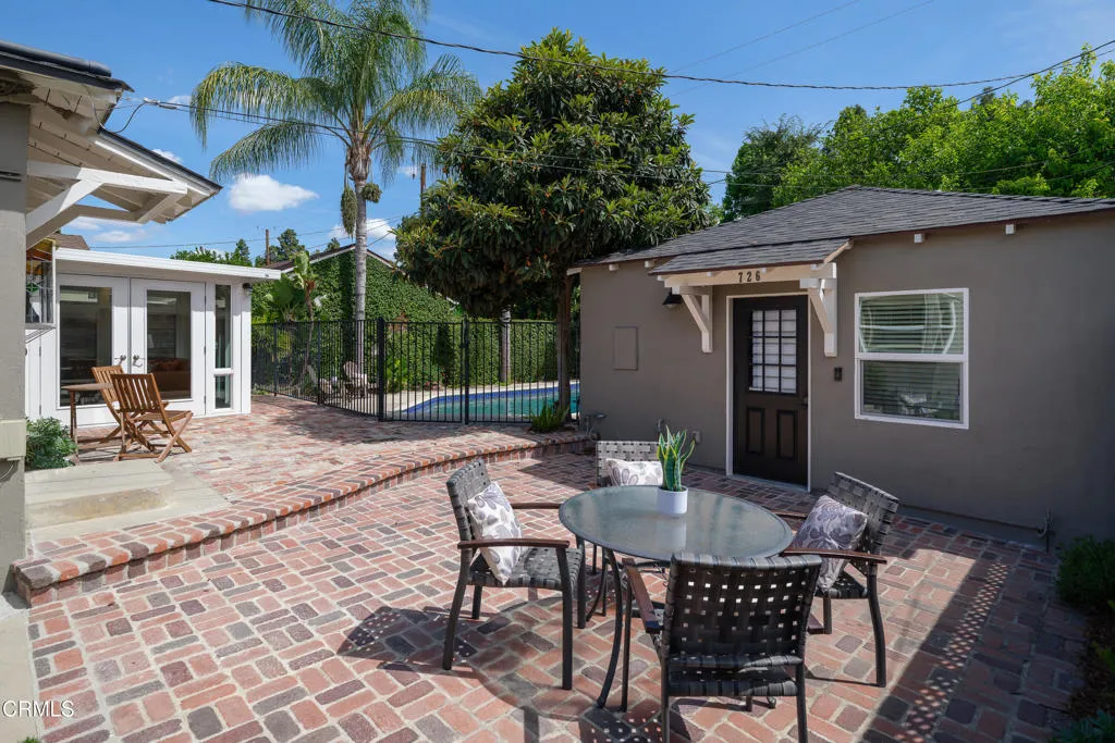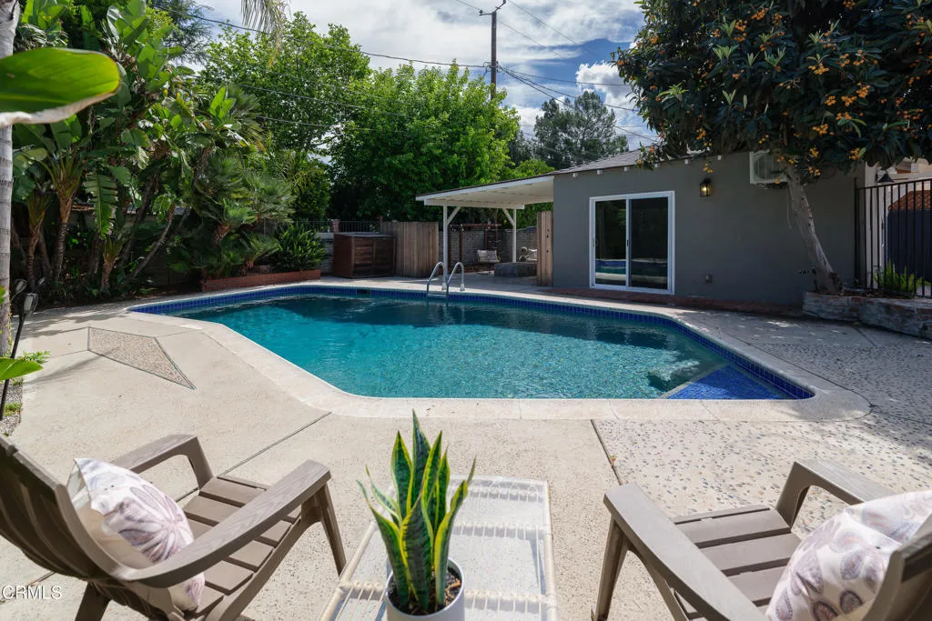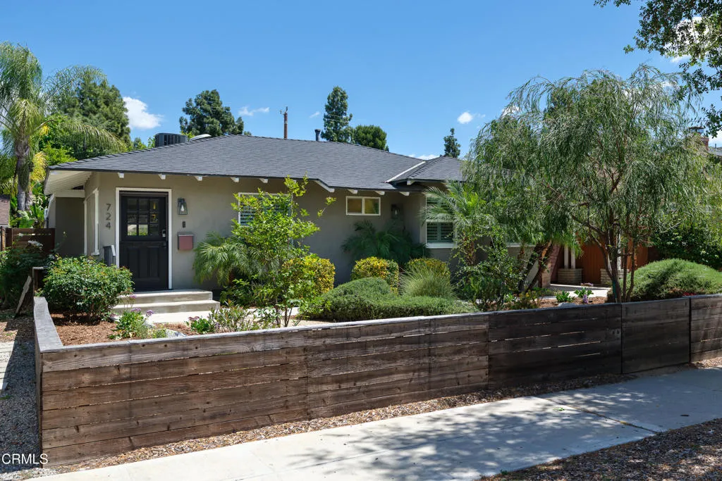 Set on a charming tree-lined street in the heart of Burbank, just moments from the studios, local parks, the Chandler bike path, and the shops and dining along Magnolia Boulevard, this beautifully updated 3-bedroom home offers style, comfort, and versatile living. Entering through a welcoming Dutch door, newly refinished hardwood floors lead into an expansive living space that seamlessly flows into a sun-filled, glass-enclosed family room with skylights. A custom-tiled fireplace with a stylish hearth anchors the main living area, creating a warm and inviting atmosphere. The updated kitchen is thoughtfully designed with tile flooring, stone countertops, a subway tile backsplash, and a stainless steel appliance suite. A standout feature is the custom copper hood above the five-burner range, complemented by abundant cabinetry and recessed lighting. A convenient laundry area with side-by-side front-loading washer and dryer is also located within the kitchen. The primary suite offers a comfortable retreat with wood-louvered shutters and a walk-in closet complete with built-in shelving and drawers. The ensuite bathroom features penny-tile flooring, a single-sink vanity, and a tub and shower combination with custom tile extending to the ceiling. Two additional bedrooms are well-sized and feature crown molding and charming coved ceilings. One includes a walk-in closet with built-ins, while the other offers ample closet space. A centrally located full bathroom serves these bedrooms and includes tile flooring, a stone countertop vanity, a tub and shower combination with subway tile surround, recessed lighting, and clerestory windows for natural light. Just outside the kitchen is a private backyard designed for both relaxation and entertaining. A brick patio and artificial turf area provide space for dining and play, while the gated pool area and a permitted covered patio offer a true outdoor retreat. Adding exceptional value is a fully permitted detached ADU, complete with wood-like flooring, a kitchenette with cabinetry, a refrigerator, and a bathroom featuring a walk-in shower with river rock flooring and tile to the ceiling. Sliding doors open to the pool deck, and a mini-split air-conditioning system ensures year-round comfort. This turnkey property combines classic charm with modern updates in one of Burbank's most desirable locations.
