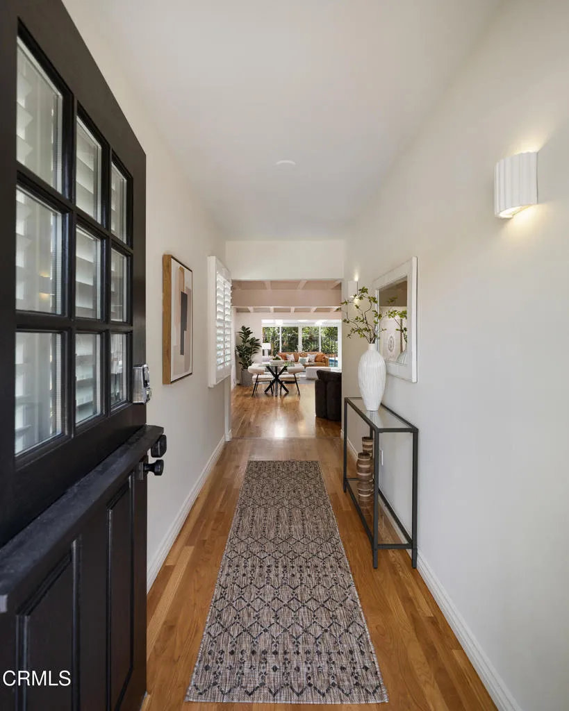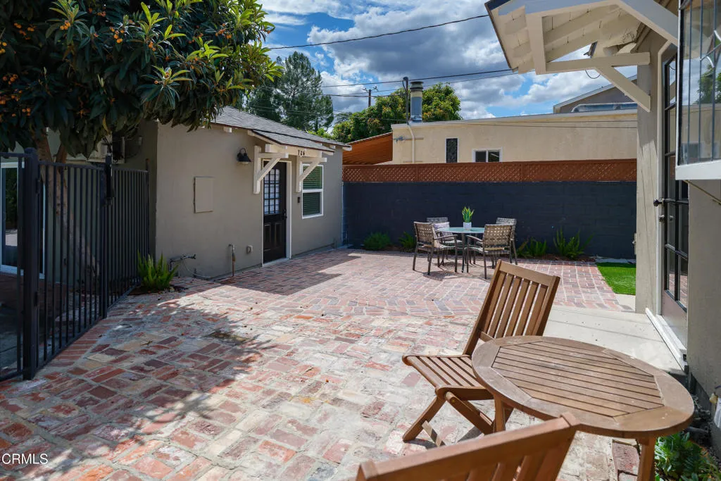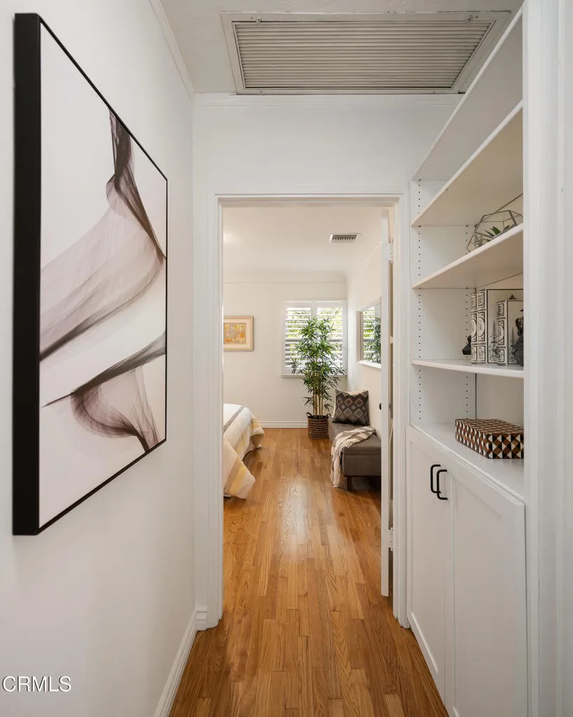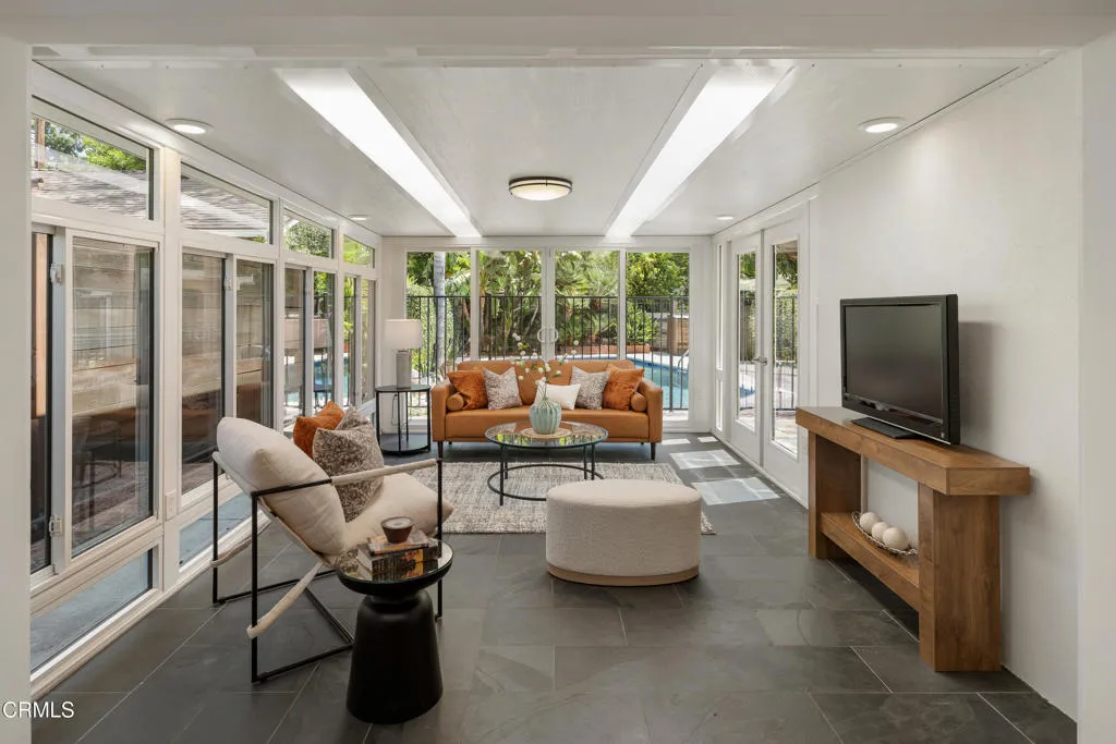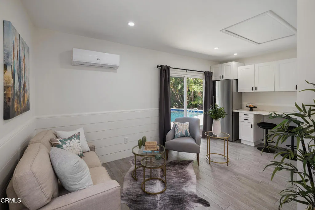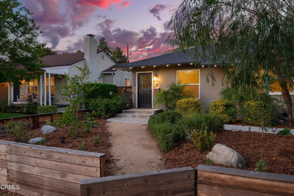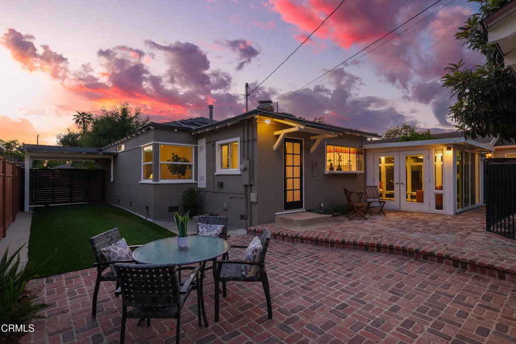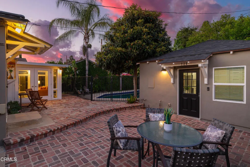 Set on a charming tree-lined street in the heart of Burbank, just moments from the studios, local parks, the Chandler bike path, and the shops and dining along Magnolia Boulevard, this beautifully updated 3-bedroom home offers style, comfort, and versatile living. Entering through a welcoming Dutch door, newly refinished hardwood floors lead into an expansive living space that seamlessly flows into a sun-filled, glass-enclosed family room with skylights. A custom-tiled fireplace with a stylish hearth anchors the main living area, creating a warm and inviting atmosphere. The updated kitchen is thoughtfully designed with tile flooring, stone countertops, a subway tile backsplash, and a stainless steel appliance suite. A standout feature is the custom copper hood above the five-burner range, complemented by abundant cabinetry and recessed lighting. A convenient laundry area with side-by-side front-loading washer and dryer is also located within the kitchen. The primary suite offers a comfortable retreat with wood-louvered shutters and a walk-in closet complete with built-in shelving and drawers. The ensuite bathroom features penny-tile flooring, a single-sink vanity, and a tub and shower combination with custom tile extending to the ceiling. Two additional bedrooms are well-sized and feature crown molding and charming coved ceilings. One includes a walk-in closet with built-ins, while the other offers ample closet space. A centrally located full bathroom serves these bedrooms and includes tile flooring, a stone countertop vanity, a tub and shower combination with subway tile surround, recessed lighting, and clerestory windows for natural light. Just outside the kitchen is a private backyard designed for both relaxation and entertaining. A brick patio and artificial turf area provide space for dining and play, while the gated pool area and a permitted covered patio offer a true outdoor retreat. Adding exceptional value is a fully permitted detached ADU, complete with wood-like flooring, a kitchenette with cabinetry, a refrigerator, and a bathroom featuring a walk-in shower with river rock flooring and tile to the ceiling. Sliding doors open to the pool deck, and a mini-split air-conditioning system ensures year-round comfort. This turnkey property combines classic charm with modern updates in one of Burbank's most desirable locations.