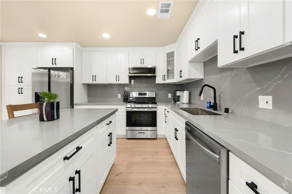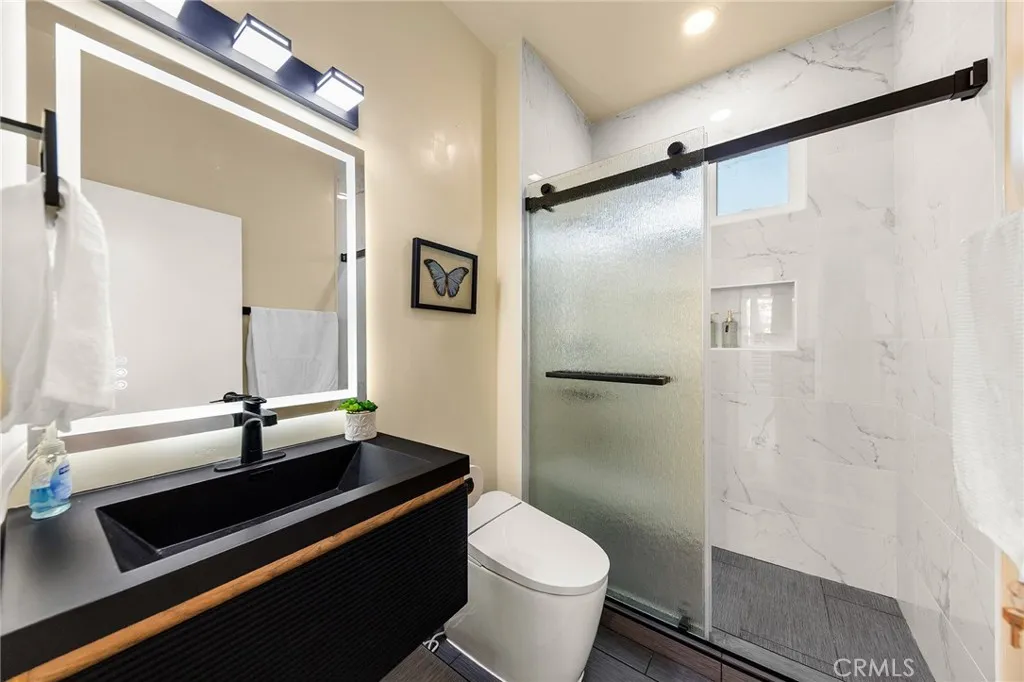 Discover a completely upgraded residence that truly resembles a brand-new home! This exceptional and stunning property is a must-see. It features a brand-new roof, doors, and windows, as well as a state-of-the-art A/C system, a modern kitchen and bathroom, new appliances, and beautifully landscaped front and back yards. The rooftop deck and high ceilings further enhance the space, complemented by a secure fence and solar lighting. Step inside to admire the custom-made, imported crystal chandeliers with adjustable lighting and the living room's unique ceiling design. The office seamlessly connects to the private rooftop deck, ensuring that every room is both spacious and filled with natural light. Enjoy amenities like skylights, smart home appliances and toilets, LED mirrors, and a walk-in closet. The waterfall-style island platform serves as a stunning centerpiece in the kitchen, while the spacious staircase is adorned with large tempered safety glass. Additional features include a double garage with epoxy flooring.Termite completed . Nestled in a safe, quiet neighborhood with friendly neighbors, this home boasts unique architecture and thoughtful design. Welcome to your dream home!