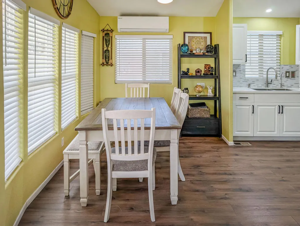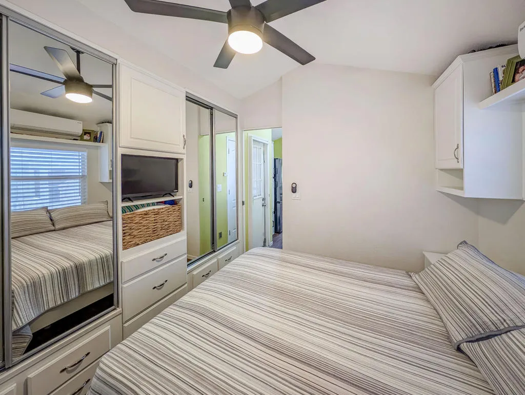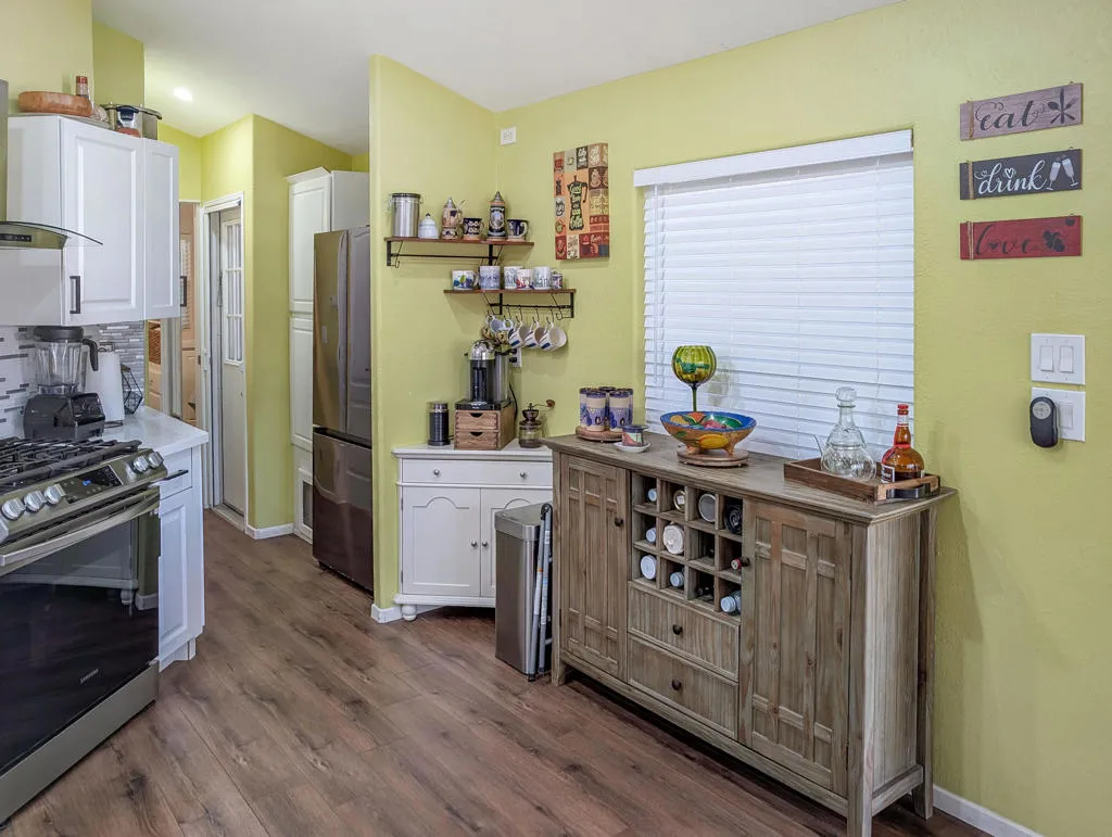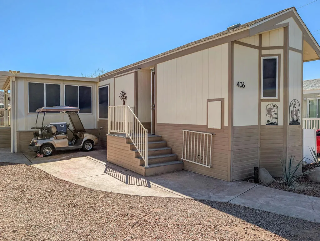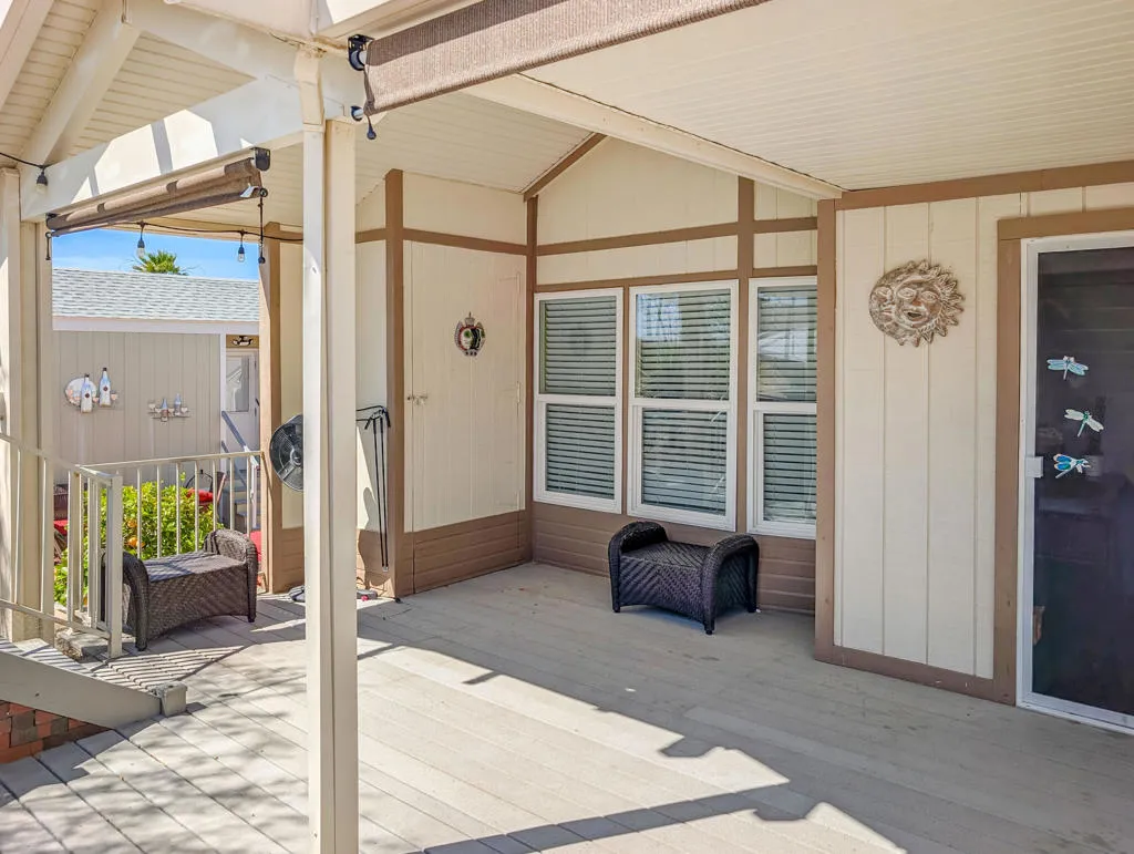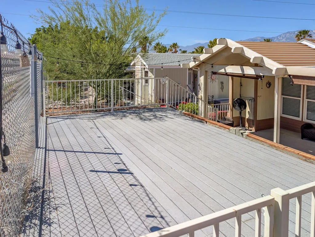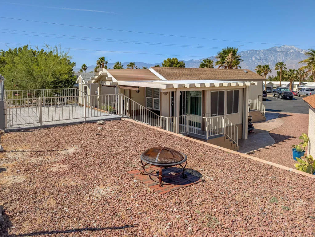 The 2007 Laurel Creek Park Model provides approximately 550 square feet of living space, featuring a bright and efficient layout. The home is fully furnished and includes two mini-split units for climate control, ensuring comfort throughout the seasons. Additional storage is available in the included shed. This home offers sweeping vistas of Mount San Jacinto, as well as views of the surrounding hills and landscapes. Its location makes it an ideal retreat, nestled in natural beauty. Outdoor spaces are thoughtfully designed for both relaxation and entertainment. Residents can enjoy a covered, wind-protected deck, a terraced landscape viewing area, and a large elevated fenced deck with expansive views. Lower seating areas are situated alongside the home, creating inviting spots to unwind. There is spacious parking available, accommodating two or more vehicles. Indoors, the bathroom has been beautifully upgraded, showcasing a tiled walk-in shower and a privatized toilet area. The kitchen features a new filtration system and has been further enhanced with new solid surface countertops, cabinets, and backsplashes. Throughout the home, luxury vinyl plank flooring has been installed, lending a modern and cohesive finish to every room. For added convenience, the property comes with a golf cart, equipped with new tires and lithium batteries, making it easy to travel throughout the park. Space rent is $811 and lot is not owned.