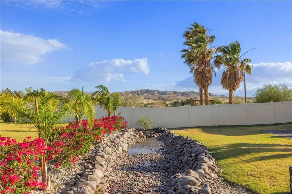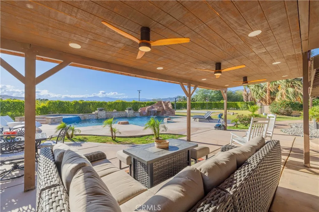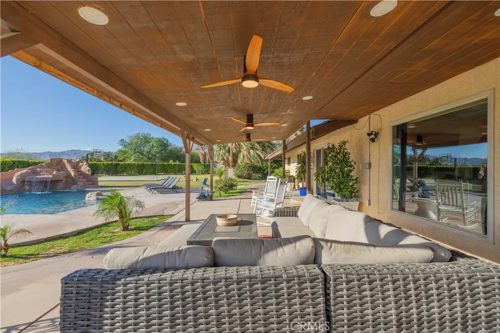 Welcome to a true oasis in Sky Valley, where privacy, space, and resort-style living come together in one unforgettable property. This exceptional 4 bedroom, 4 bath estate offers approximately 4,396 sq ft of living space and is set along a paved road with separate gated entrances for guests and owners, creating a private compound feel with room to expand, including a cleared 3/4 acre behind the home for future possibilities. Inside, the spacious floor plan features separate living and family rooms, a large game room, sunroom with custom arched windows, a dedicated home studio ideal for recording, podcasting, or creative work, and a downstairs laundry room for added everyday convenience. Saltillo tile flooring downstairs and chair rail molding throughout add warmth and character, while the kitchen remodel completed in 2021 offers serious function with 3 ovens, 2 dishwashers, and generous workspace for entertaining. The primary suite is a true retreat with direct access to an impressive 800 sq ft outdoor patio, its own upstairs laundry access, and a fully remodeled bathroom completed in 2025, featuring marble floors and walls, a separate soaking tub, and a massive glass-enclosed shower with multiple shower heads for a true spa-inspired feel. A second matching 800 sq ft patio sits off the guest bedroom, creating incredible outdoor living on both sides of the home. Major upgrades include new windows throughout in 2023, new carpet in all bedrooms and the game room in 2025, a new AC unit in 2022, a new upstairs tankless water heater in 2025, a new downstairs water heater in 2024, and a new front door. The grounds are where this property truly separates itself, with a custom 50x45 pool built in 2022 featuring a grotto, slide, waterfalls, spa, and 8 ft deep end, plus a professional basketball court with an NBA-style goal installed in 2023, a custom-built pond, and hundreds of ficus trees planted around the property to create a lush privacy hedge as they mature. With IID electric, dual gated entrances, expansive patios, major recent upgrades, and a backyard built for unforgettable entertaining, this rare Sky Valley estate delivers the space, privacy, and resort-style lifestyle buyers dream about, all just minutes from Costco and the shopping, dining, and conveniences of Palm Desert.