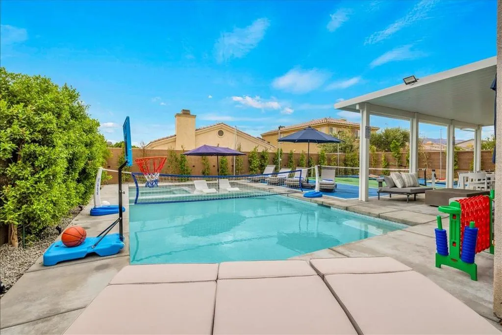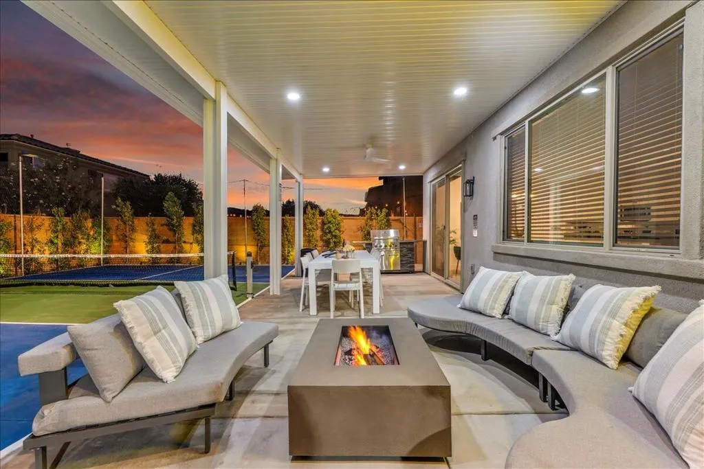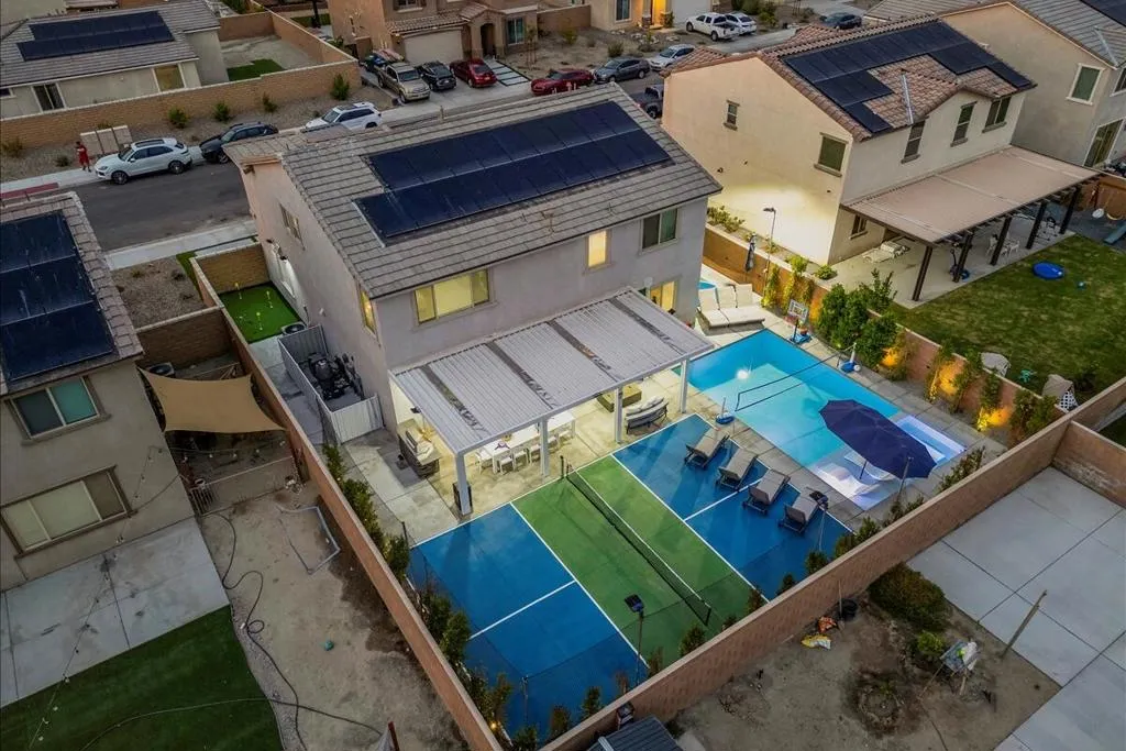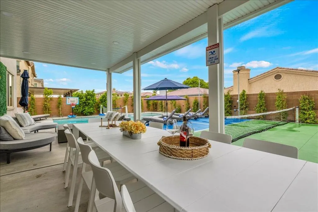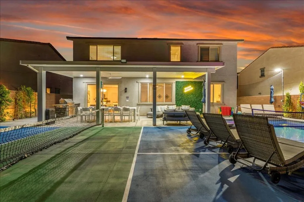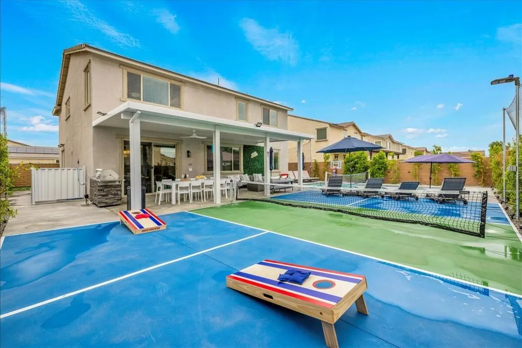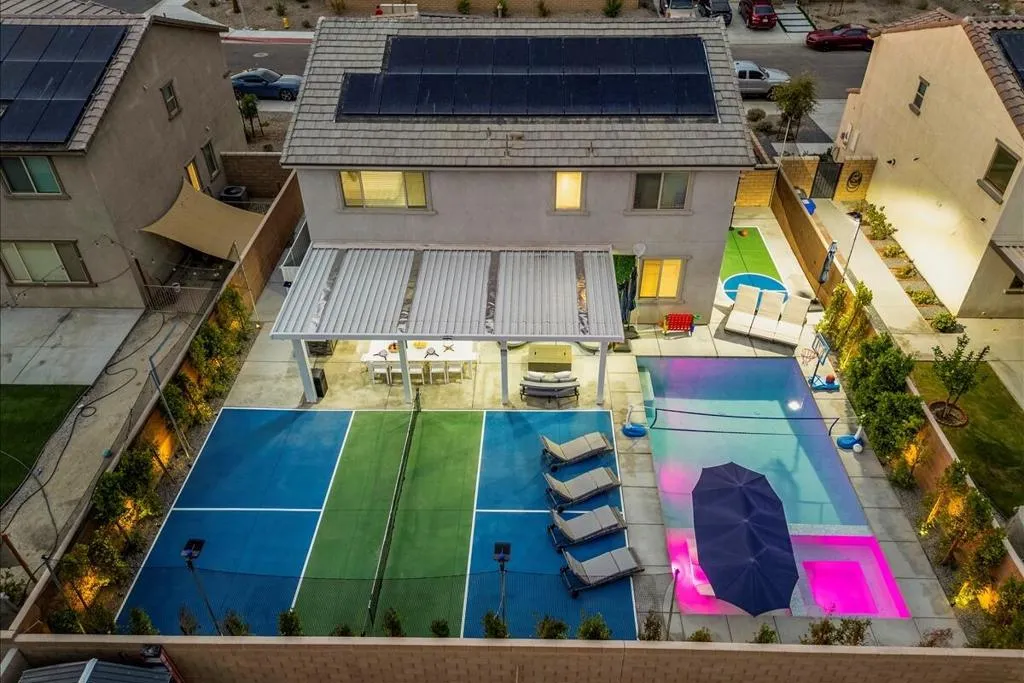 Short Term Rental Approved! Exceptional income producing with upcoming reservations, offered fully furnished and designed for luxury resort style living. This turnkey property features a bright open concept floor plan with wide plank flooring, recessed lighting, abundant natural light, and high end designer finishes throughout. The modern kitchen offers sleek cabinetry, stainless steel appliances, expansive countertops, and a large center island that opens seamlessly to the dining and living spaces perfect for entertaining. The stylish living room showcases a custom accent wall and curated furnishings included with the sale. Step outside to an incredible private backyard retreat featuring a brand new pool and spa, dramatic landscape lighting, artificial turf, and lush privacy landscaping. Designed as an entertainer's dream, the outdoor space includes multiple lounge areas, outdoor dining, BBQ area, fire pit, putting green, private pickleball court, basketball court, and recreational game spaces creating a true vacation style experience. Additional highlights include solar for energy efficiency, all new systems, a game ready garage space, and an indoor laundry room with two washers and two dryers included. Low maintenance landscaping and thoughtful upgrades throughout make this property truly move in ready. Ideal as a primary residence, vacation home, or high performing investment opportunity, this fully furnished new construction home delivers effortless luxury and exceptional income potential. Contact listing agent for additional details and schedule your private showing today.