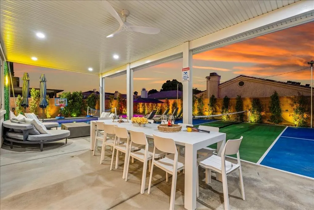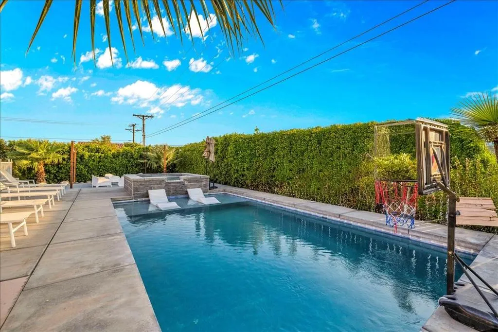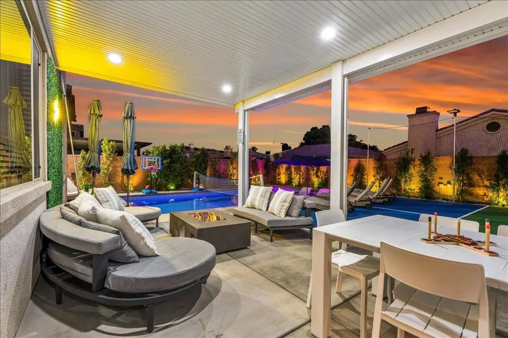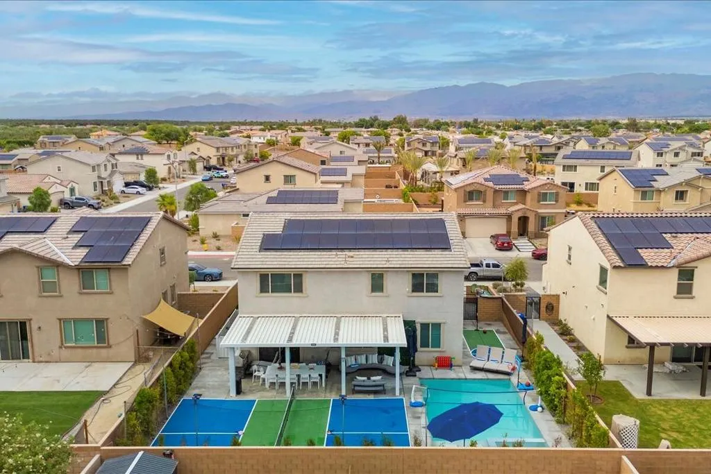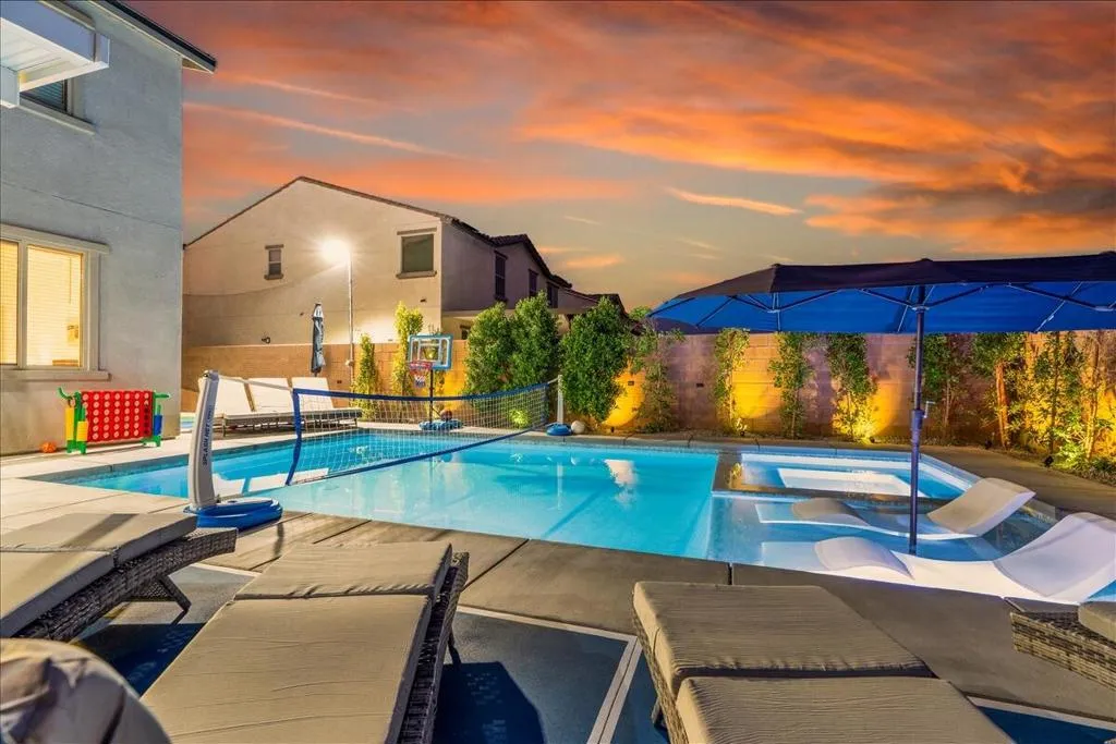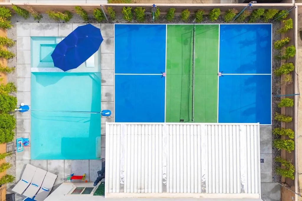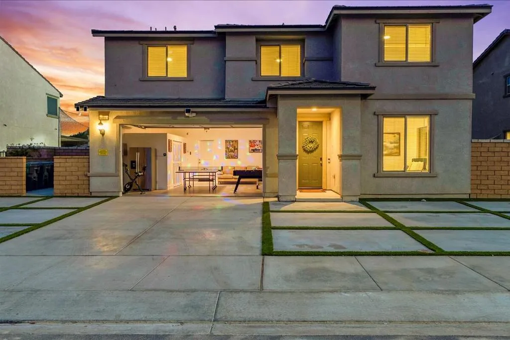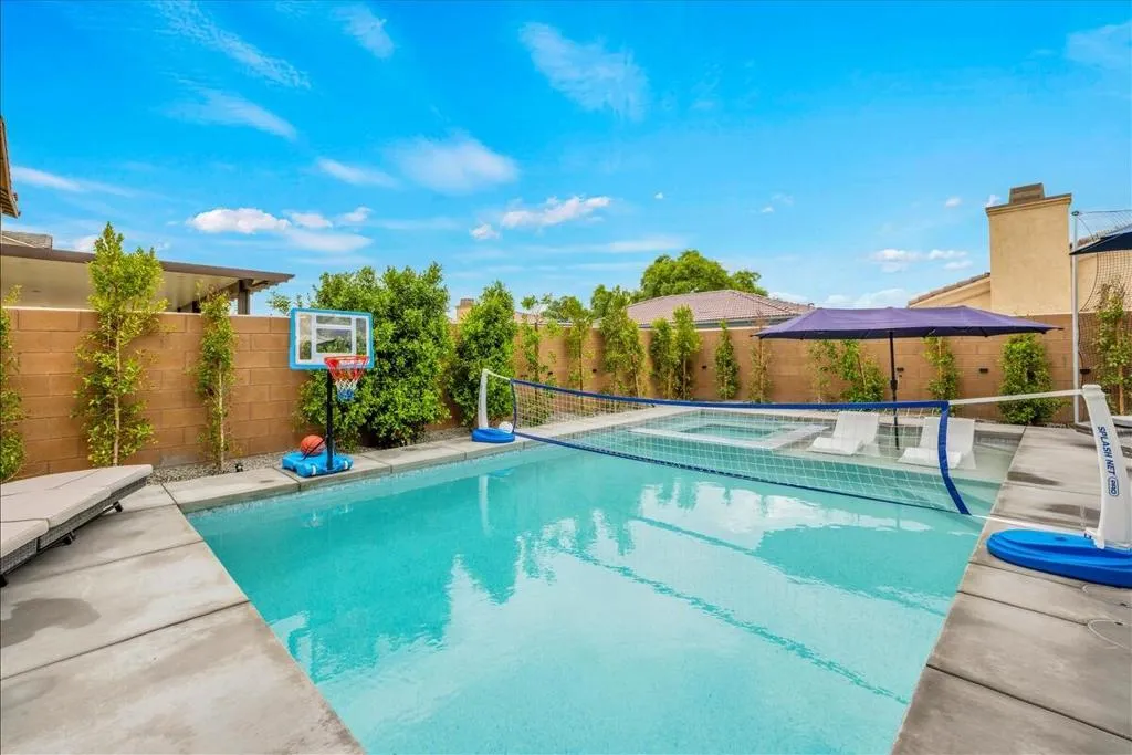 Short Term Rental Approved! Exceptional income producing with upcoming reservations, offered fully furnished and designed for luxury resort style living. This turnkey property features a bright open concept floor plan with wide plank flooring, recessed lighting, abundant natural light, and high end designer finishes throughout. The modern kitchen offers sleek cabinetry, stainless steel appliances, expansive countertops, and a large center island that opens seamlessly to the dining and living spaces perfect for entertaining. The stylish living room showcases a custom accent wall and curated furnishings included with the sale. Step outside to an incredible private backyard retreat featuring a brand new pool and spa, dramatic landscape lighting, artificial turf, and lush privacy landscaping. Designed as an entertainer's dream, the outdoor space includes multiple lounge areas, outdoor dining, BBQ area, fire pit, putting green, private pickleball court, basketball court, and recreational game spaces creating a true vacation style experience. Additional highlights include solar for energy efficiency, all new systems, a game ready garage space, and an indoor laundry room with two washers and two dryers included. Low maintenance landscaping and thoughtful upgrades throughout make this property truly move in ready. Ideal as a primary residence, vacation home, or high performing investment opportunity, this fully furnished new construction home delivers effortless luxury and exceptional income potential. Contact listing agent for additional details and schedule your private showing today.