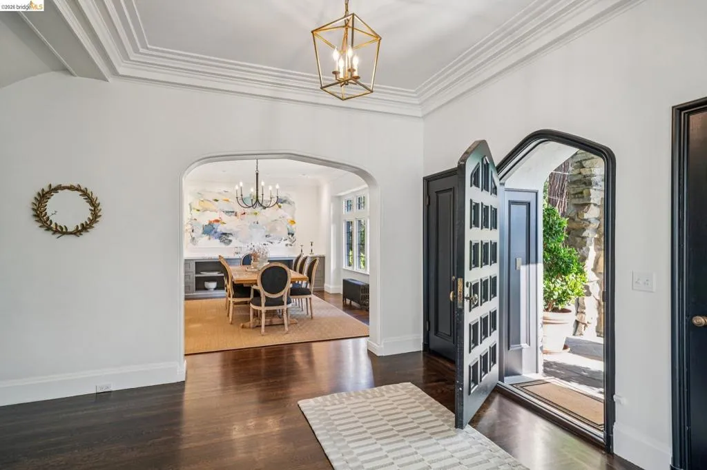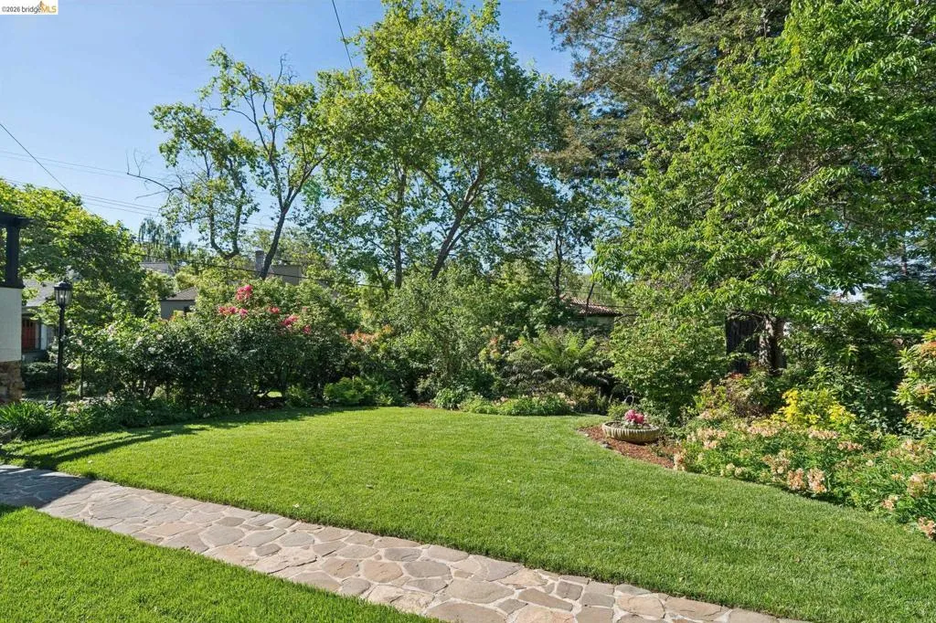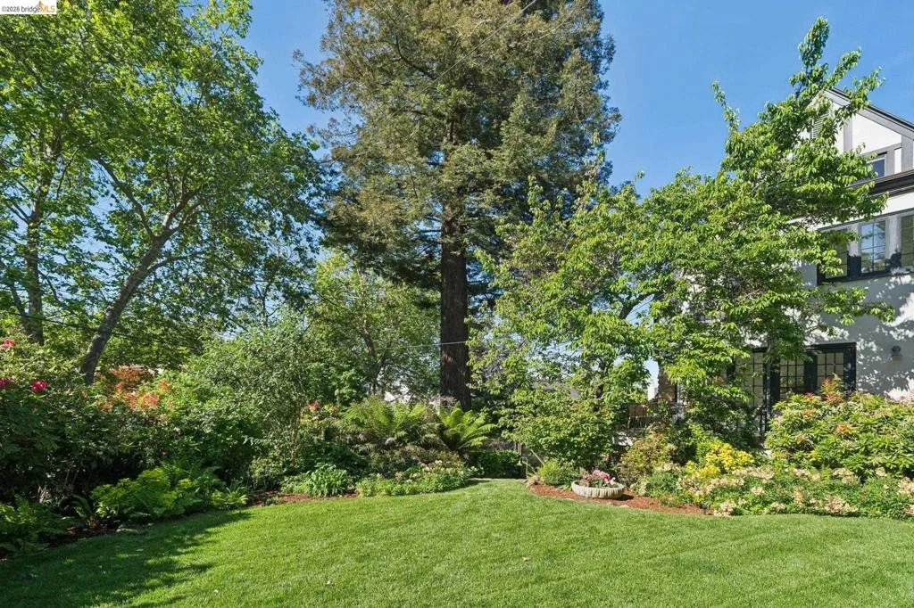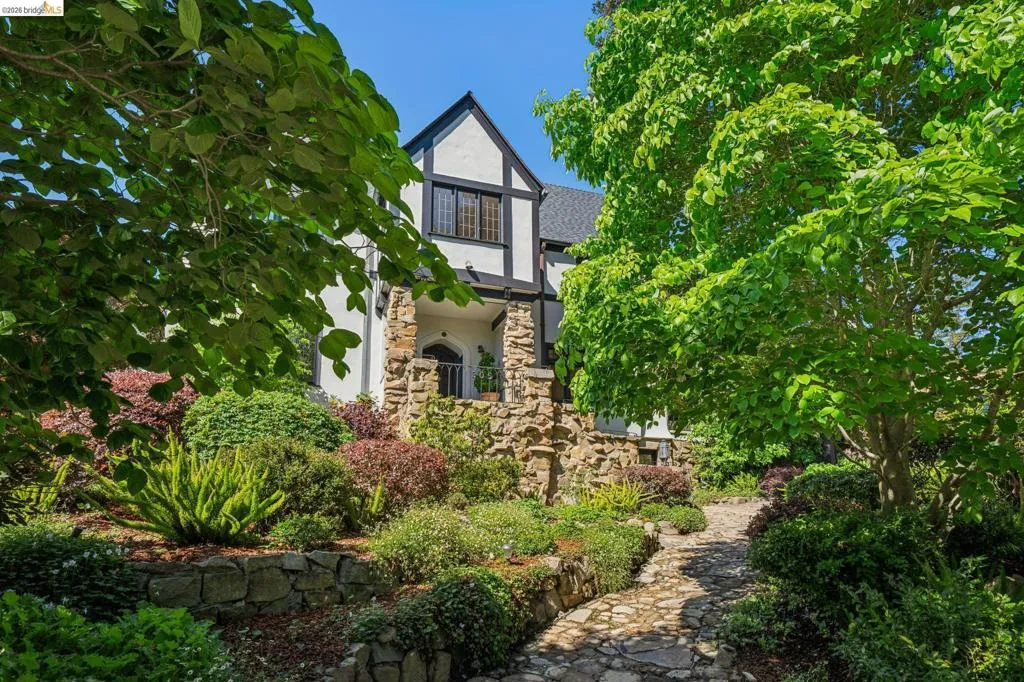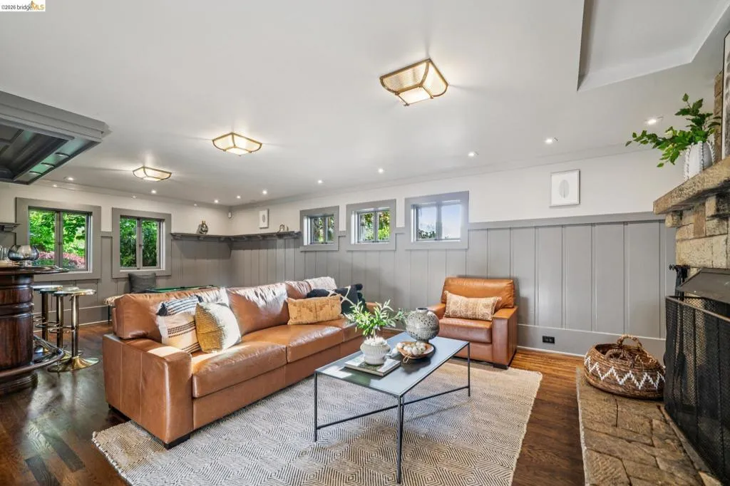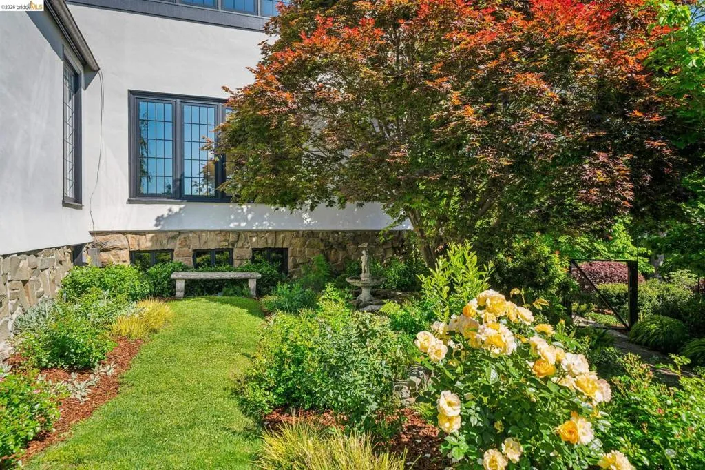 This exceptional six-bedroom estate and detached cottage exemplify the best of the Piedmont lifestyle. Located near top-rated K-12 schools, verdant parks, and the newly re-opened community pool, this 1907 home blends historic nostalgia with a masterfully updated floorplan. Built with original stone from the Rockridge quarry, the residence offers an elegant yet comfortable flow ideal for modern living. The entry foyer leads to gracious spaces with soaring ceilings and a grand central staircase. At the heart of the home, the modern epicurean kitchen and family great room feature professional appliances, a butler’s pantry, and an expansive island. Accordion glass doors create a seamless transition to a patio, hot tub, and lush lawns—perfect for large-scale entertaining or quiet afternoons. The main level also hosts a formal living room with one of the home’s four fireplaces, a den, and a large library/billiards room. West-facing windows capture stunning sunsets over a garden filled with citrus, roses, and fruit trees. The upper level offers four ensuite bedrooms. The primary suite enjoys views of Oakland, San Francisco, and the Bay, while two additional bedrooms feature French doors leading to a copper-inlaid balcony. A large attic provides potential for an additional 1,000+ square feet of development. The lower level serves as a entertainment hub, featuring a historic bar (a former speakeasy?) with a wood-burning fireplace and a climate-controlled wine room. This level also includes a fifth ensuite bedroom with its own kitchen and laundry, ideal for guests. To the east, a light-filled detached two-bedroom cottage sits above a three-car garage. Equipped with its own heating, hot water, and laundry. Two sets of French doors lead to a sunny and cheerful deck.