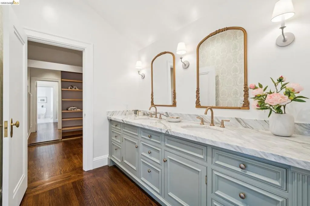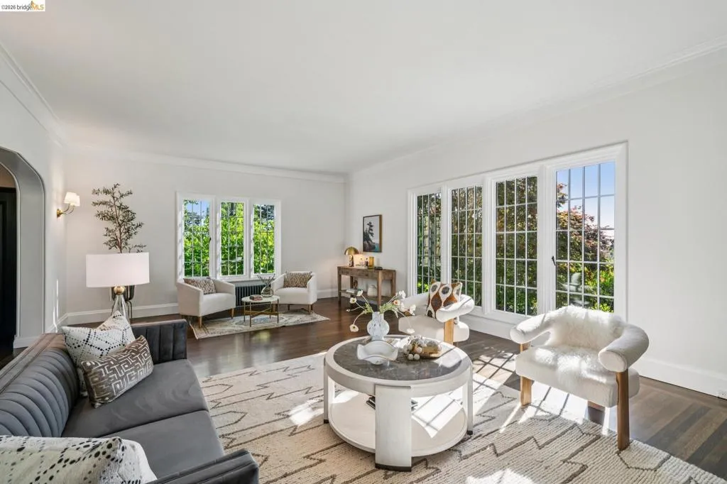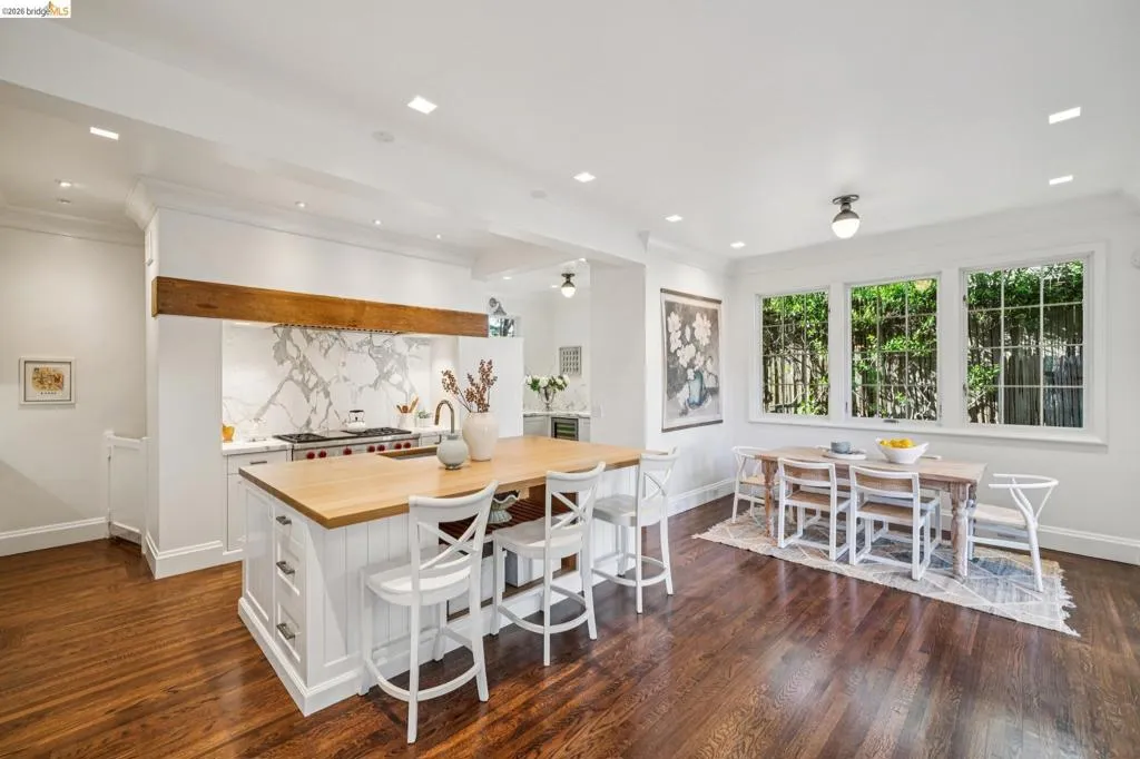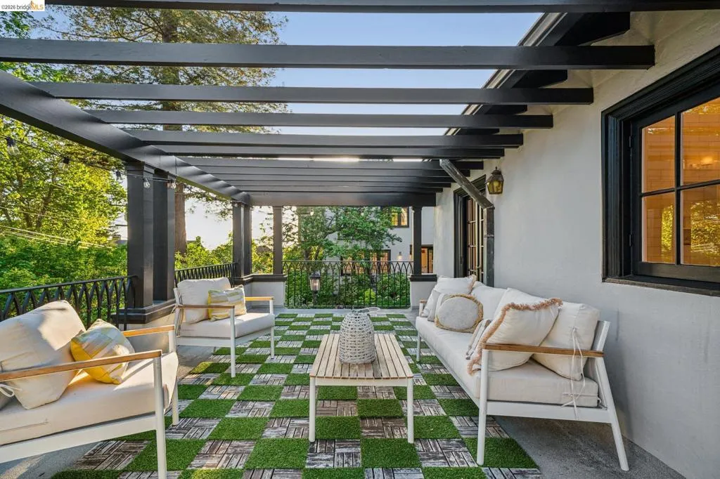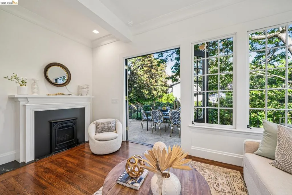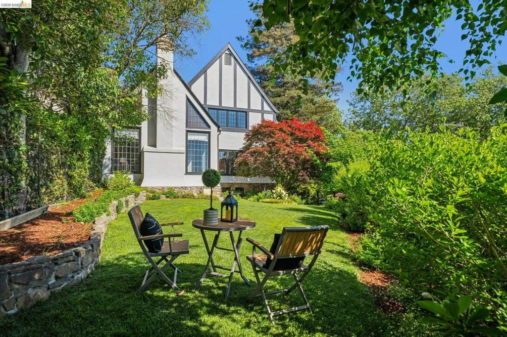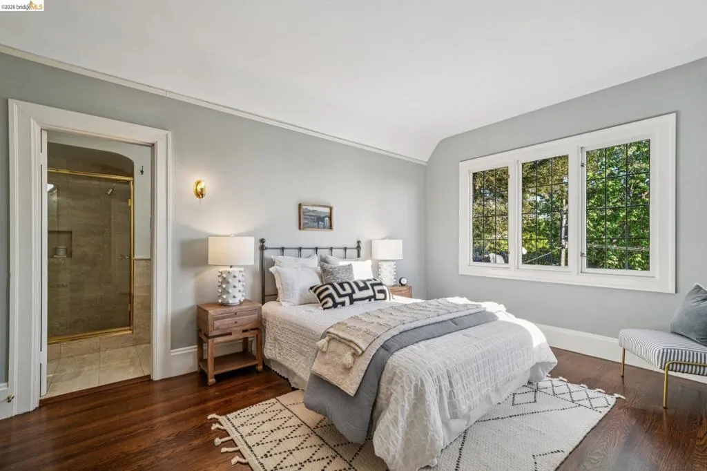 This exceptional six-bedroom estate and detached cottage exemplify the best of the Piedmont lifestyle. Located near top-rated K-12 schools, verdant parks, and the newly re-opened community pool, this 1907 home blends historic nostalgia with a masterfully updated floorplan. Built with original stone from the Rockridge quarry, the residence offers an elegant yet comfortable flow ideal for modern living. The entry foyer leads to gracious spaces with soaring ceilings and a grand central staircase. At the heart of the home, the modern epicurean kitchen and family great room feature professional appliances, a butler’s pantry, and an expansive island. Accordion glass doors create a seamless transition to a patio, hot tub, and lush lawns—perfect for large-scale entertaining or quiet afternoons. The main level also hosts a formal living room with one of the home’s four fireplaces, a den, and a large library/billiards room. West-facing windows capture stunning sunsets over a garden filled with citrus, roses, and fruit trees. The upper level offers four ensuite bedrooms. The primary suite enjoys views of Oakland, San Francisco, and the Bay, while two additional bedrooms feature French doors leading to a copper-inlaid balcony. A large attic provides potential for an additional 1,000+ square feet of development. The lower level serves as a entertainment hub, featuring a historic bar (a former speakeasy?) with a wood-burning fireplace and a climate-controlled wine room. This level also includes a fifth ensuite bedroom with its own kitchen and laundry, ideal for guests. To the east, a light-filled detached two-bedroom cottage sits above a three-car garage. Equipped with its own heating, hot water, and laundry. Two sets of French doors lead to a sunny and cheerful deck.