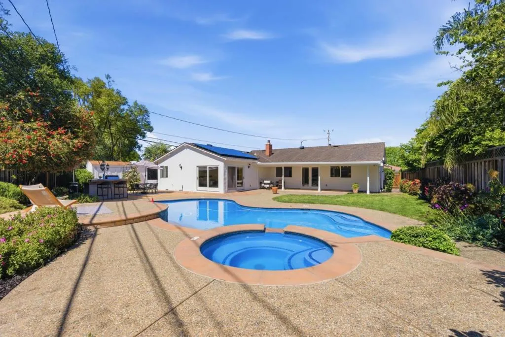 This beautiful home offers a seamless blend of comfort, style and effortless California living. Hardwood floors run throughout, guiding you into a thoughtfully designed open floorplan. At the heart of the home, a spacious kitchen invites gathering and connection, featuring a large island, granite countertops and stainless appliances. The space flows naturally into the dining area/living room, where views of the expansive backyard set the stage for both relaxed evenings and lively entertaining. The backyard becomes your private retreatcomplete with a sparkling pool and spa, offering the perfect backdrop for weekend gatherings and restful moments. Four spacious bedrooms provide comfort and flexibility, including two ensuite retreats w/private baths and generous closet space. Two additional bedrooms are complemented by an updated hall bathroom. Freshly painted & landscaped. Additional features: 2-car attached garage, 220V outlet for EV charging & owned solar system for energy efficiency. Set within Cherry Chase, a neighborhood cherished for its top-rated schools, peaceful residential feel & strong sense of community, the home also offers easy access to major commute routesbringing the best of Silicon Valley within effortless reach while still feeling like a place to truly unwind.
