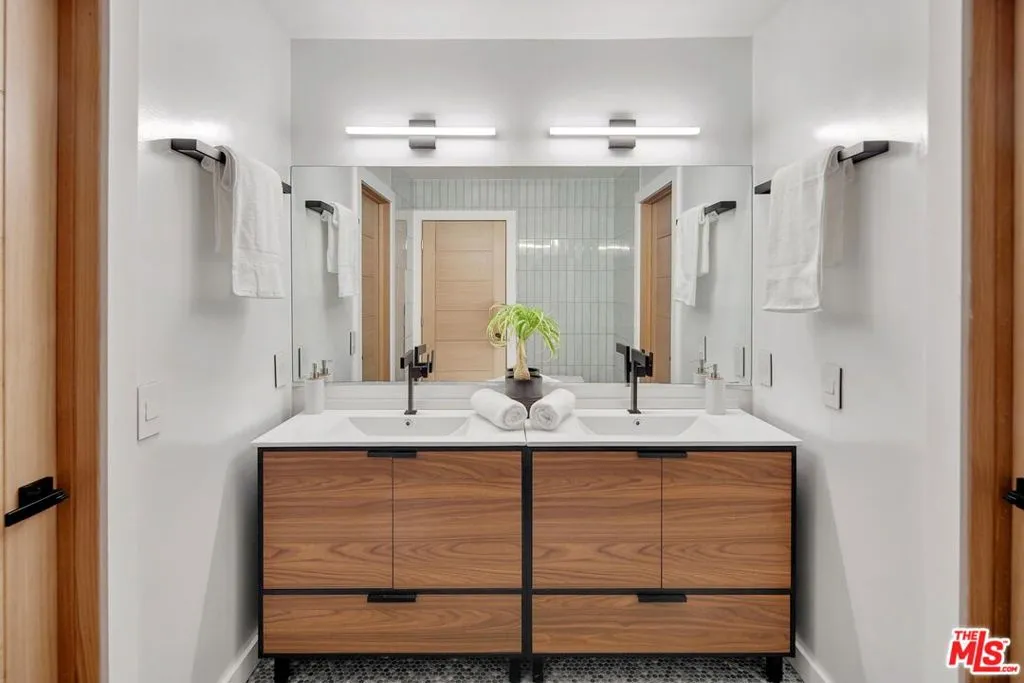 Optimized for the ideal SoCal lifestyle with a focus on recreation, this skillfully renovated, like-brand-new contemporary is tucked away on a coveted 'The Hills' cul-de-sac: Promising great value, the incredibly versatile backyard is perfect for entertaining with two covered patios, vast mahogany entertainer's deck, fire pit, heated swimming pool with water feature, spa, grassy yard, basketball free-throw line court, playhouse, and built-in barbecue! There is even a terraced organic vegetable garden for harvesting fresh home-grown fare. A fusion of varied texture and tone contribute to the exterior's curb appeal together with the lush, pristine gardens. Enter through a glass-paned pivot door to a double-height foyer illuminated by a large skylight above the staircase. Discover high-end finishes and wide-plank oak floors throughout. The living room features a bay window, cathedral ceiling, and a stylish quartz-clad fireplace with mantel. The formal dining room has a tray ceiling and large picture windows with sweeping views of the pool, valley, and surrounding greenery. The kitchen is fitted with a Forza porcelain double-sided waterfall island and matching backsplash with shelving, custom cabinetry, and top-of-the-line stainless-steel appliances including Wolf range, built-in coffee/espresso, and massive side-by-side refrigerator/freezer while adjacent breakfast nook is relaxing with a spectacular view. The family room is striking, with its magazine-worthy accent wall appointed with built-in cabinets, fireplace, and wine bar cellar creating a soothing atmosphere. Ground level offers a modern-design bathroom with exterior entrance, ideal for pool guests, plus an additional formal powder room. The separate office and light-filled in-law suite with attached bathroom complete the main floor in this elegant villa that can satisfy all family needs. Upstairs, through double doors is a spacious primary suite with marble fireplace and panoramic private balcony with spectacular vistas of the city, greenery, hills, Braemar, and the Valley beyond. Its spacious bathroom includes a vaulted ceiling with skylight, double-sink floating vanity, make-up desk, water closet, glass-enclosed shower with eucalyptus steam bath, and giant soaking tub. Several closets complete the ample spaces of the suite. Upper floor includes three more bedrooms and two en-suite bathrooms, one of which is Jack-and-Jill. Additional amenities include central vacuum, laundry chute, Nest smart home technology with all-in-one app control, built-in safe, new dual-zone AC/heat, and three-garage. Welcome to your new luxury lifestyle in 'The Hills' near Braemar and El Caballero golf clubs, schools and parks, the 101 Freeway, and the numerous shops and restaurants along Ventura Boulevard. Available with furnishings.