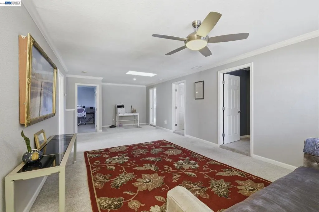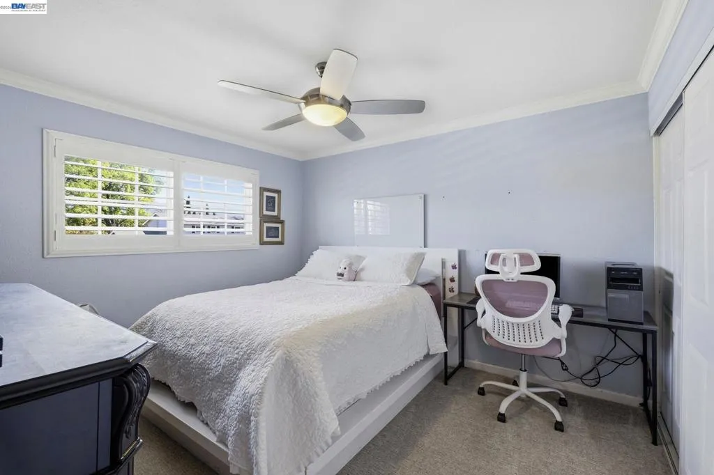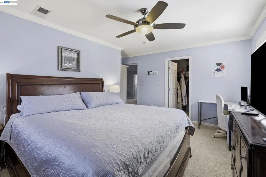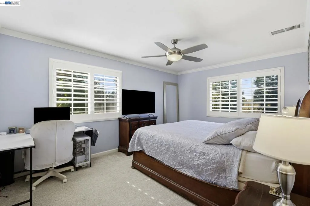 Beautifully upgraded executive home with an exceptional open-concept layout designed for entertaining. The massive showpiece kitchen features granite counters, center island, newer stainless appliances, beverage center with beer keg, and sightlines to multiple living spaces plus a grand dining area. Offering 3,894± sq ft, this expansive home includes 5 bedrooms, 4 full baths, a main-level bedroom and bath, spacious bonus room, and a versatile detached 10' x 16' shed ideal for office, gym, or studio. Elegant upgrades include French Oak flooring, remodeled baths, newer carpet, fresh interior paint, recessed LED lighting, designer fixtures, new roof, and newer HVAC with updated ducting. Smart features include keyless entry, automated blinds and patio louvers, Ring doorbell, and owned 13.6KW solar. Enjoy a private backyard retreat with no rear neighbors, mature fruit trees, spa, and covered patio. Prime location near BART, trails, and local amenities.