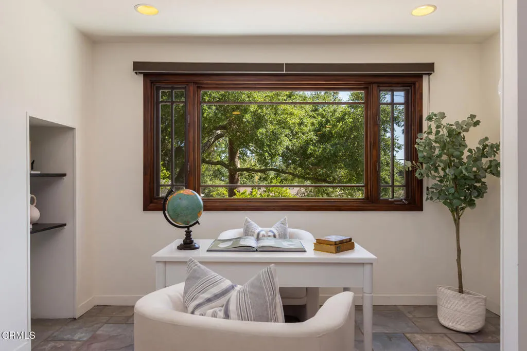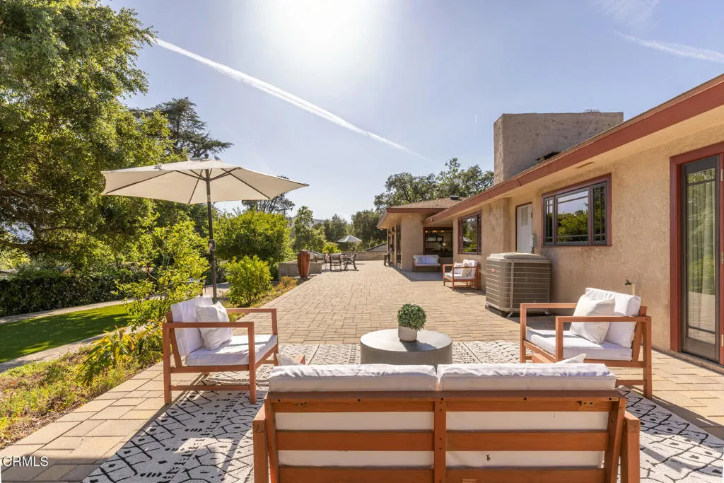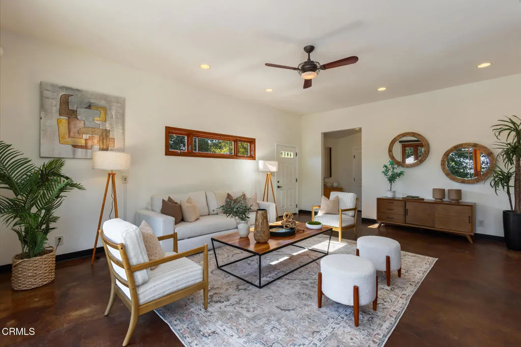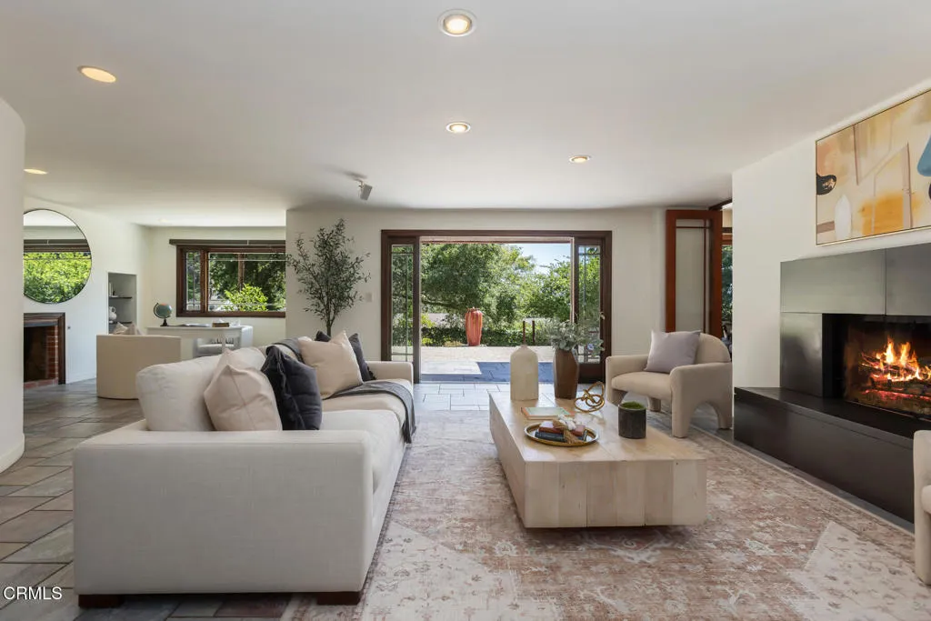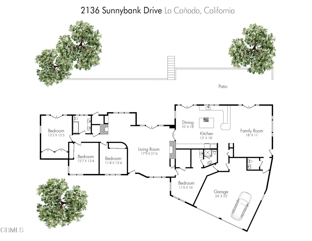 Filled with natural light and mid-century character, this sprawling Ranch style home offers a warm interior designed for comfortable living. Concrete floors and prairie-style windows create a subtle modern flair while honoring the home's architectural roots. Inside, the living room welcomes you with a fireplace, cozy reading nook with an additional fireplace, and French doors that open to the backyard. At the center of the home, the open dining, kitchen, and family room combination creates an inviting space for everyday living and gathering. Abundant cabinetry and storage define the kitchen, complemented by an island with cooktop and wine fridge. Oversized French doors and expansive windows brighten the space while providing seamless access to the backyard. The primary bedroom is centrally located and offers convenient access to the living room, kitchen, and garage. A separate bedroom wing provides three additional spacious bedrooms and a shared bath. The expansive backyard is flat and versatile, offering multiple entertaining areas and ample space to add a swimming pool, ADU, or sports court. Additional highlights include incorporation into the award winning La Canada School District beginning in the 2026-2027 school year, a wide lot with 118' frontage, newly installed pavers on semi-circular driveway & backyard areas, and an oversized 2-car garage with direct access into the home. Situated on a charming cul-de-sac and conveniently near Foothill Blvd., this inviting property presents a wonderful opportunity for its next owner.