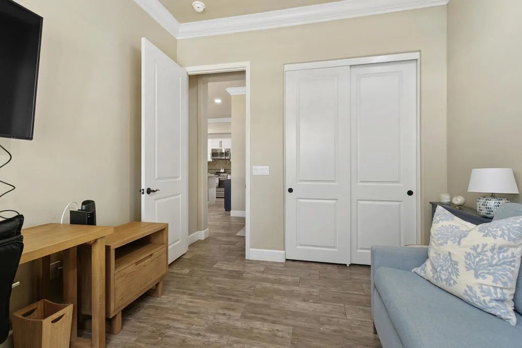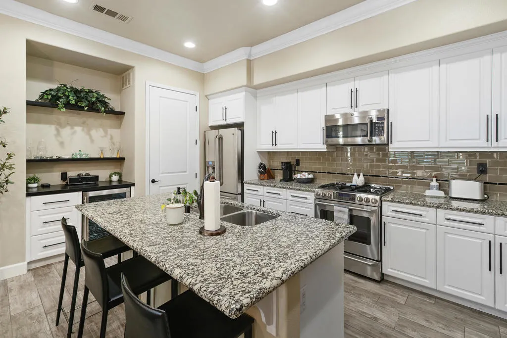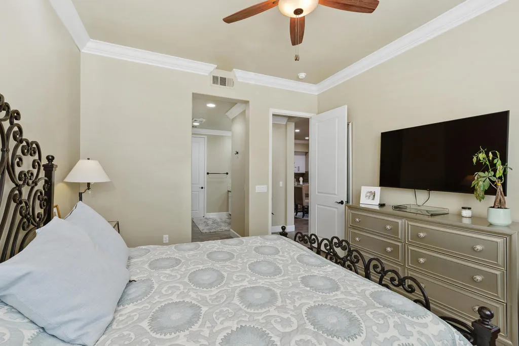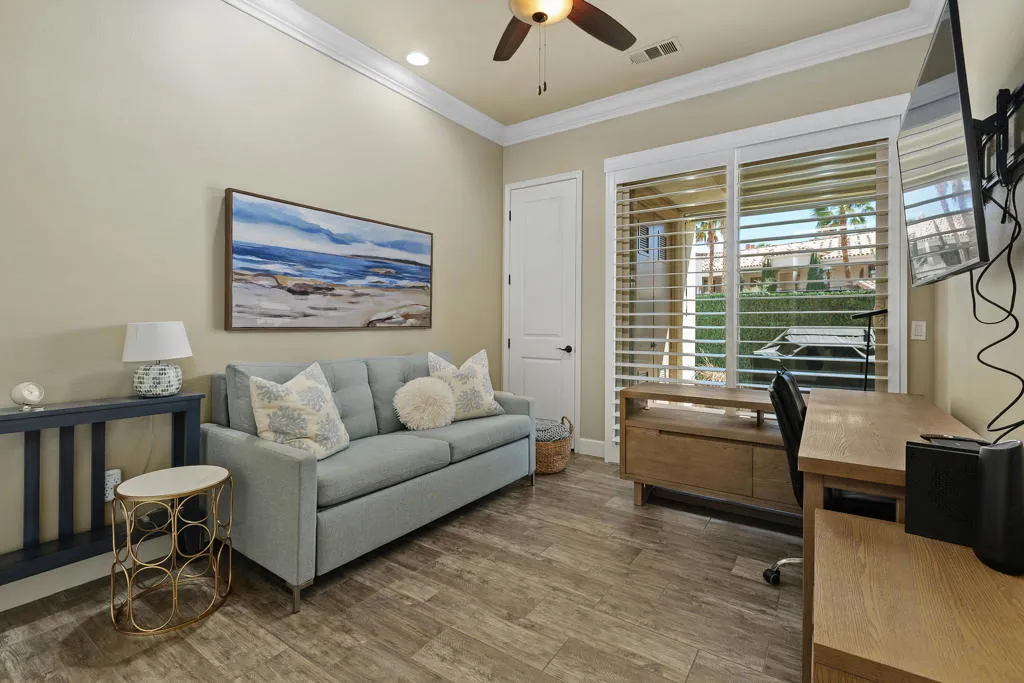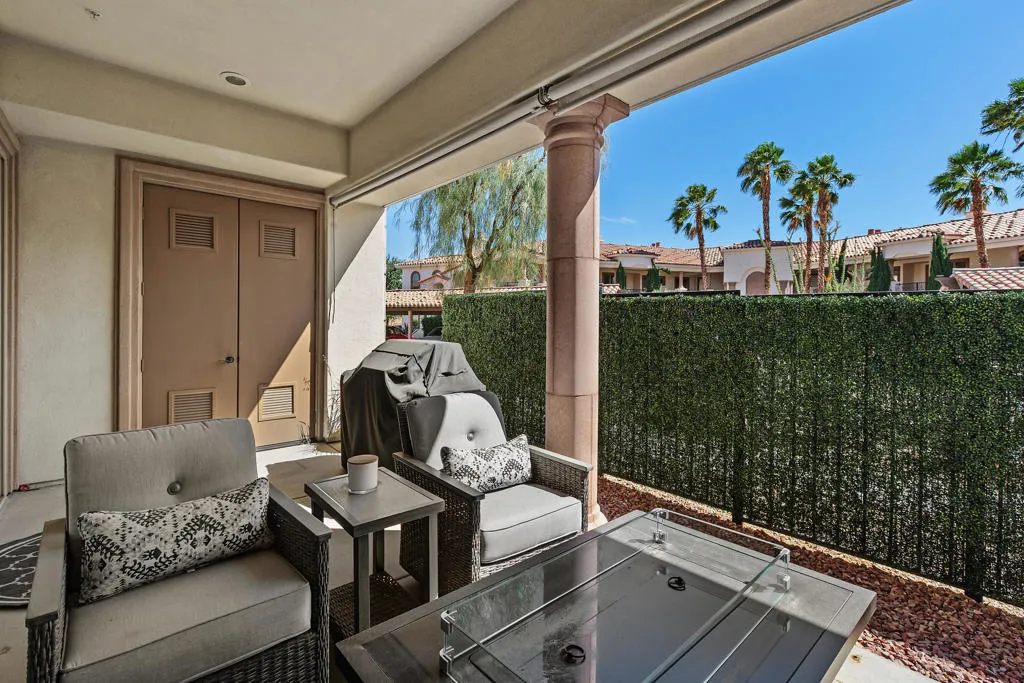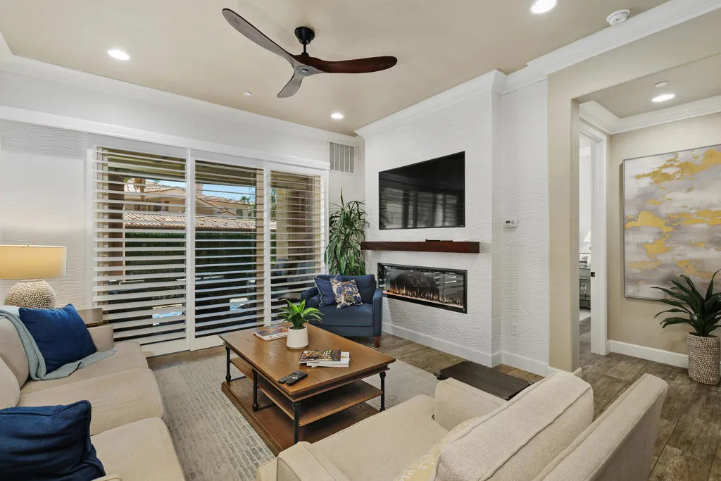 Welcome to Villa Portofino, Palm Desert's premier 55+ community! This ground-level, turnkey furnished home offers an open floor plan with soaring ceilings, abundant natural light, and a stylish floor-to-ceiling tiled fireplace. The gourmet kitchen features an island, granite countertops, stainless steel appliances, wine refrigerator, and custom cabinetry. The spacious primary suite includes dual vanities, a tiled walk-in shower, designer lighted mirror with built-in TV, and a large walk-in closet. Enjoy a private patio with fire table, BBQ, ceiling fan, and electric shades.Additional highlights include DIRECT PRIVATE GARAGE ACCESS through the laundry room, plus a 2-car garage with EV charger, epoxy floors, and built-in storage. Plantation shutters, crown molding, and ceiling fans throughout add comfort and style. HOA includes water, internet, cable, earthquake insurance, and access to a 30,000 sq. ft. clubhouse with resort-style pool, fitness center, restaurants, theater, and more. Ideally located near El Paseo Shopping District, dining, and medical facilities.Move-in ready and designed for easy, resort-style living, schedule your private showing today!