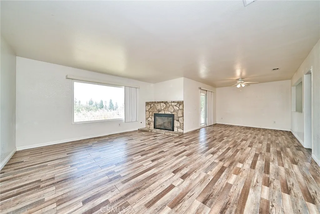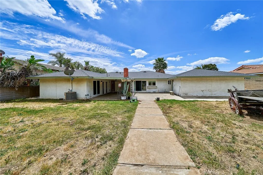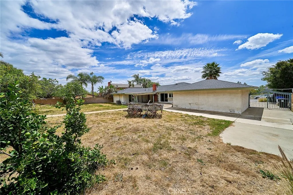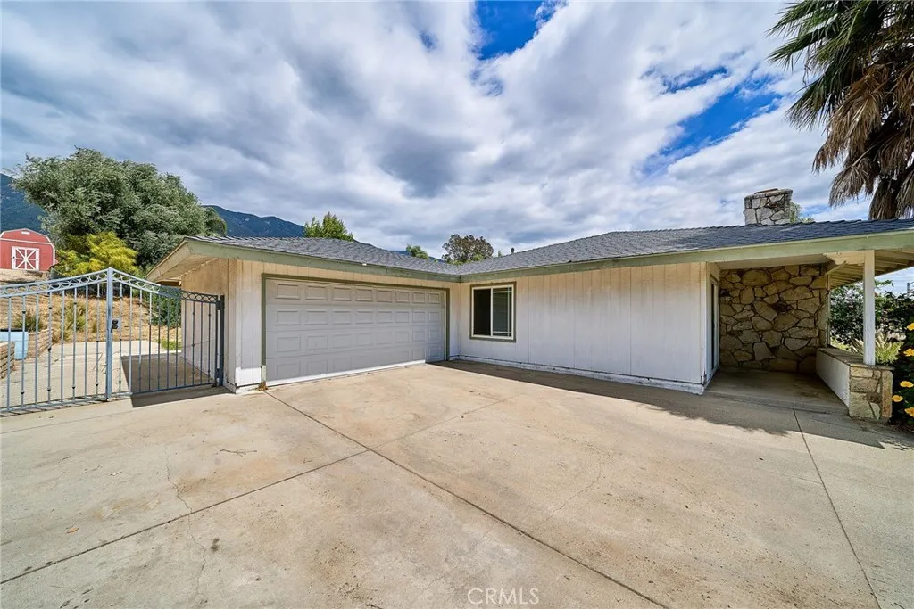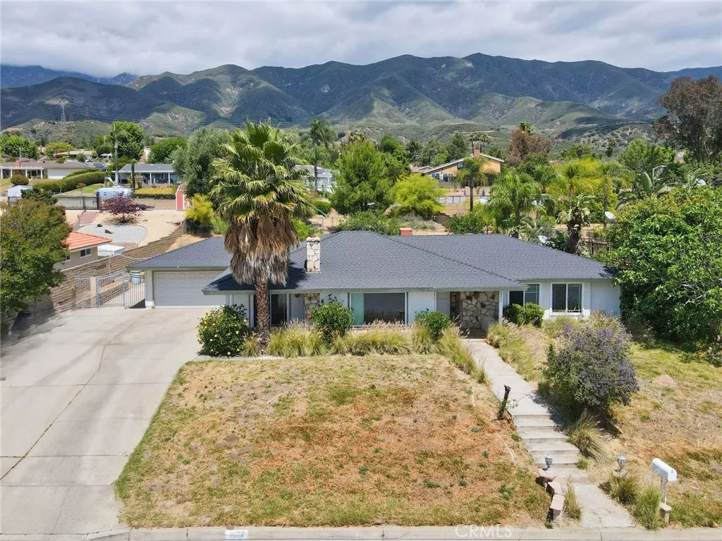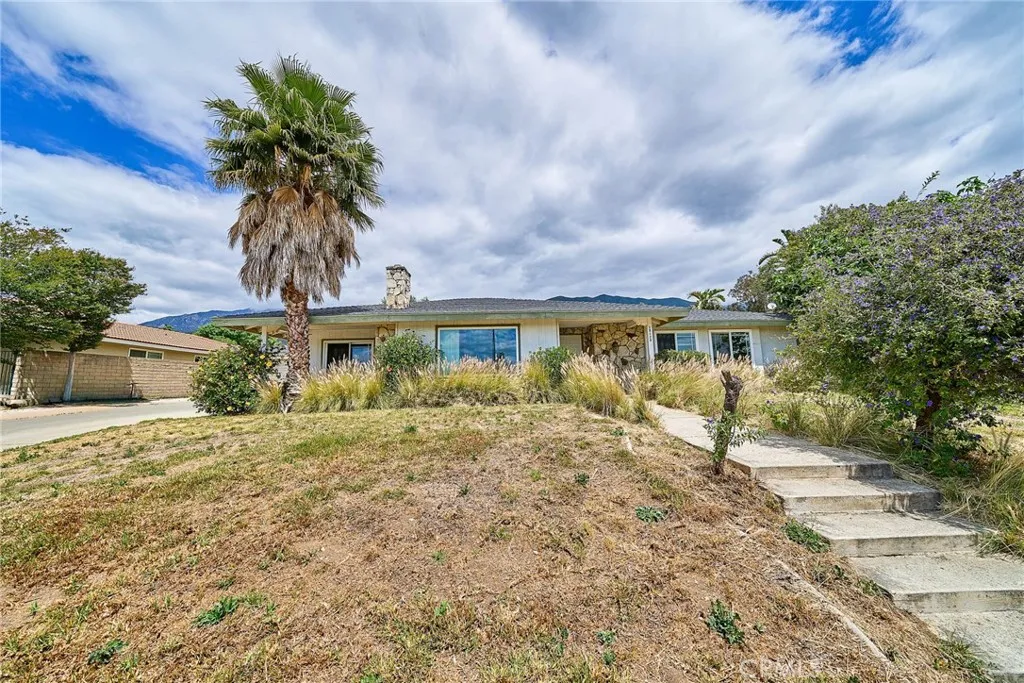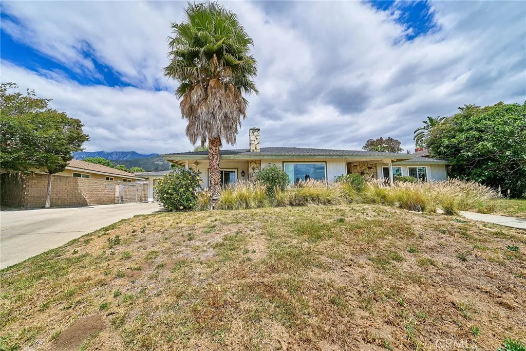 This sprawling single-story ranch-style home in Alta Loma is zoned for horses and offers 2,095 square feet of living space, featuring 4 bedrooms and 2 bathrooms. The entryway and living room showcase gleaming wood flooring, while two cozy fireplaces add warmth and charm to both the living and family rooms. The kitchen features beautiful cabinetry, granite countertops, newer fixtures, and a convenient pantry with pull-out shelves. A separate breakfast area and formal dining room—complete with sliding glass doors to a private front patio—provide multiple spaces for dining and entertaining. All four bedrooms are generously sized with laminate floor. The primary suite includes a ¾ bath, dual closets, and sliding glass doors that open to the covered patio. The full secondary bathroom also offers direct outdoor access, ideal for guests or outdoor use. Step outside to enjoy the covered patio, mountain views, mature fruit trees, and grapevines. The expansive lot offers endless possibilities, including space for a pool, sports court, or additional outdoor amenities. A wide side gate provides easy backyard access and potential for RV parking. Located across from Heritage Park, this home also features attractive stone accents, fresh interior paint, and direct access to a bridle trail at the rear of the property—perfect for equestrian enthusiasts