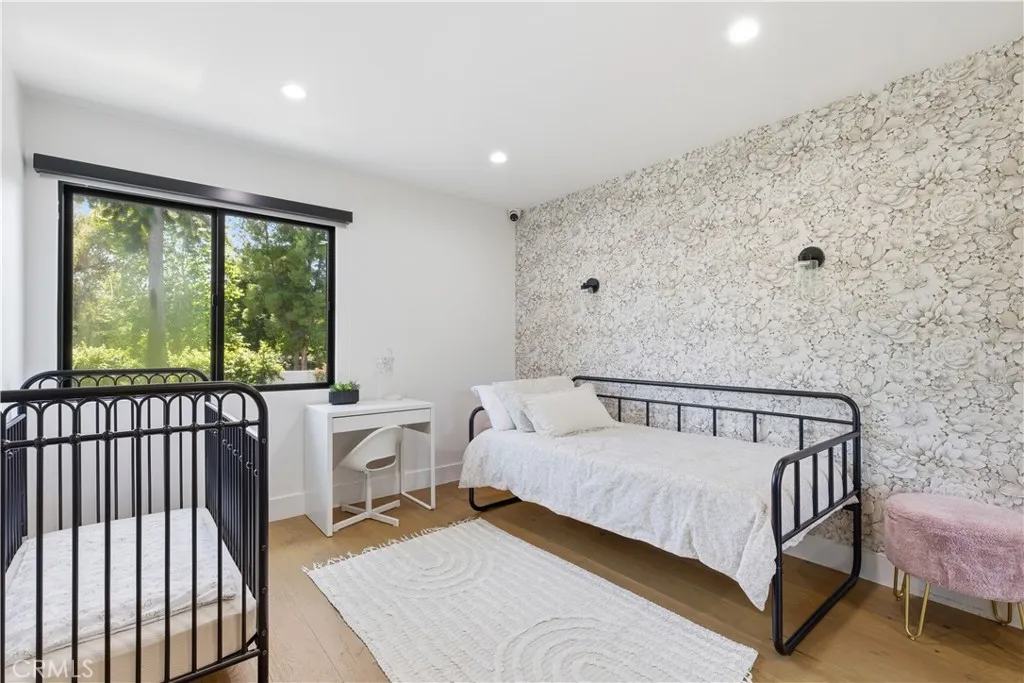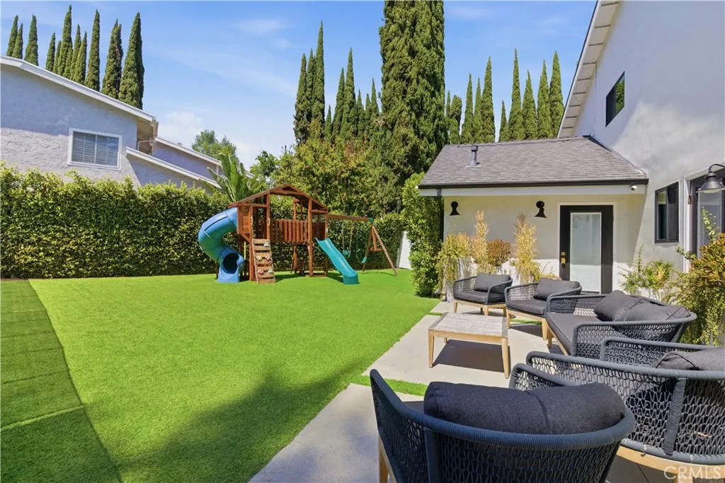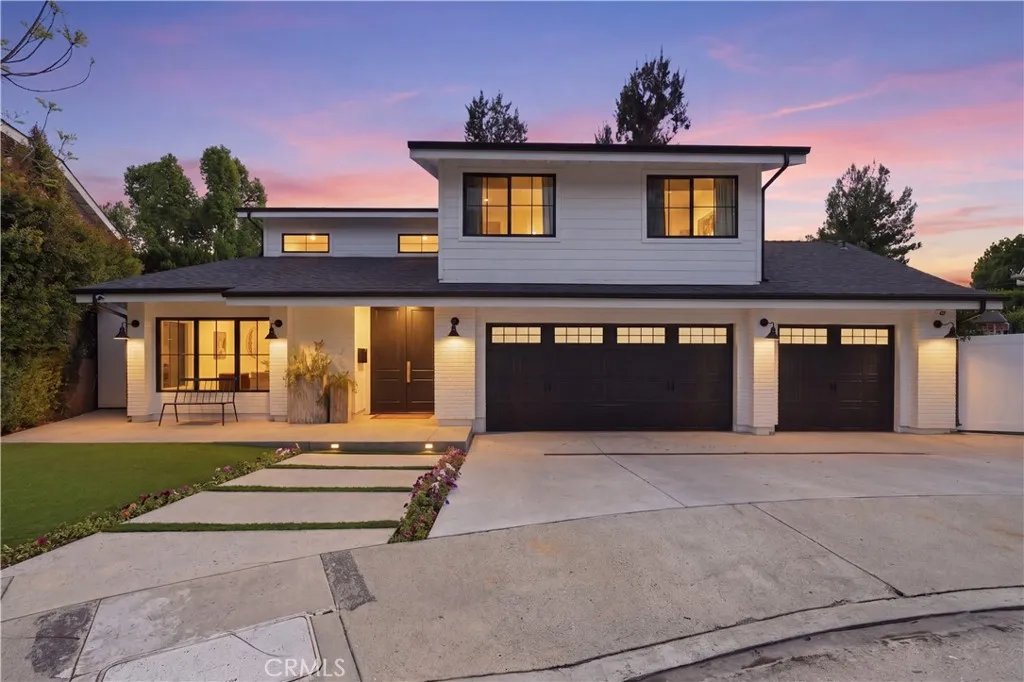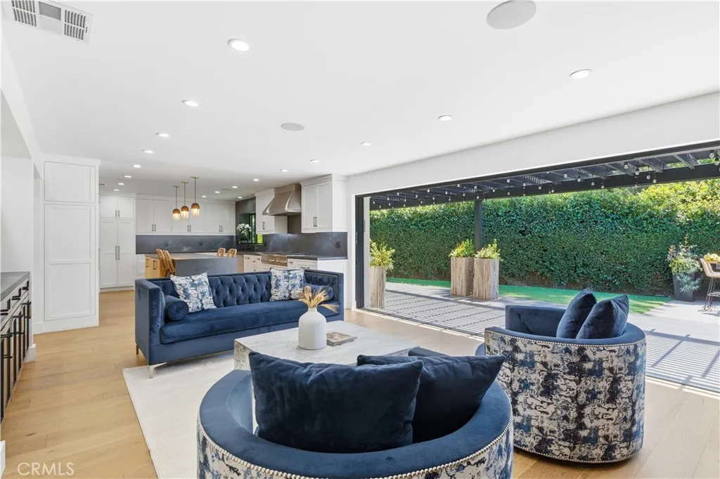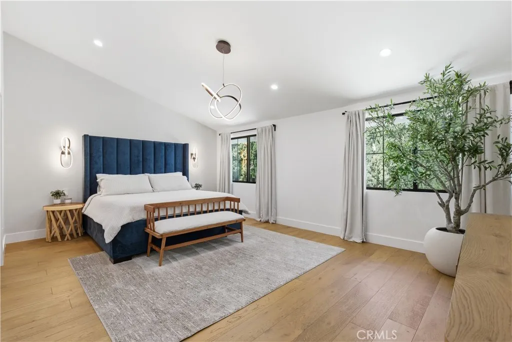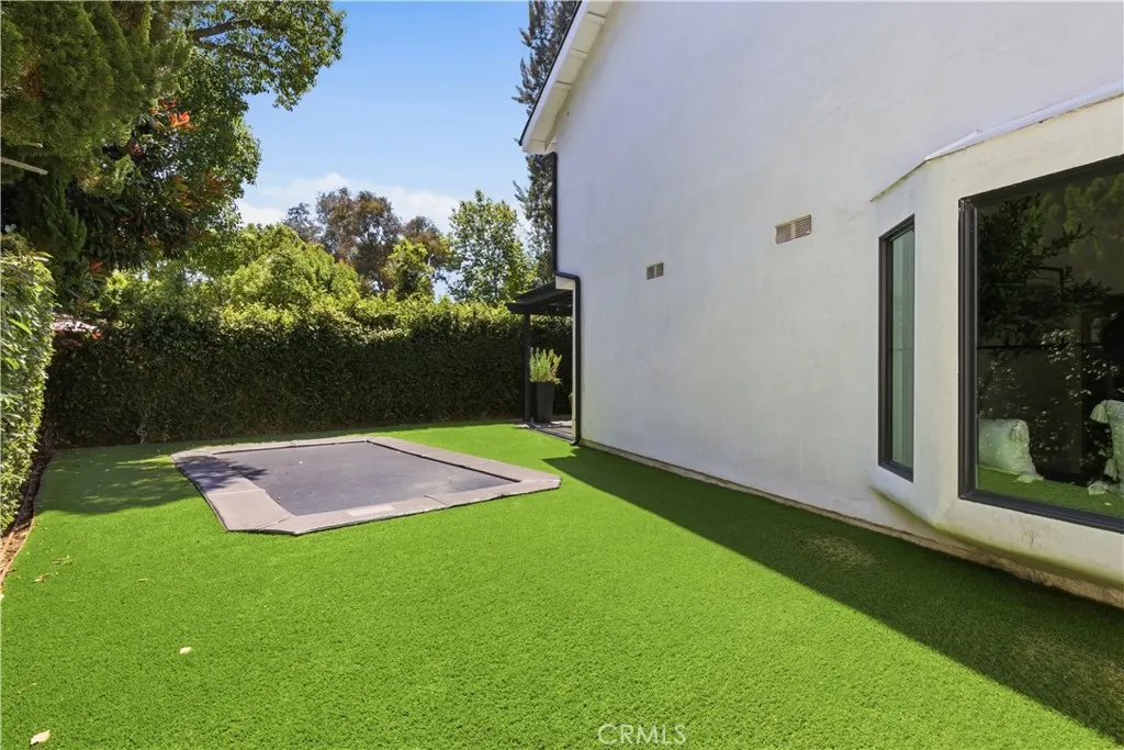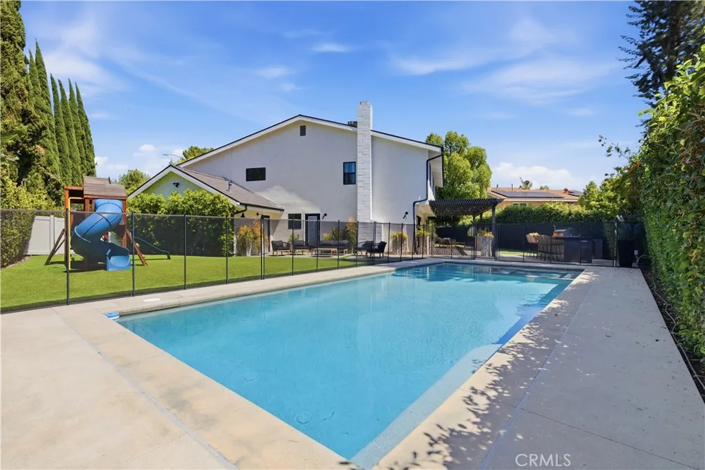 Tucked away on a private cul-de-sac in the heart of Sherman Oaks, this stunning, newly reimagined residence offers the perfect blend of modern luxury and effortless California living. Spanning over 3,000 square feet plus an additional 700 sqft of bonus space, on an expansive nearly 9,000 square foot lot, this 6-bedroom, 4-bathroom home is thoughtfully designed with exceptional attention to detail and style. A striking curb appeal welcomes you with clean architectural lines, and manicured landscaping. Inside, soaring ceilings and wide-plank wood floors set the tone for the light-filled, open-concept layout. The formal dining area flows seamlessly into the living spaces, highlighted by designer lighting and a dramatic staircase. The stunning kitchen is a true centerpiece, featuring custom cabinetry, sleek stone countertops, high-end stainless steel appliances, and an oversized island perfect for gathering. The home offers incredible versatility with three bonus rooms—ideal for a home office, gym, media room, or playroom—allowing you to tailor the space to your lifestyle. A glass enclosed wine display adds a sophisticated touch, while multiple living areas provide both comfort and functionality. Upstairs, spacious bedrooms include a luxurious primary suite retreat with a spa-inspired bathroom, soaking tub, dual vanities, and generous walk-in closet. Each additional bedroom is well-appointed with ample natural light and modern finishes. Step outside to your private park and luxurious oasis, designed for both relaxation and fun. Enjoy seamless indoor-outdoor living with large sliding doors opening to a covered patio, outdoor lounge, and built-in BBQ area. The sparkling pool and spa are complemented by lush greenery, a dedicated play area, in ground trampoline and plenty of space to host family and friends. Located in a prime Sherman Oaks neighborhood, this exceptional property combines privacy, scale, and sophistication—offering a rare opportunity to experience elevated living in one of the Valley’s most desirable settings.