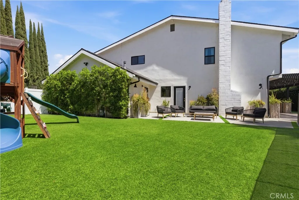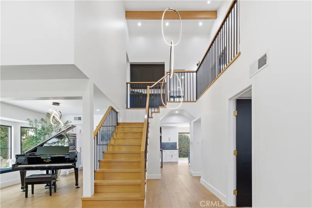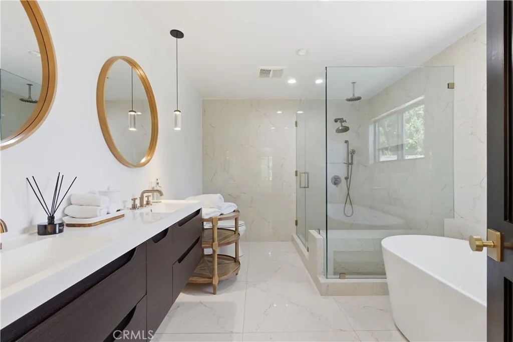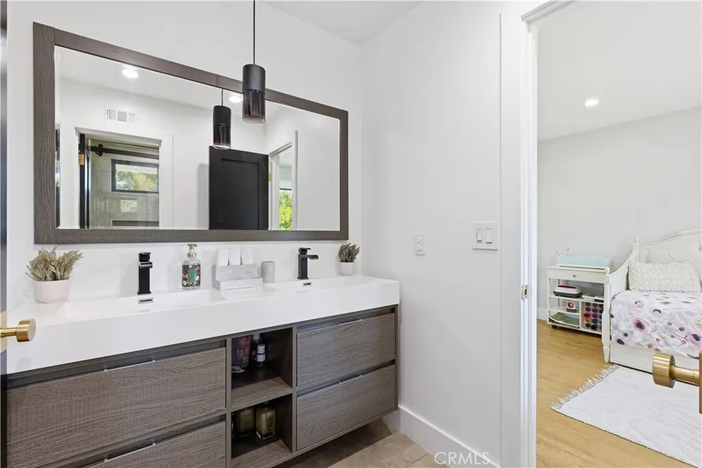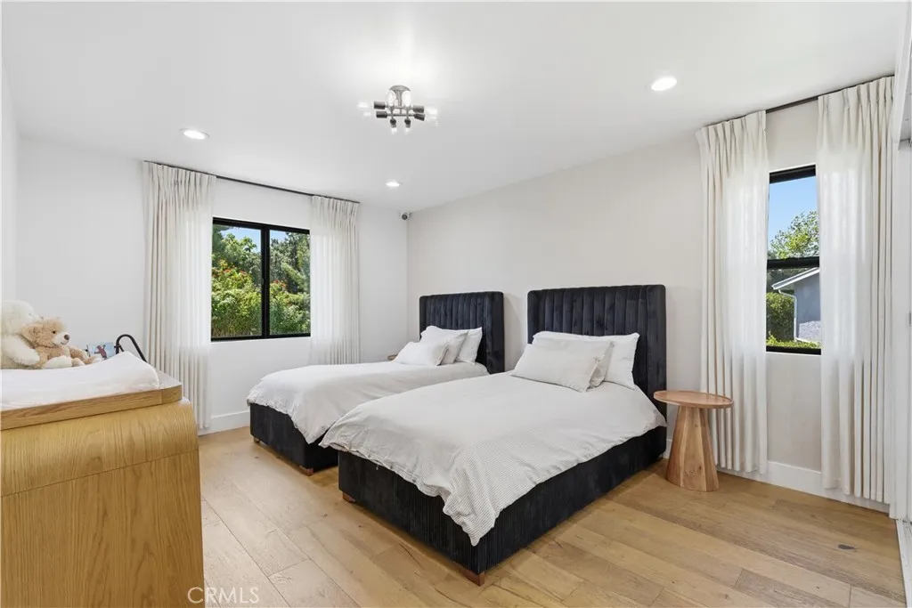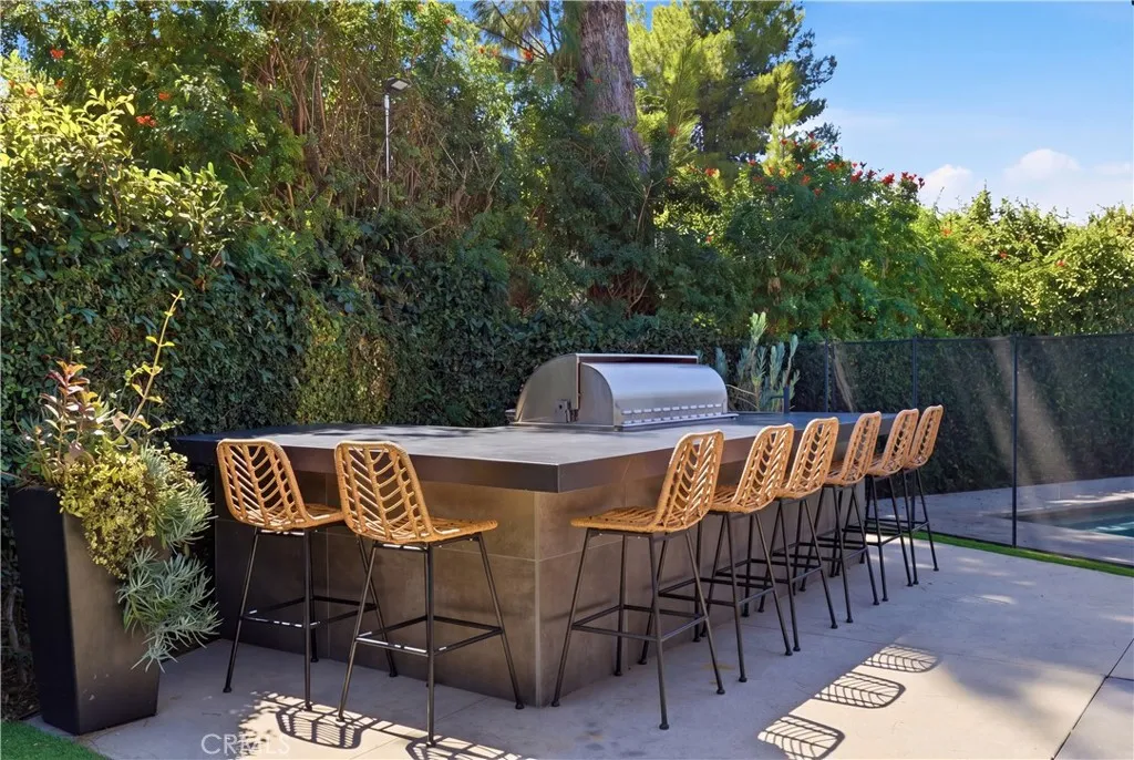 Tucked away on a private cul-de-sac in the heart of Sherman Oaks, this stunning, newly reimagined residence offers the perfect blend of modern luxury and effortless California living. Spanning over 3,000 square feet plus an additional 700 sqft of bonus space, on an expansive nearly 9,000 square foot lot, this 6-bedroom, 4-bathroom home is thoughtfully designed with exceptional attention to detail and style. A striking curb appeal welcomes you with clean architectural lines, and manicured landscaping. Inside, soaring ceilings and wide-plank wood floors set the tone for the light-filled, open-concept layout. The formal dining area flows seamlessly into the living spaces, highlighted by designer lighting and a dramatic staircase. The stunning kitchen is a true centerpiece, featuring custom cabinetry, sleek stone countertops, high-end stainless steel appliances, and an oversized island perfect for gathering. The home offers incredible versatility with three bonus rooms—ideal for a home office, gym, media room, or playroom—allowing you to tailor the space to your lifestyle. A glass enclosed wine display adds a sophisticated touch, while multiple living areas provide both comfort and functionality. Upstairs, spacious bedrooms include a luxurious primary suite retreat with a spa-inspired bathroom, soaking tub, dual vanities, and generous walk-in closet. Each additional bedroom is well-appointed with ample natural light and modern finishes. Step outside to your private park and luxurious oasis, designed for both relaxation and fun. Enjoy seamless indoor-outdoor living with large sliding doors opening to a covered patio, outdoor lounge, and built-in BBQ area. The sparkling pool and spa are complemented by lush greenery, a dedicated play area, in ground trampoline and plenty of space to host family and friends. Located in a prime Sherman Oaks neighborhood, this exceptional property combines privacy, scale, and sophistication—offering a rare opportunity to experience elevated living in one of the Valley’s most desirable settings.
