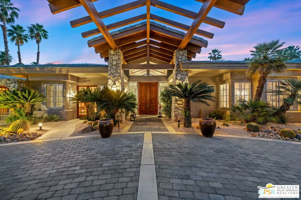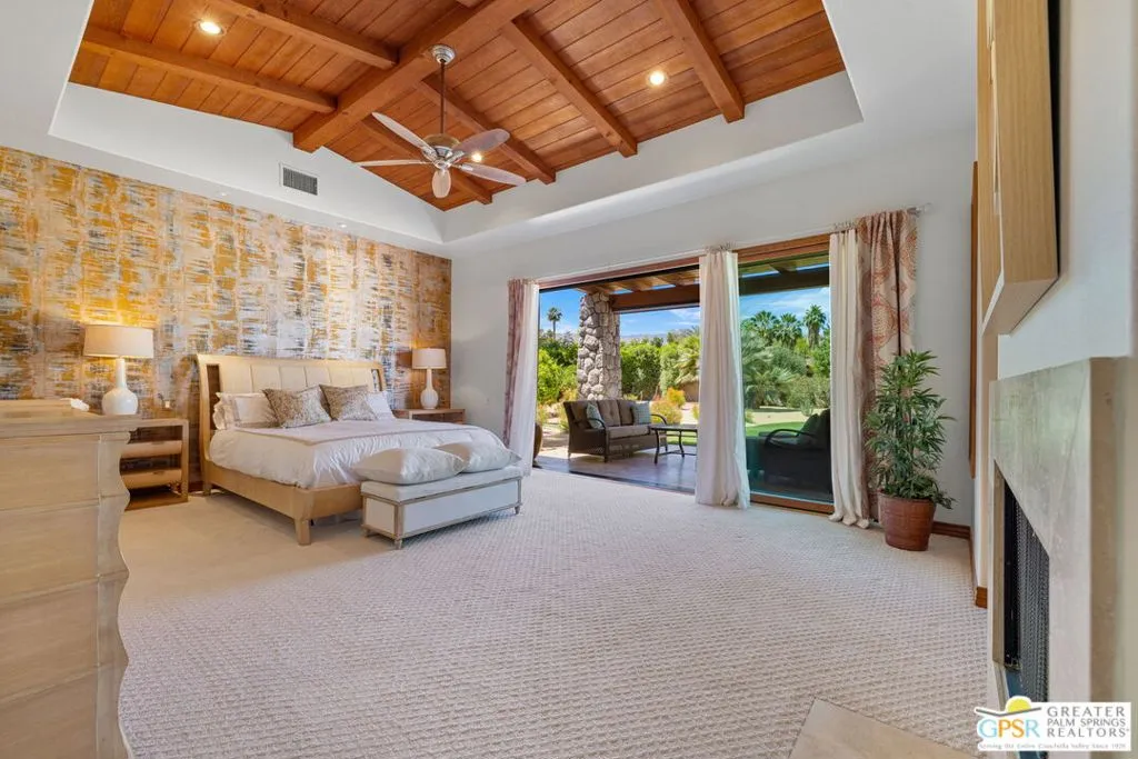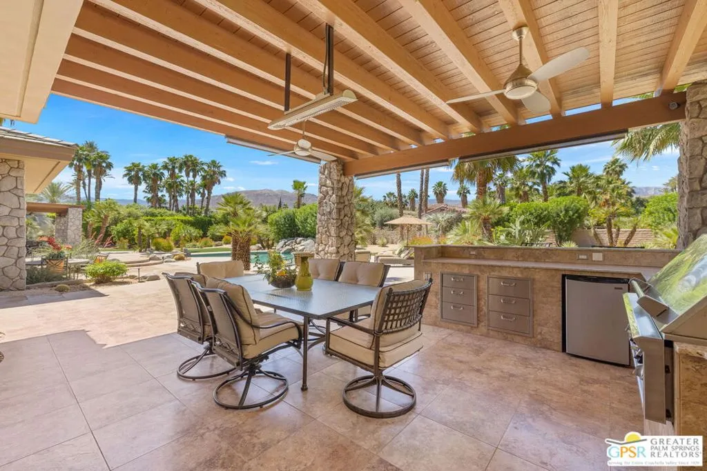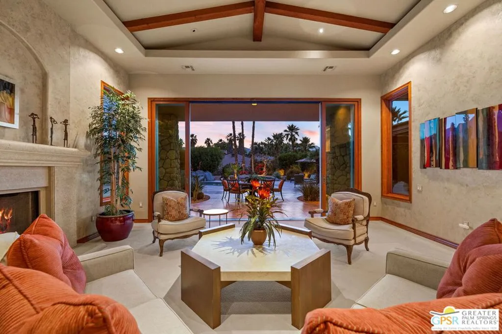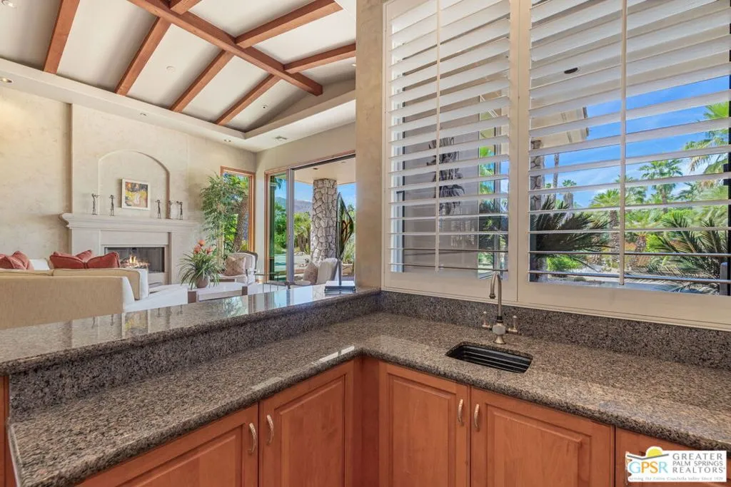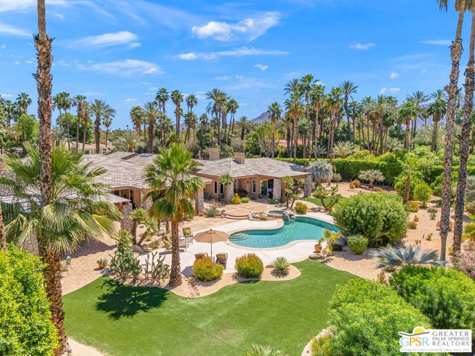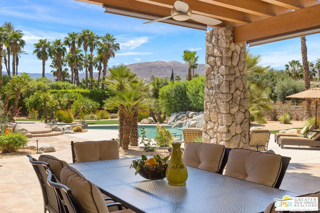 Set on a sprawling 1+ acre estate lot behind the gates of The Renaissance Rancho Mirage, this custom-designed residence offers nearly 6,000 square feet of refined desert living with privacy, scale, and mountain views, all just minutes from Clancy Lane's premier dining, shopping, and country clubs. A grand motor court with porte-cochere creates a striking arrival, leading to interiors defined by soaring vaulted ceilings, rich exposed wood beams, and walls of floor-to-ceiling glass that dissolve the boundary between indoors and out, filling the home with natural light while framing views of Mt. San Jacinto. The expansive great room, anchored by a dramatic stacked-stone fireplace and accented with exposed beams, offers signature views and a built-in wet bar, flowing seamlessly into a formal dining room highlighted by a terracotta coffered ceiling - an ideal setting for entertaining. At the heart of the home, the chef's kitchen has been thoughtfully refined with a rebuilt island, updated cabinetry, premium stainless appliances, and sleek countertops, serving both formal and casual living spaces with ease. The Primary Suite is a true retreat, featuring a tray ceiling, fireplace, expanded walk-in closet, and a spa-like bath with direct access to the backyard. A separate office with private entrance adds flexibility. On the opposite side of the home, two additional ensuite bedrooms offer comfort and privacy, while a detached guest house provides a fourth private suite ideal for extended stays. Outdoors, the property unfolds as a private resort. A PebbleTec pool with rock waterfall and elevated spa anchors the grounds, complemented by multiple covered patios with wood-beamed ceilings, a fully equipped outdoor kitchen, and a custom fire pit lounge perfect for relaxed evenings and entertaining at scale. Mature landscaping, recent turf installation, and ongoing enhancements create a lush, welcoming setting.Updated systems and on-demand hot water further enhance efficiency and performance. A rare opportunity to own a well-maintained estate property offering space, privacy, and exceptional value in one of Rancho Mirage's most exclusive communities.