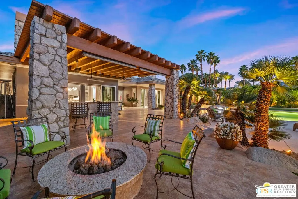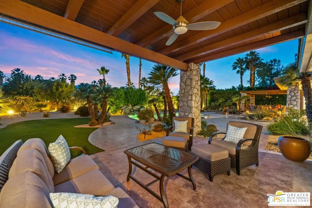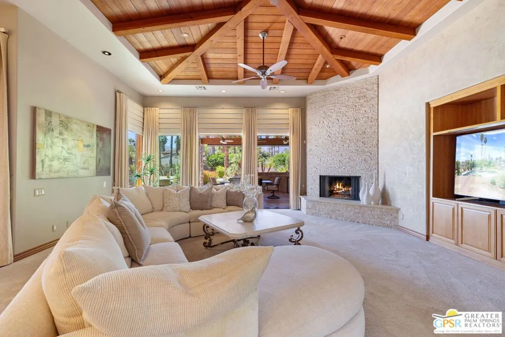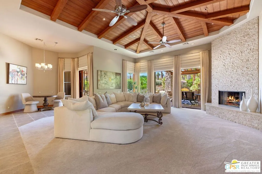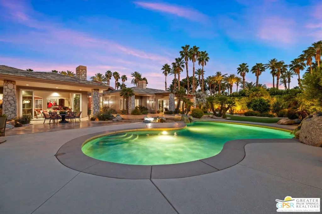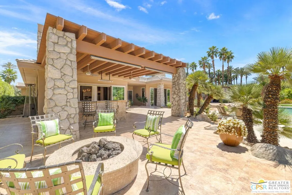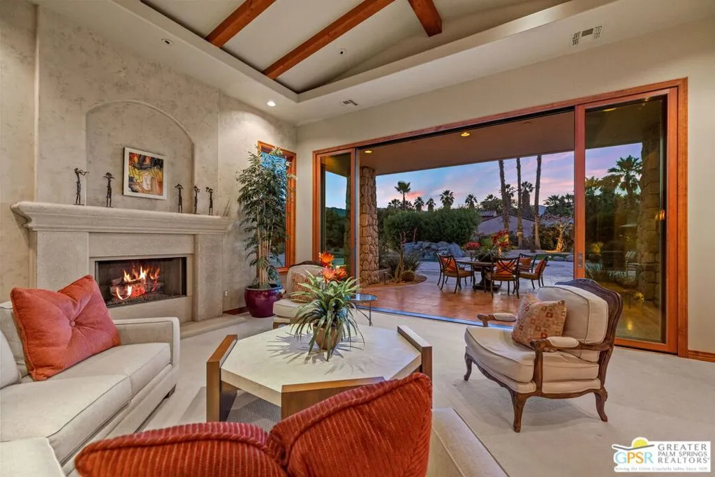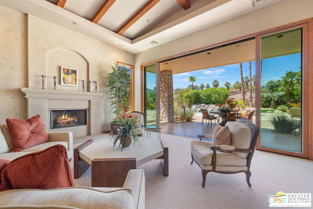 Set on a sprawling 1+ acre estate lot behind the gates of The Renaissance Rancho Mirage, this custom-designed residence offers nearly 6,000 square feet of refined desert living with privacy, scale, and mountain views, all just minutes from Clancy Lane's premier dining, shopping, and country clubs. A grand motor court with porte-cochere creates a striking arrival, leading to interiors defined by soaring vaulted ceilings, rich exposed wood beams, and walls of floor-to-ceiling glass that dissolve the boundary between indoors and out, filling the home with natural light while framing views of Mt. San Jacinto. The expansive great room, anchored by a dramatic stacked-stone fireplace and accented with exposed beams, offers signature views and a built-in wet bar, flowing seamlessly into a formal dining room highlighted by a terracotta coffered ceiling - an ideal setting for entertaining. At the heart of the home, the chef's kitchen has been thoughtfully refined with a rebuilt island, updated cabinetry, premium stainless appliances, and sleek countertops, serving both formal and casual living spaces with ease. The Primary Suite is a true retreat, featuring a tray ceiling, fireplace, expanded walk-in closet, and a spa-like bath with direct access to the backyard. A separate office with private entrance adds flexibility. On the opposite side of the home, two additional ensuite bedrooms offer comfort and privacy, while a detached guest house provides a fourth private suite ideal for extended stays. Outdoors, the property unfolds as a private resort. A PebbleTec pool with rock waterfall and elevated spa anchors the grounds, complemented by multiple covered patios with wood-beamed ceilings, a fully equipped outdoor kitchen, and a custom fire pit lounge perfect for relaxed evenings and entertaining at scale. Mature landscaping, recent turf installation, and ongoing enhancements create a lush, welcoming setting.Updated systems and on-demand hot water further enhance efficiency and performance. A rare opportunity to own a well-maintained estate property offering space, privacy, and exceptional value in one of Rancho Mirage's most exclusive communities.