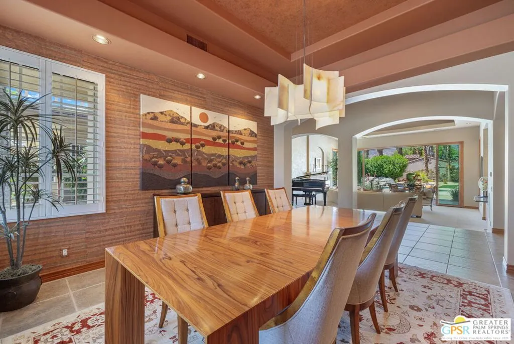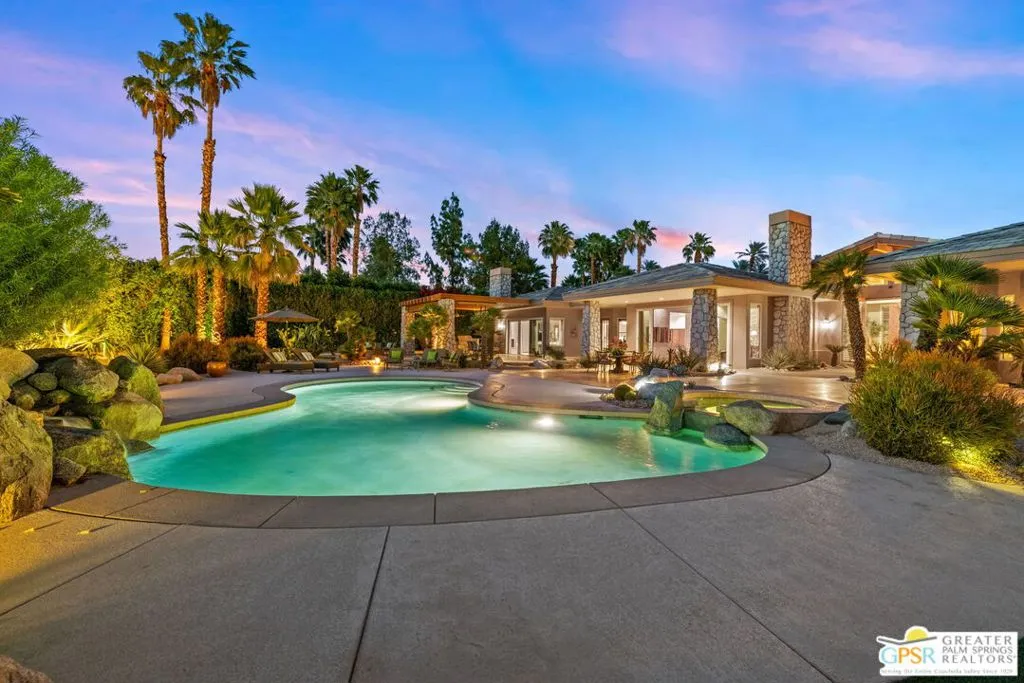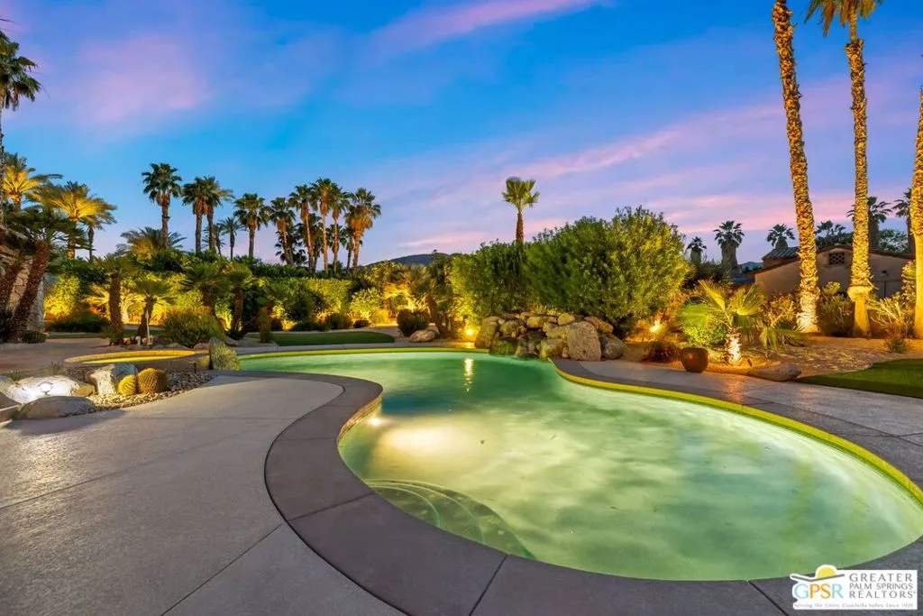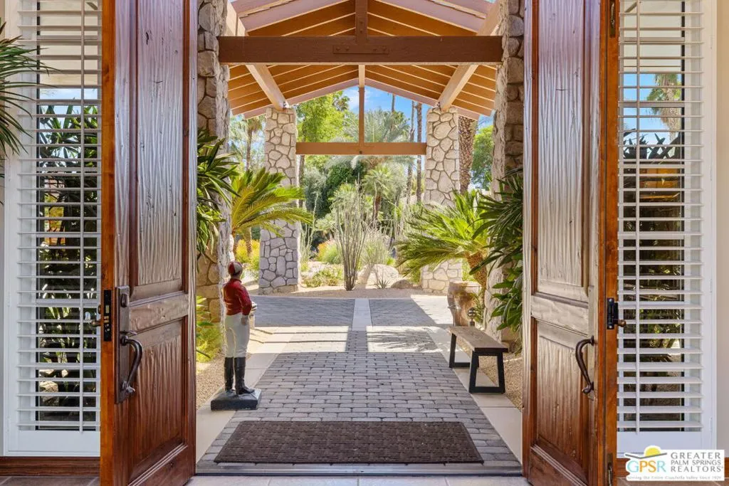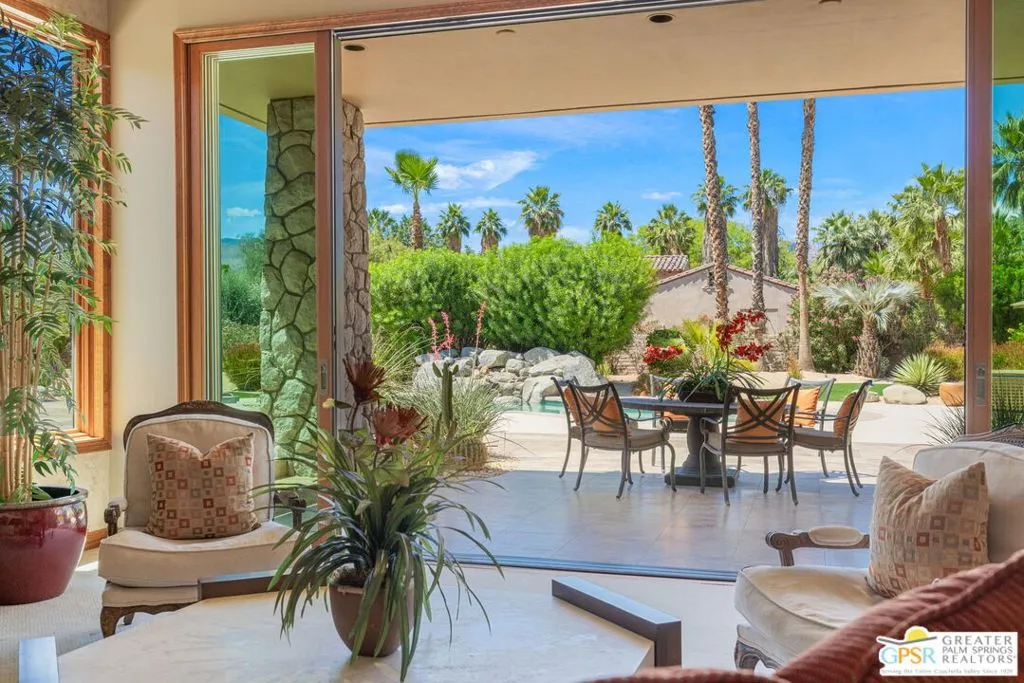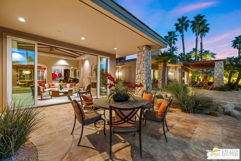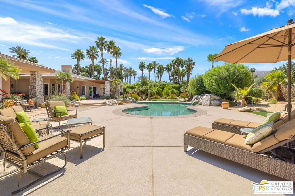 Set on a sprawling 1+ acre estate lot behind the gates of The Renaissance Rancho Mirage, this custom-designed residence offers nearly 6,000 square feet of refined desert living with privacy, scale, and mountain views, all just minutes from Clancy Lane's premier dining, shopping, and country clubs. A grand motor court with porte-cochere creates a striking arrival, leading to interiors defined by soaring vaulted ceilings, rich exposed wood beams, and walls of floor-to-ceiling glass that dissolve the boundary between indoors and out, filling the home with natural light while framing views of Mt. San Jacinto. The expansive great room, anchored by a dramatic stacked-stone fireplace and accented with exposed beams, offers signature views and a built-in wet bar, flowing seamlessly into a formal dining room highlighted by a terracotta coffered ceiling - an ideal setting for entertaining. At the heart of the home, the chef's kitchen has been thoughtfully refined with a rebuilt island, updated cabinetry, premium stainless appliances, and sleek countertops, serving both formal and casual living spaces with ease. The Primary Suite is a true retreat, featuring a tray ceiling, fireplace, expanded walk-in closet, and a spa-like bath with direct access to the backyard. A separate office with private entrance adds flexibility. On the opposite side of the home, two additional ensuite bedrooms offer comfort and privacy, while a detached guest house provides a fourth private suite ideal for extended stays. Outdoors, the property unfolds as a private resort. A PebbleTec pool with rock waterfall and elevated spa anchors the grounds, complemented by multiple covered patios with wood-beamed ceilings, a fully equipped outdoor kitchen, and a custom fire pit lounge perfect for relaxed evenings and entertaining at scale. Mature landscaping, recent turf installation, and ongoing enhancements create a lush, welcoming setting.Updated systems and on-demand hot water further enhance efficiency and performance. A rare opportunity to own a well-maintained estate property offering space, privacy, and exceptional value in one of Rancho Mirage's most exclusive communities.