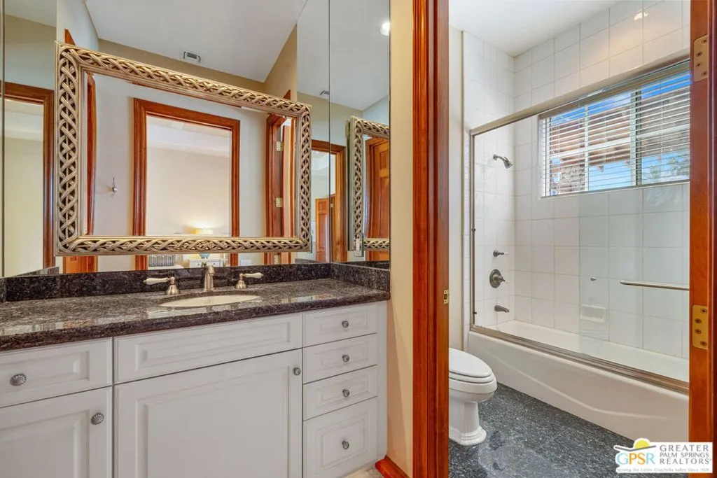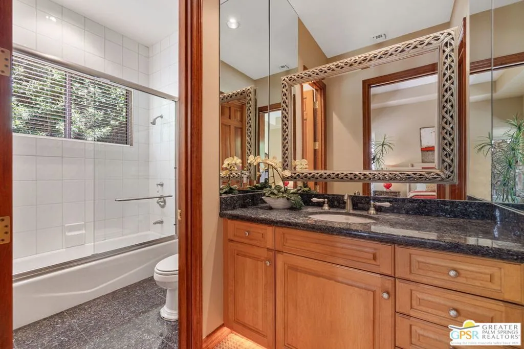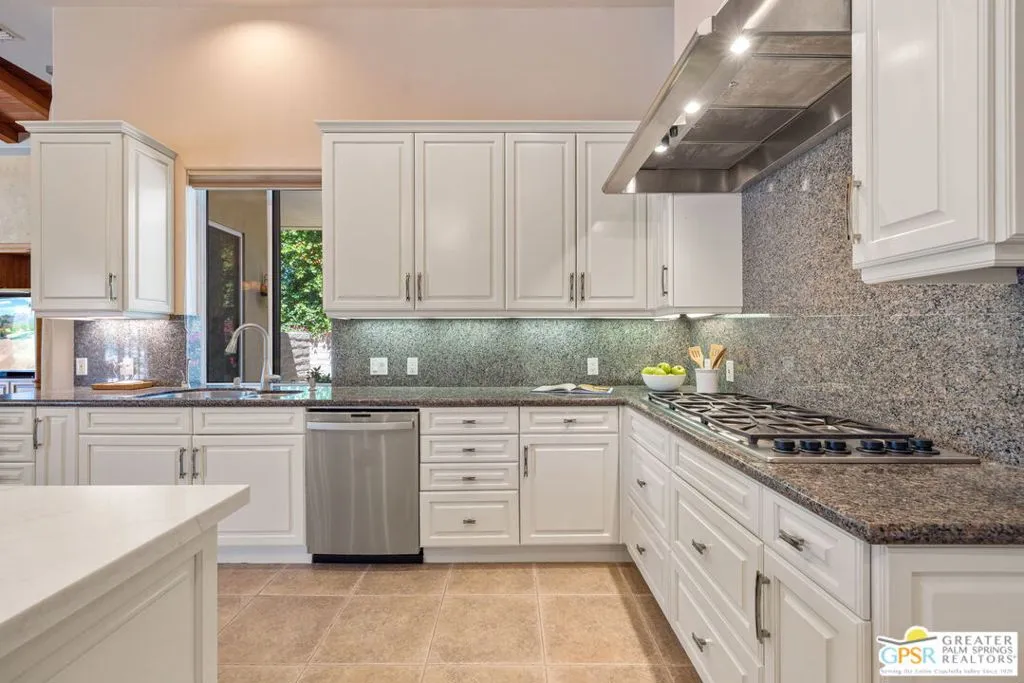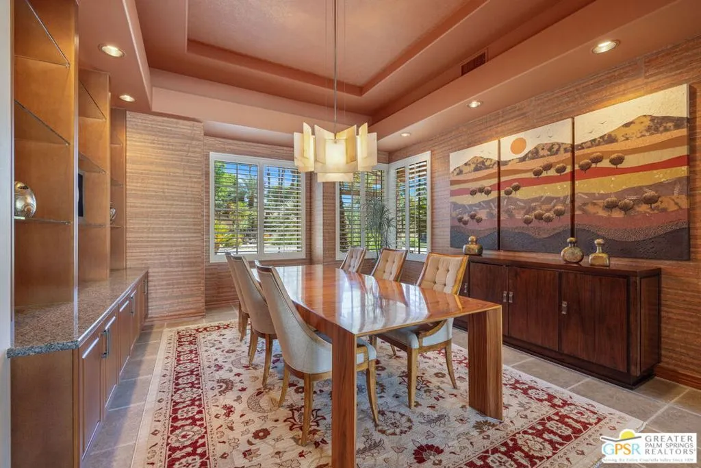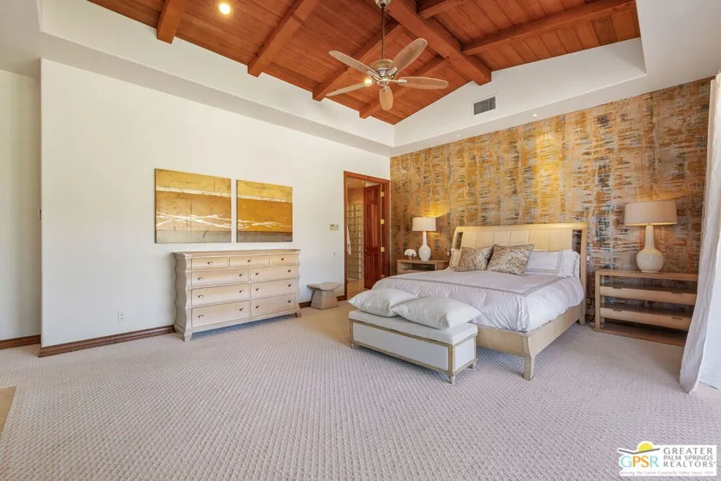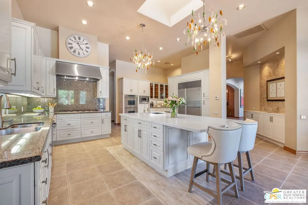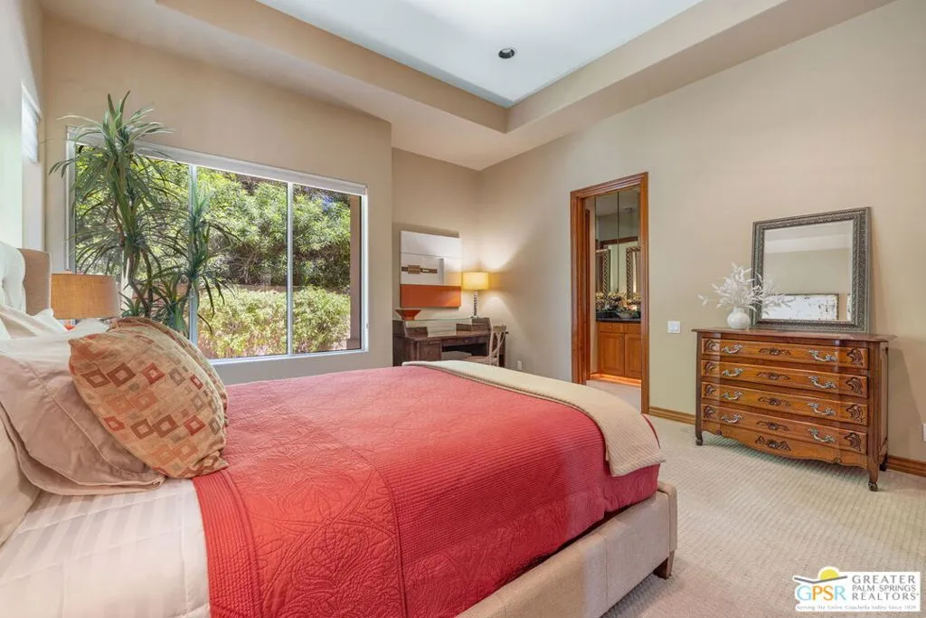 Set on a sprawling 1+ acre estate lot behind the gates of The Renaissance Rancho Mirage, this custom-designed residence offers nearly 6,000 square feet of refined desert living with privacy, scale, and mountain views, all just minutes from Clancy Lane's premier dining, shopping, and country clubs. A grand motor court with porte-cochere creates a striking arrival, leading to interiors defined by soaring vaulted ceilings, rich exposed wood beams, and walls of floor-to-ceiling glass that dissolve the boundary between indoors and out, filling the home with natural light while framing views of Mt. San Jacinto. The expansive great room, anchored by a dramatic stacked-stone fireplace and accented with exposed beams, offers signature views and a built-in wet bar, flowing seamlessly into a formal dining room highlighted by a terracotta coffered ceiling - an ideal setting for entertaining. At the heart of the home, the chef's kitchen has been thoughtfully refined with a rebuilt island, updated cabinetry, premium stainless appliances, and sleek countertops, serving both formal and casual living spaces with ease. The Primary Suite is a true retreat, featuring a tray ceiling, fireplace, expanded walk-in closet, and a spa-like bath with direct access to the backyard. A separate office with private entrance adds flexibility. On the opposite side of the home, two additional ensuite bedrooms offer comfort and privacy, while a detached guest house provides a fourth private suite ideal for extended stays. Outdoors, the property unfolds as a private resort. A PebbleTec pool with rock waterfall and elevated spa anchors the grounds, complemented by multiple covered patios with wood-beamed ceilings, a fully equipped outdoor kitchen, and a custom fire pit lounge perfect for relaxed evenings and entertaining at scale. Mature landscaping, recent turf installation, and ongoing enhancements create a lush, welcoming setting.Updated systems and on-demand hot water further enhance efficiency and performance. A rare opportunity to own a well-maintained estate property offering space, privacy, and exceptional value in one of Rancho Mirage's most exclusive communities.