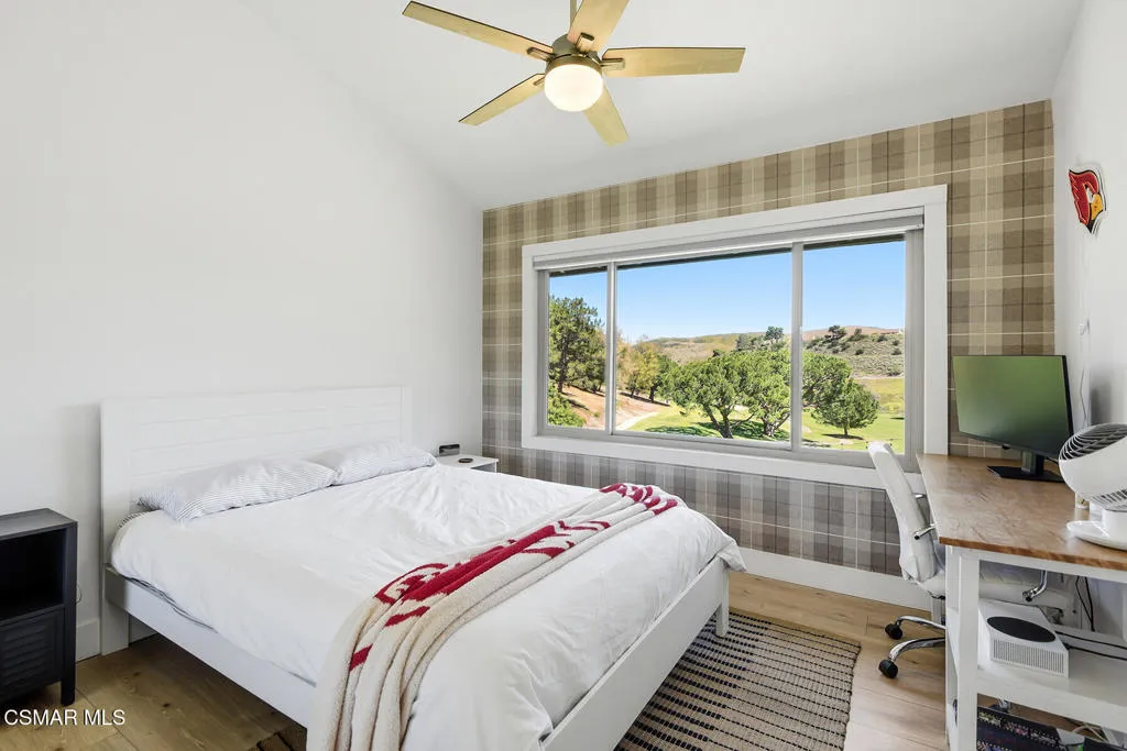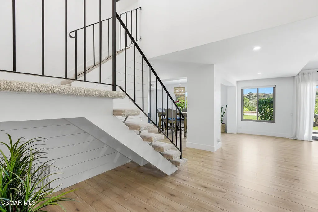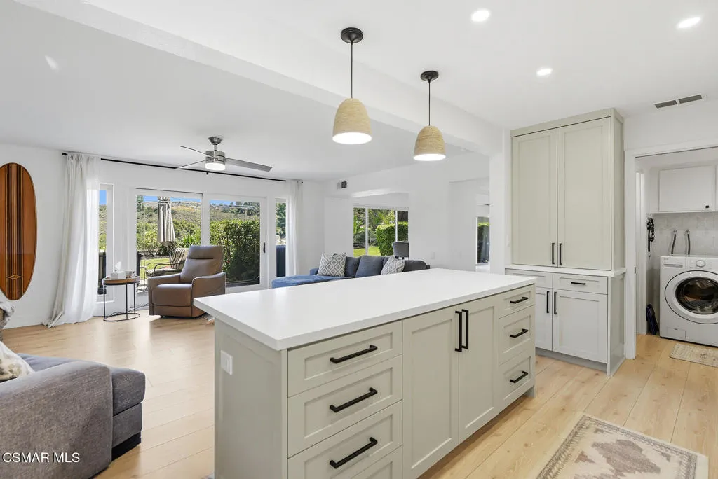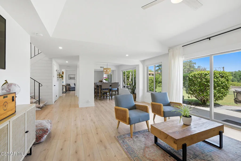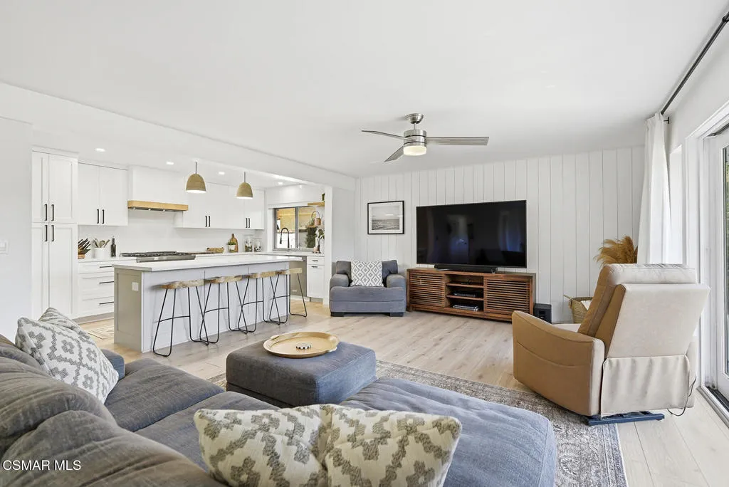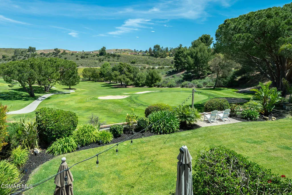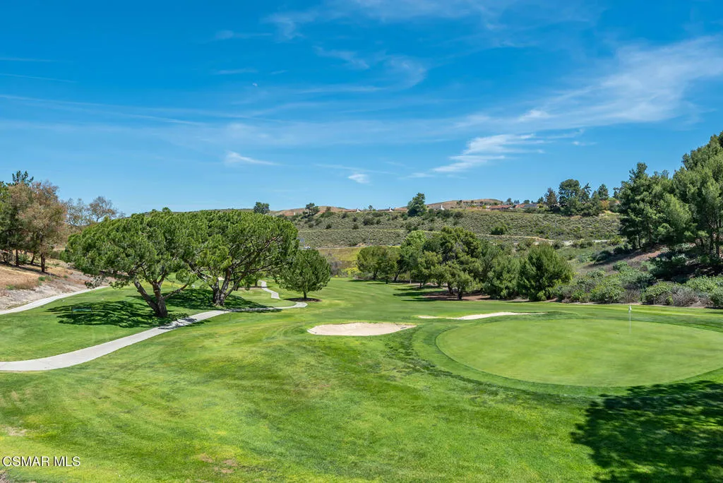 Welcome to 3922 Calle de Sol, located in the highly desirable Sunset Hills neighborhood of Thousand Oaks. This beautifully remodeled 4-bedroom, 3-bathroom home offers 2,615 sq ft of living space, an ideal open floor plan, and stunning golf course views overlooking the 16th hole of Sunset Hills Country Club. The light-filled interior features wide plank laminate flooring, recessed lighting, and a seamless flow between the main living spaces. The remodeled kitchen is thoughtfully designed with quartz countertops, custom cabinetry, stainless steel appliances, and a large island with bar seating, all opening to the living and dining areas, perfect for both everyday living and entertaining. Expansive windows and sliding doors showcase picturesque backyard views of the golf course and surrounding hills, creating a peaceful and private setting. The outdoor space is ideal for relaxing, hosting, and enjoying the scenic surroundings. The neighborhood also offers a private paseo with walking paths and additional scenic viewpoints, providing a true indoor-outdoor lifestyle right outside your door. A downstairs bedroom and full bathroom offer flexibility for guests or a home office. Upstairs, the spacious primary suite and additional bedrooms are complemented by remodeled bathrooms and beautiful views of the surrounding hills and golf course. Additional highlights include a 3-car garage, with one bay currently converted into a gym, and a prime location just moments from Sunset Hills Country Club, parks, shopping, dining, and award-winning schools. This turnkey home combines style, functionality, and an exceptional location in one of Thousand Oaks' most sought-after communities.