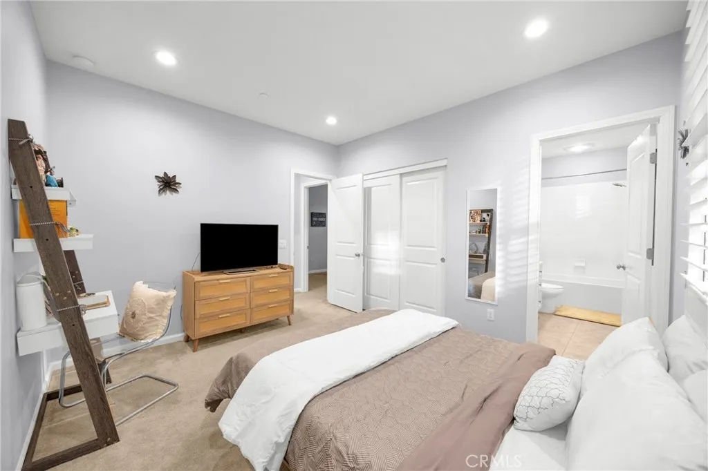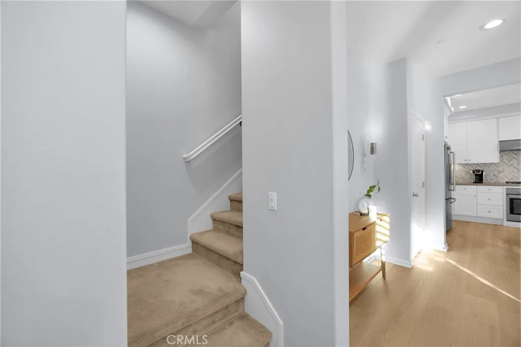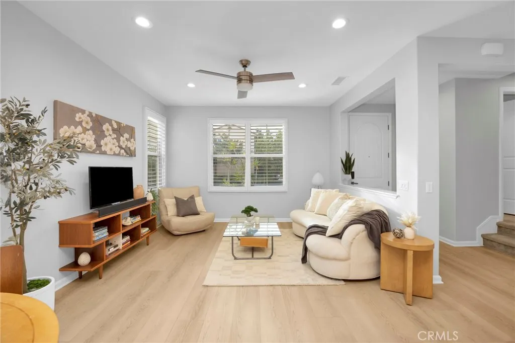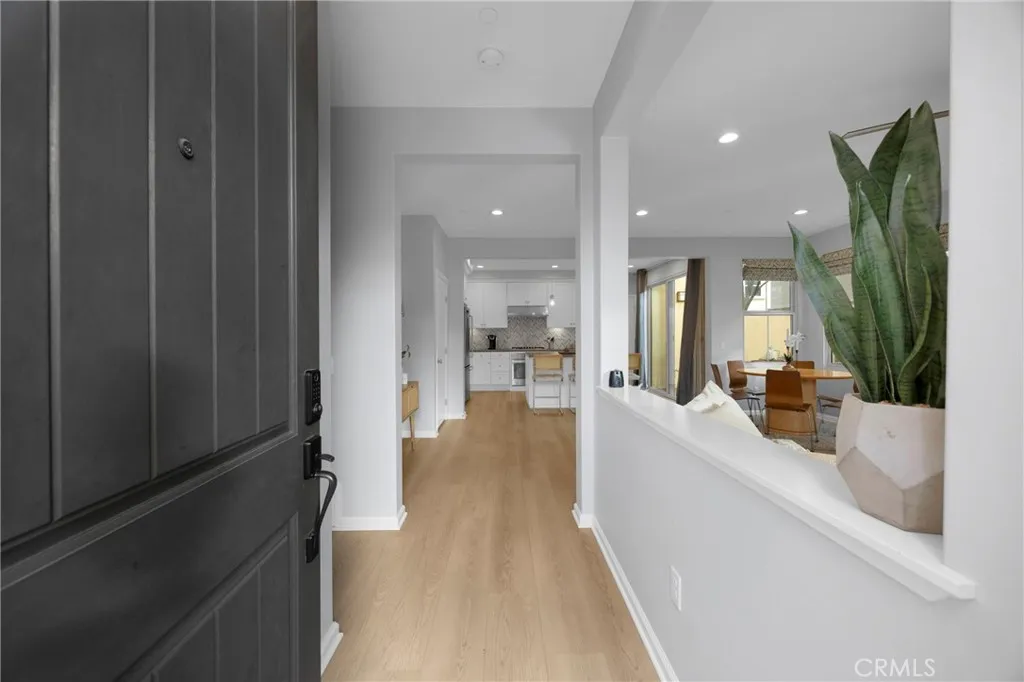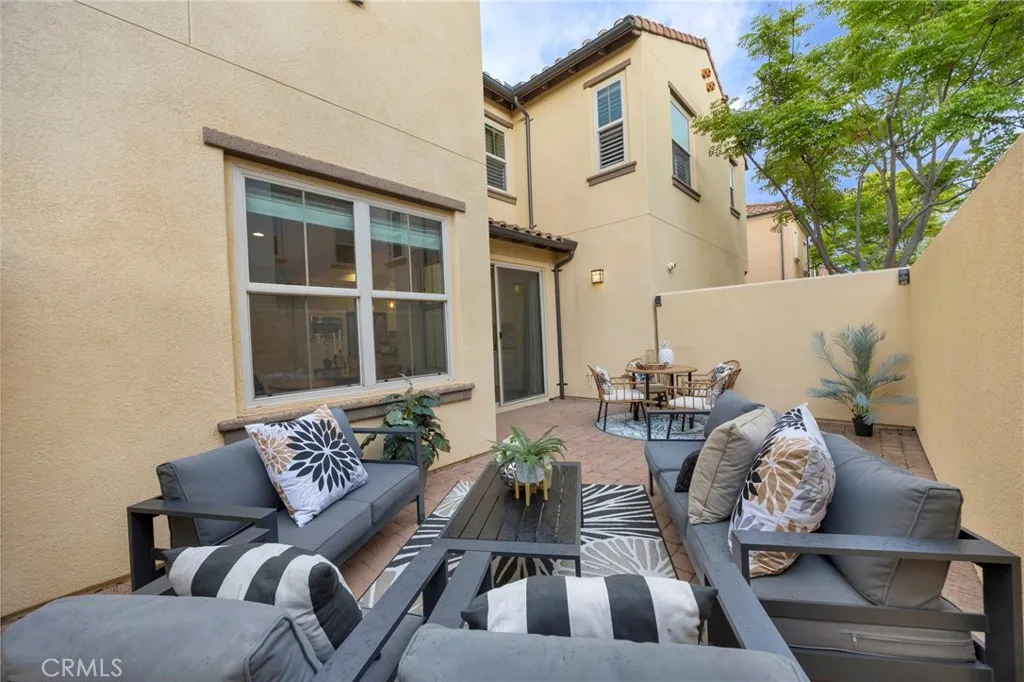 Corner, turnkey home in Portola Springs with an oversized private courtyard and one of the largest and most desirable floor plans in the community. Built in 2016, this 3-bedroom, 3.5-bath home includes a versatile upstairs loft and offers 1,778 sq ft of bright, open living space filled with natural light. The main level features vinyl flooring throughout, a spacious kitchen with a center island, quartz countertops, white shaker cabinetry, upgraded tile backsplash, stainless steel appliances, and seamless flow into the dining and living areas—ideal for everyday living and entertaining. Additional highlights include designer paint, custom window coverings, pendant lighting, recessed lighting throughout, and added insulation for enhanced comfort. Sliding doors from the kitchen create an easy indoor-outdoor connection to the oversized private courtyard, and a tucked-away half bath adds convenience on the first floor. Upstairs includes generously sized bedrooms, each with its own bathroom, along with the loft and an upstairs laundry room. The primary suite features a dual sink vanity, soaking tub, separate shower, and a walk-in closet. Positioned with only one attached wall, the home offers added privacy and abundant natural light throughout. Includes a 2-car attached garage with direct access. Located near top-rated Irvine schools, parks, pools, and Woodbury Town Center.