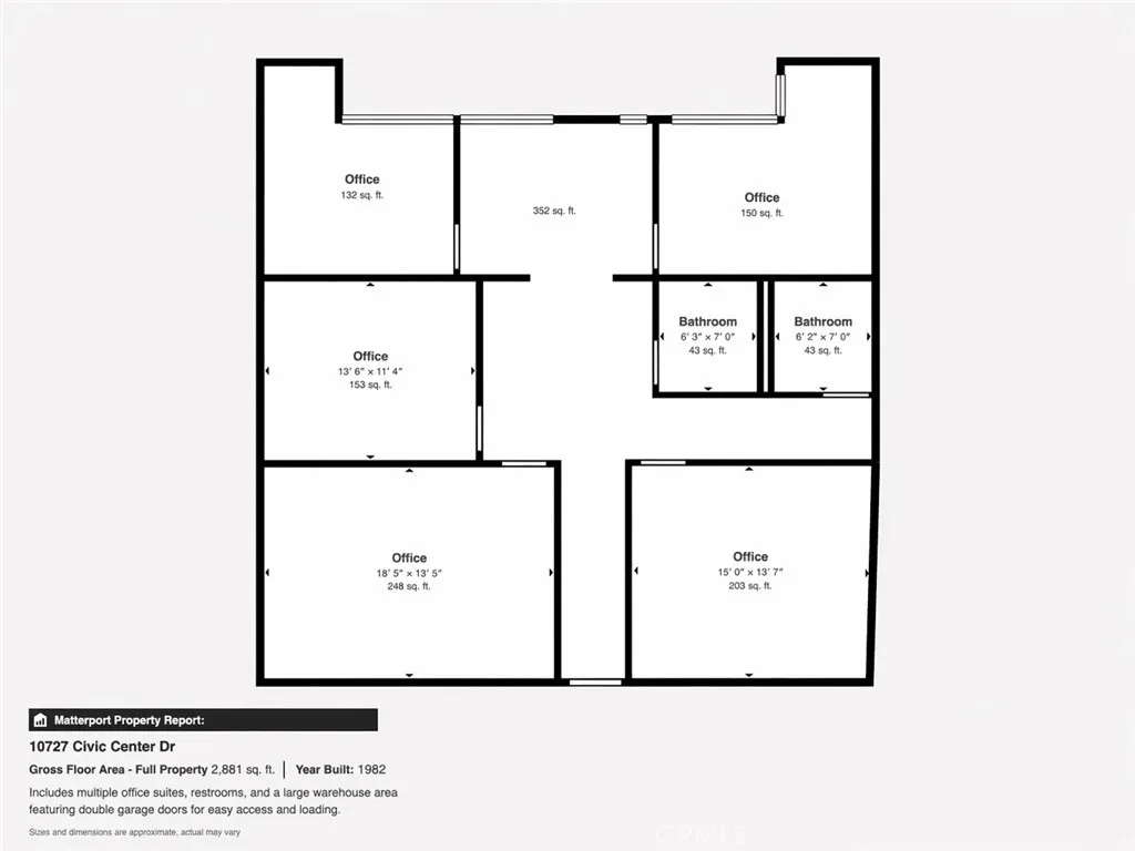 Positioned within the highly sought-after Arrow Business Condominiums in Rancho Cucamonga, this rare industrial condo presents an exceptional opportunity for both owner-users and investors. Encompassing approximately 2,880 square feet, plus an additional ±600 square foot mezzanine loft, the property offers a versatile layout that supports a wide range of industrial and operational uses. Unlike many units in the complex that have been heavily converted to office space, this unit retains a substantial portion of its original warehouse functionality. With approximately 1,385 square feet of ground-level warehouse space, complemented by the mezzanine, the property provides nearly 2,000 square feet of usable warehouse area—ideal for storage, light manufacturing, or distribution. The office component is thoughtfully designed and includes one executive office, three private offices, a spacious conference room, and separate men’s and women’s restrooms, offering a professional and efficient work environment. Functionality is further enhanced by two oversized roll-up doors (approximately 15 feet high with minimum clearance of 18 feet) and three separate entry points (one front, two rear), allowing for seamless access and workflow. The unit also features an upgraded 100-amp electrical service to accommodate a variety of industrial applications. Notably, this property is equivalent in size to two standard units within the complex, providing expanded capacity and operational flexibility rarely available in this market. This is a unique opportunity to acquire a well-balanced industrial asset in a prime Rancho Cucamonga location, combining warehouse utility, office functionality, and long-term investment potential. Disclaimer: The seller and seller’s agent make no representations or warranties regarding the accuracy or completeness of the information provided. Buyers are advised to conduct their own independent due diligence and verify all aspects of the property. The Property is SOLD AS IS.