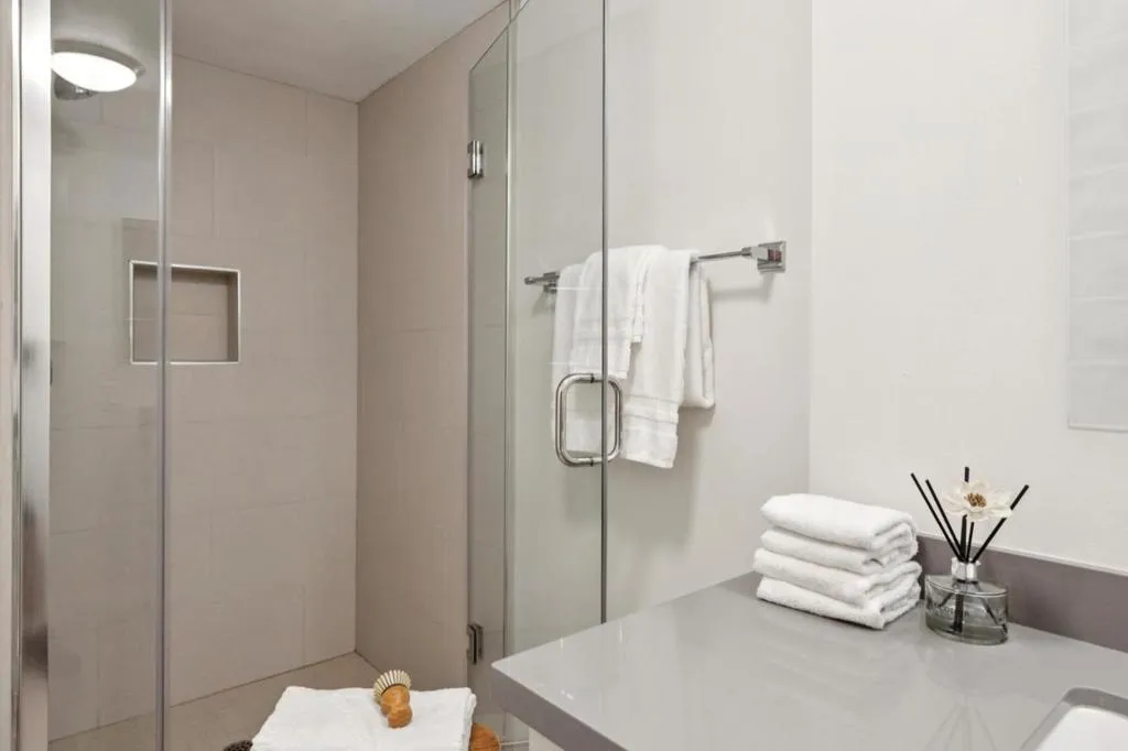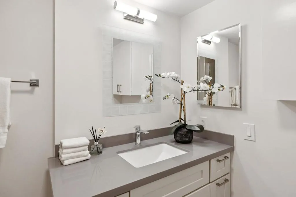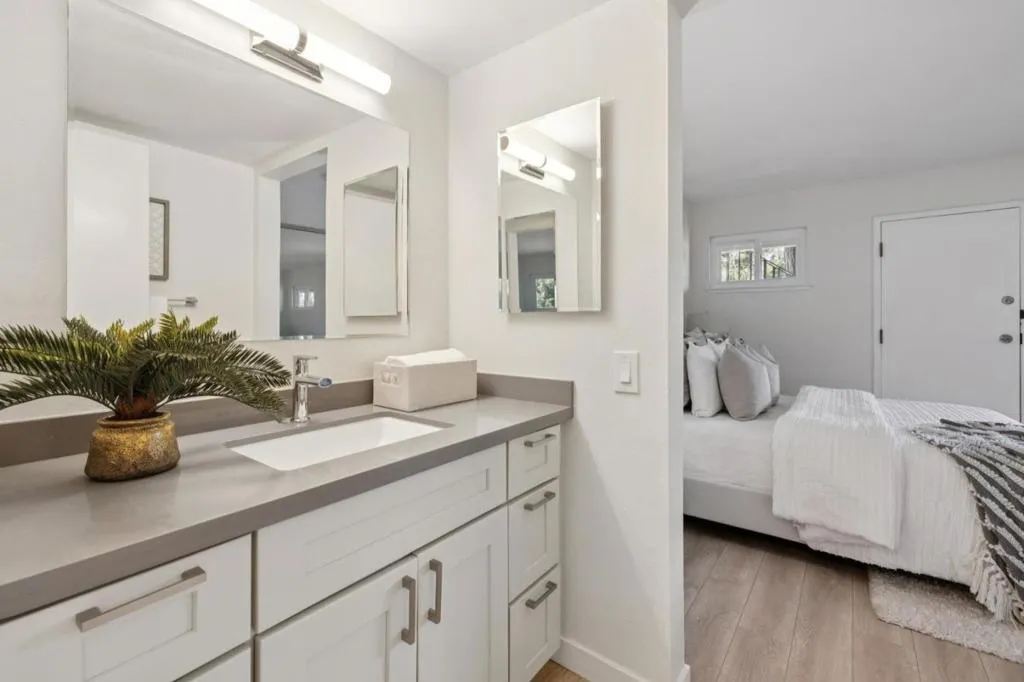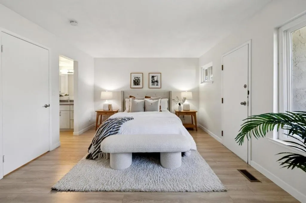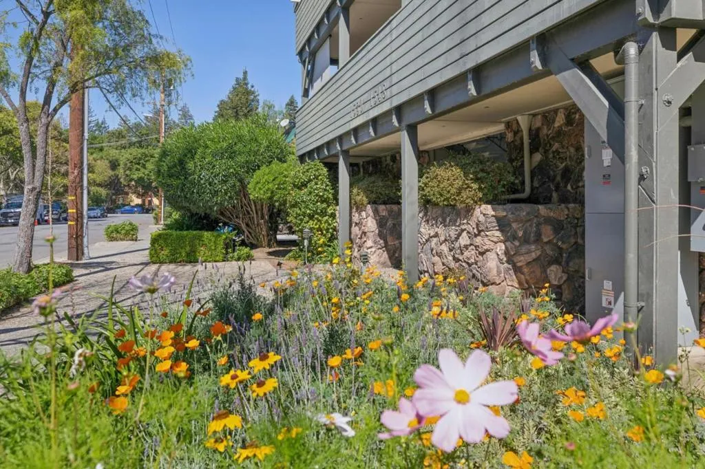Beautifully remodeled single-level condo on the third floor with elevator access, ideally located close to downtown Menlo Park. Bright and stylish living and dining area with crown molding, wood-like floors, and abundant natural light. Spacious updated kitchen with quartz countertops, contemporary cabinetry, and top-of-the-line appliances, including a newly installed Bosch CrystalDry dishwasher. Both bedrooms are generously sized, including a private primary suite with en-suite bath and cozy outdoor patio. Updated bathrooms feature tiled showers, modern cabinetry, quartz counters, and stylish fixtures. Dual-pane windows throughout. Additional highlights include two assigned carport parking spaces, a private storage room, EV charging capabilities, and HOA coverage for water and garbage. Close to Encinal Elementary, Menlo College, Caltrain, Meta, downtown Menlo Park, and the new Springline development with popular dining, coffee, shopping, and Sunday farmers market.