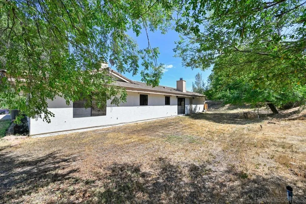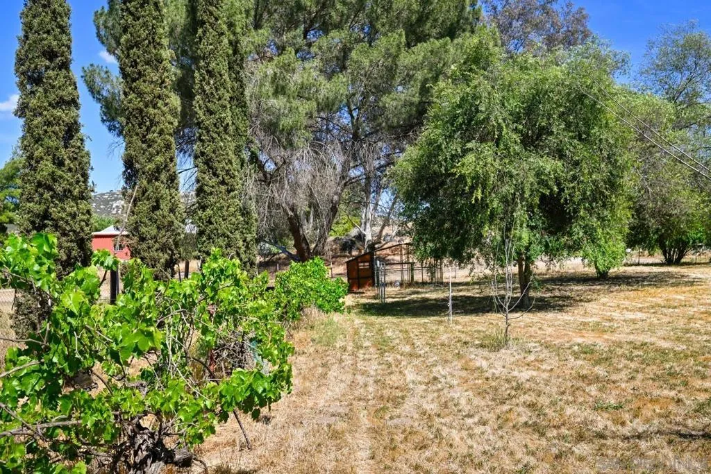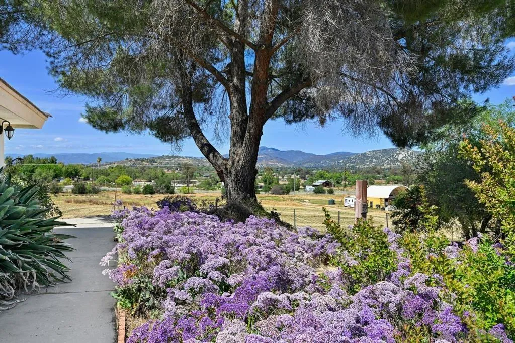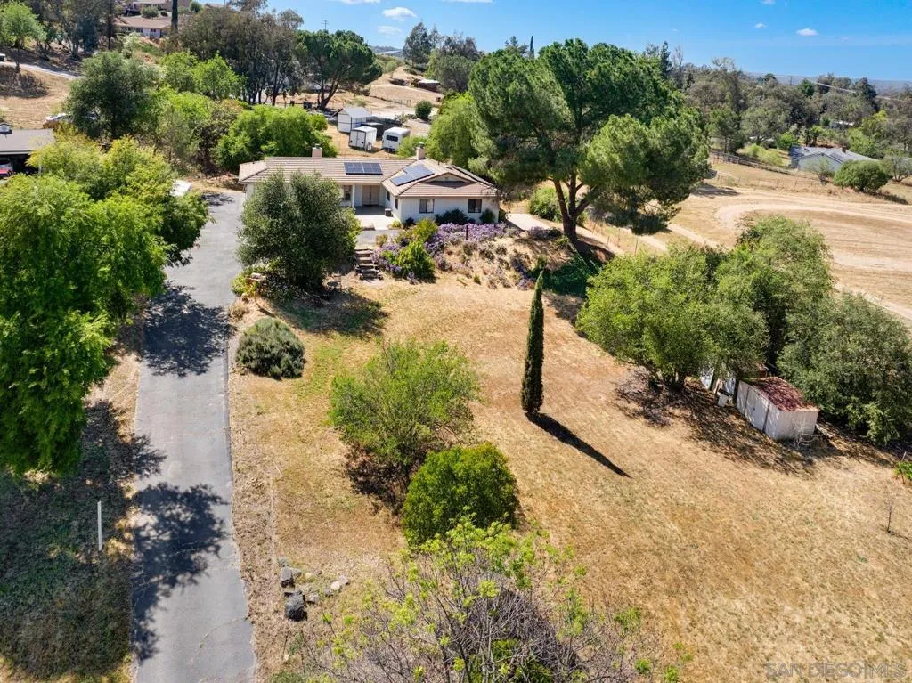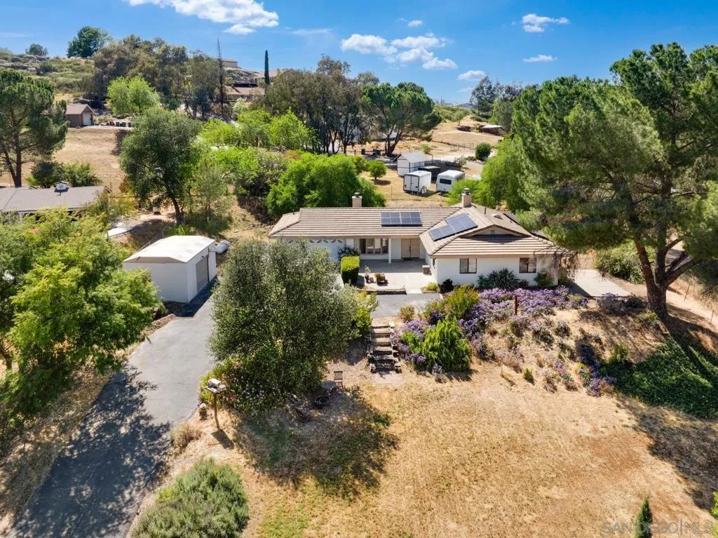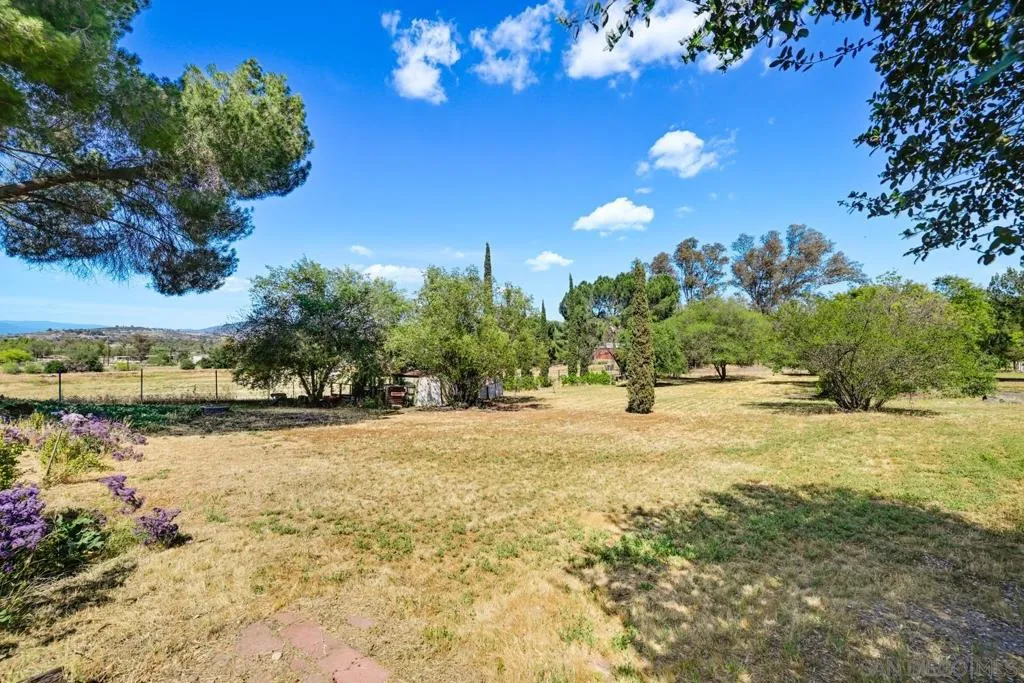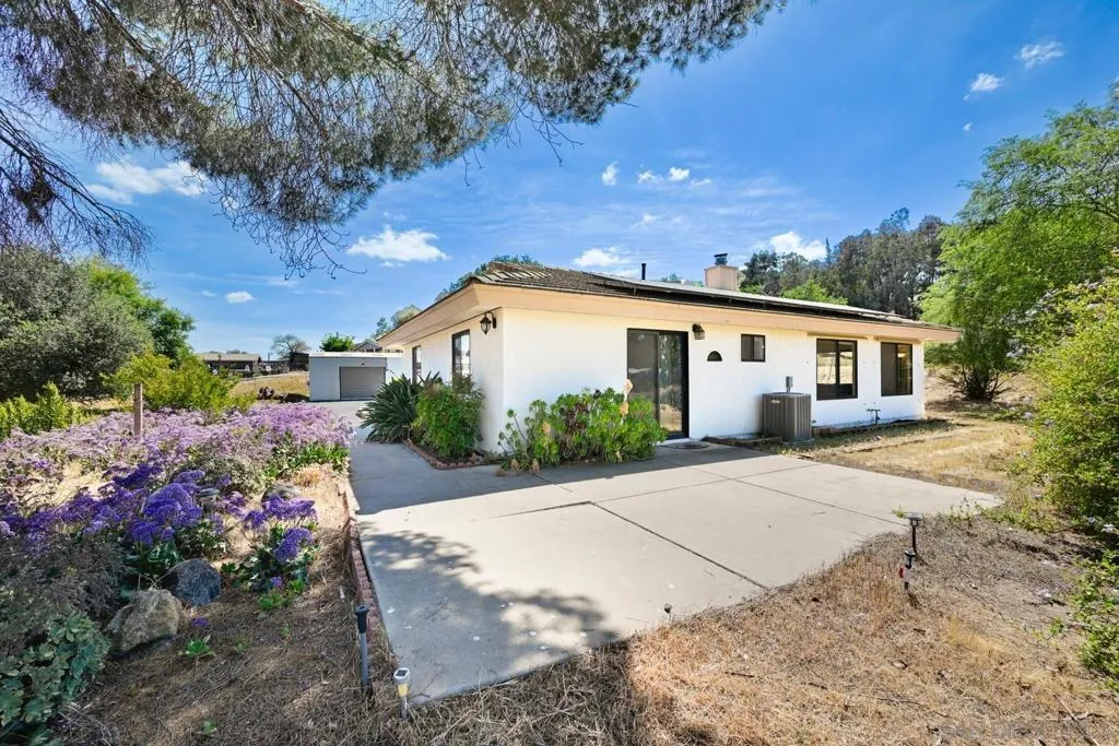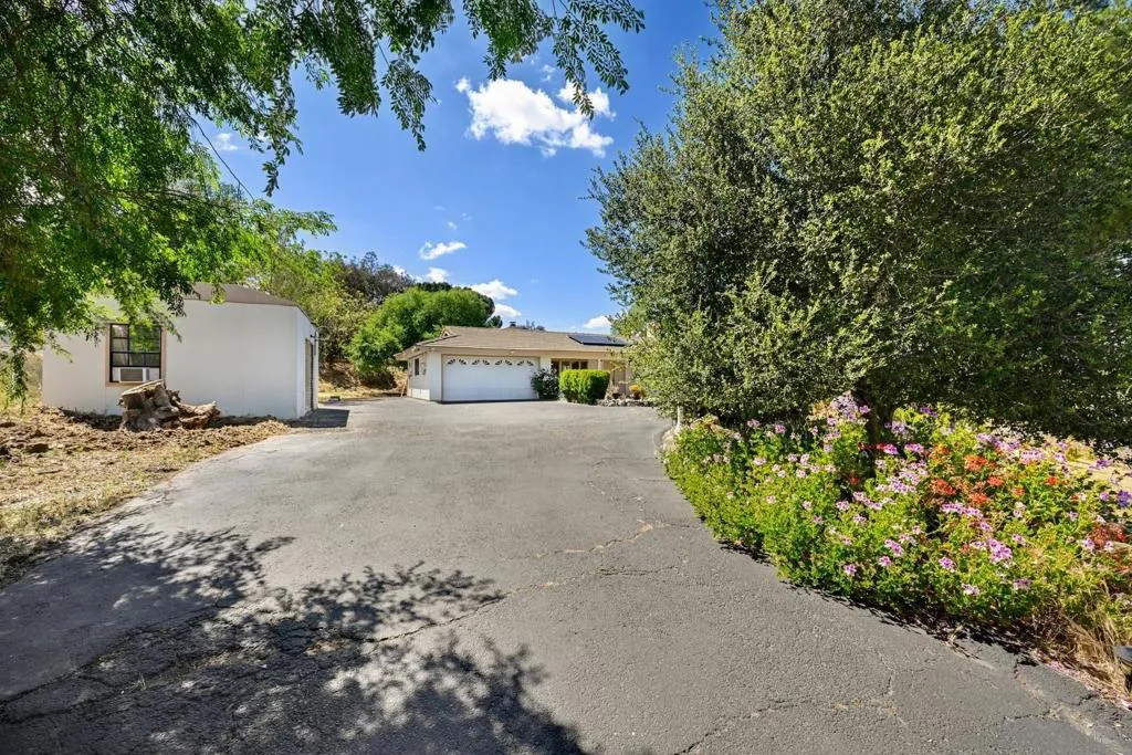 Set on a beautifully usable and expansive 1.23-acre flat parcel, this inviting property offers the perfect blend of privacy, functionality, and scenic charm. A long private driveway leads you to this fully fenced estate with a gated entry, ideally situated just off a paved road with convenient access to Highway 78 and close to town with nearby shops, restaurants, and grocery stores. The land is well suited for horse and animal enthusiasts, gardening, or creating your own grove, all while enjoying picturesque mountain and pasture views. The property also features charming grape vines and a chicken coop, adding to its appeal for those seeking a more self-sustained, country lifestyle. Thoughtfully improved, the property features RV parking, a metal workshop with 220 power, two storage sheds, and a leased solar system with a low monthly payment for added efficiency. The welcoming ranch-style home begins with a spacious front patio and flows into a foyer that opens to the dining area and an impressively large, renovated kitchen. This oversized kitchen is both stylish and functional, offering abundant cabinetry, a breakfast bar, pantry, recessed lighting, and stunning granite countertops—perfect for everyday living and entertaining. The dining room includes sliding doors to the backyard, while the family room features a cozy wood-burning fireplace with hearth, surrounded by built-ins. The primary suite offers a private bath, while two additional bedrooms share a well-appointed bathroom with dual sinks and a tub/shower combination. This home offers endless possibilities!