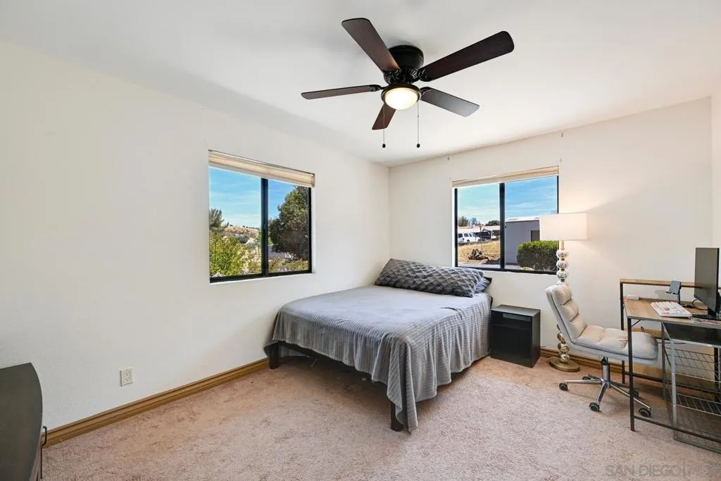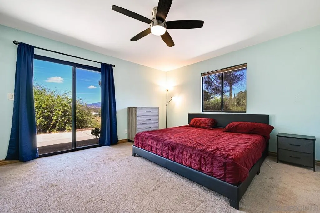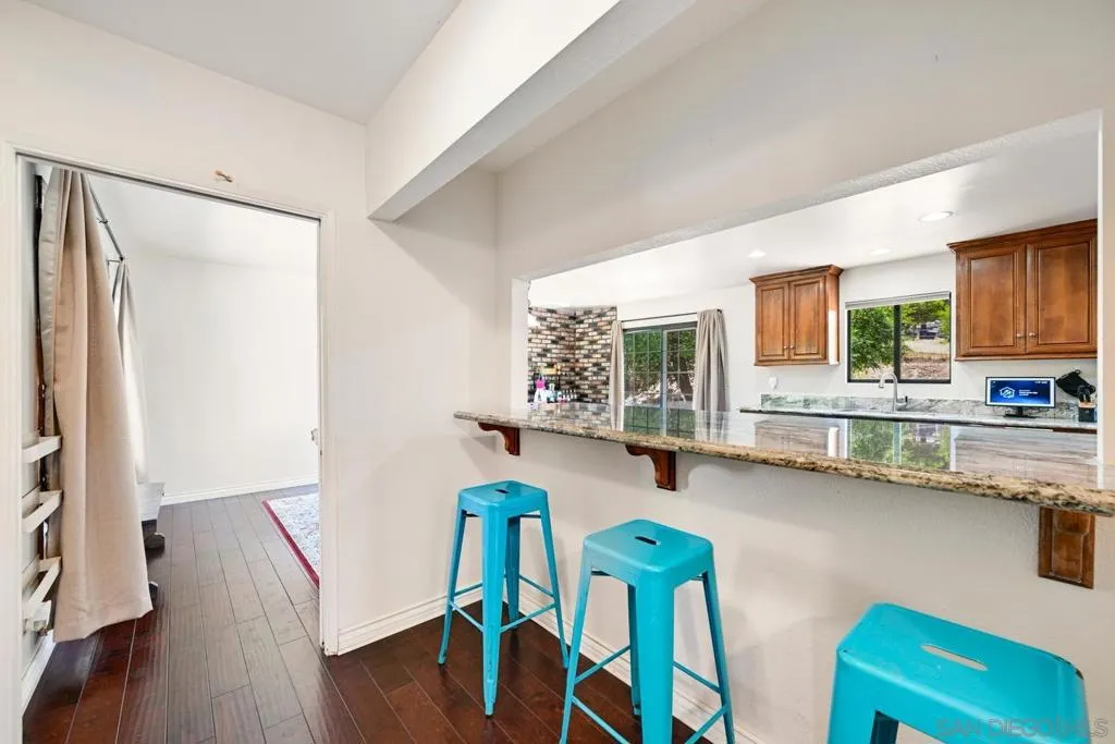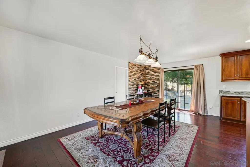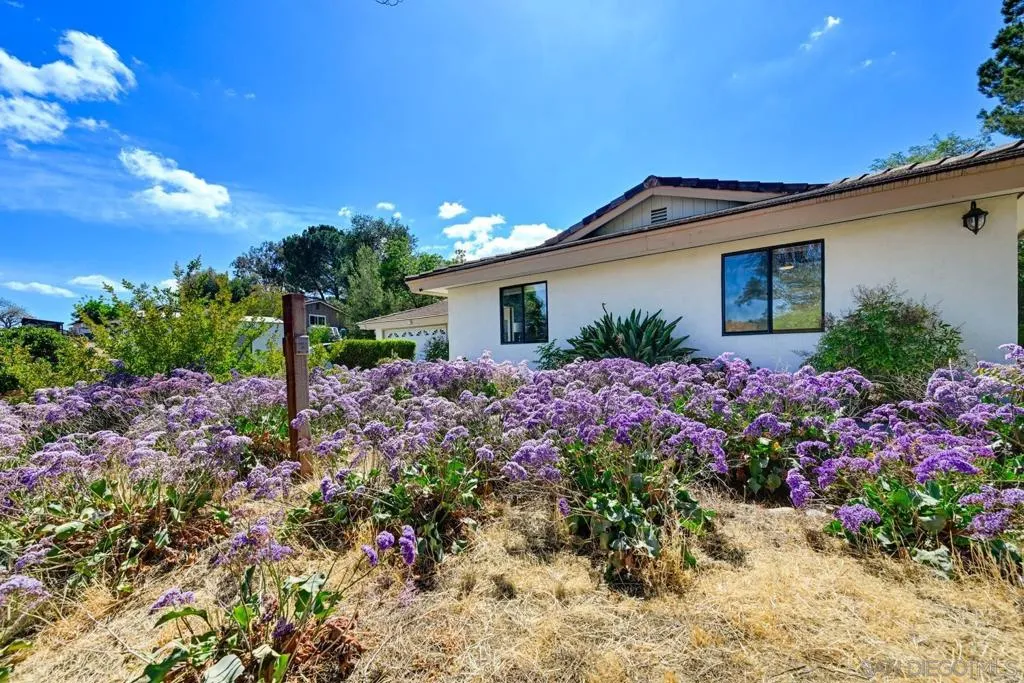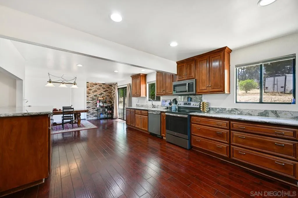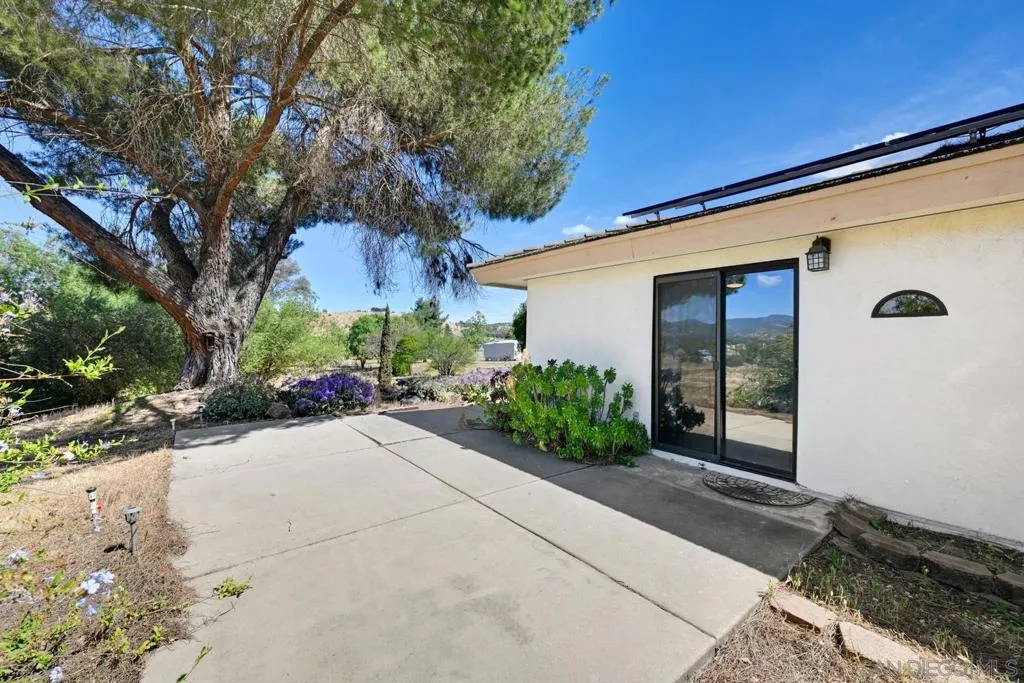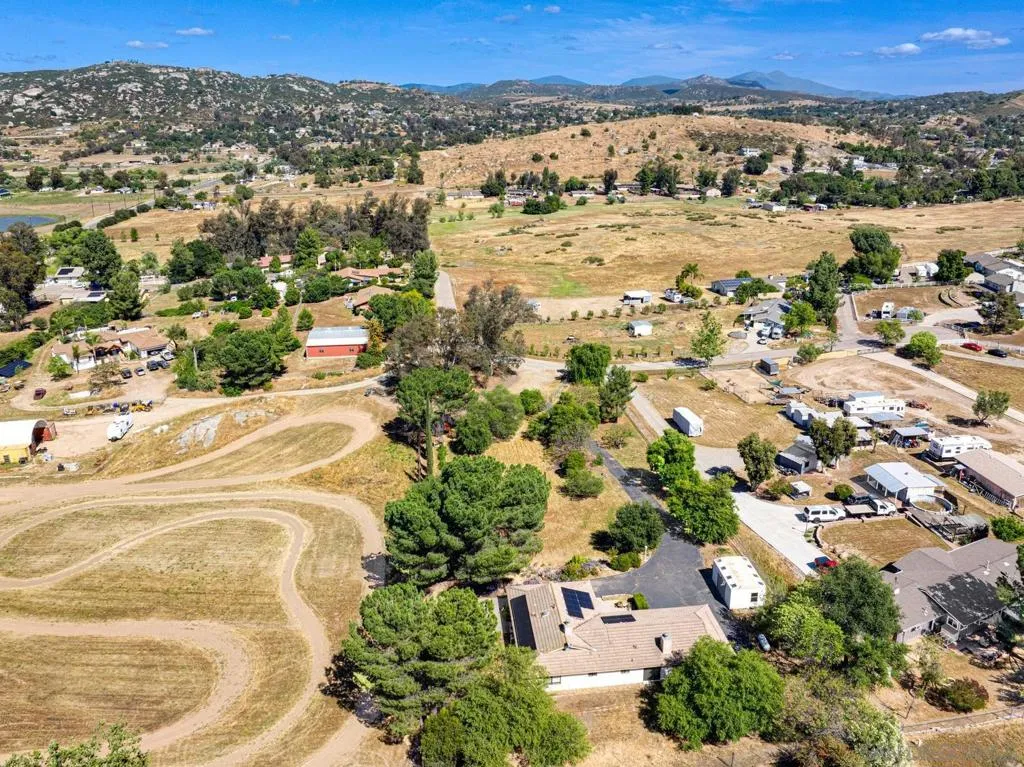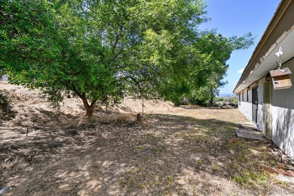Set on a beautifully usable and expansive 1.23-acre flat parcel, this inviting property offers the perfect blend of privacy, functionality, and scenic charm. A long private driveway leads you to this fully fenced estate with a gated entry, ideally situated just off a paved road with convenient access to Highway 78 and close to town with nearby shops, restaurants, and grocery stores. The land is well suited for horse and animal enthusiasts, gardening, or creating your own grove, all while enjoying picturesque mountain and pasture views. The property also features charming grape vines and a chicken coop, adding to its appeal for those seeking a more self-sustained, country lifestyle. Thoughtfully improved, the property features RV parking, a metal workshop with 220 power, two storage sheds, and a leased solar system with a low monthly payment for added efficiency. The welcoming ranch-style home begins with a spacious front patio and flows into a foyer that opens to the dining area and an impressively large, renovated kitchen. This oversized kitchen is both stylish and functional, offering abundant cabinetry, a breakfast bar, pantry, recessed lighting, and stunning granite countertops—perfect for everyday living and entertaining. The dining room includes sliding doors to the backyard, while the family room features a cozy wood-burning fireplace with hearth, surrounded by built-ins. The primary suite offers a private bath, while two additional bedrooms share a well-appointed bathroom with dual sinks and a tub/shower combination. This home offers endless possibilities!