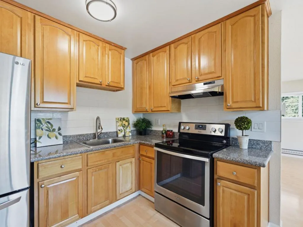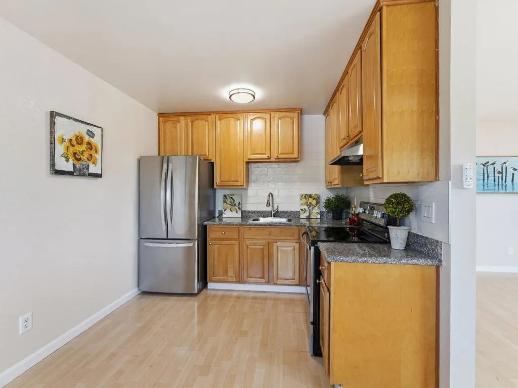 Beautiful and affordable 2-bedroom, 1-bath end-unit condo in the desirable Campbell area. Fresh paint, vinyl plank flooring, and new light fixtures throughout. Double-paned windows fill the main living areas with an abundance of natural light. The kitchen features granite countertops and stainless steel appliances. The bathroom offers a large granite-topped vanity and a beautifully tiled shower-over-tub enclosure. Relax on your own private balcony. Assigned end unit carport, shared laundry. Close to shopping and access to main roads!