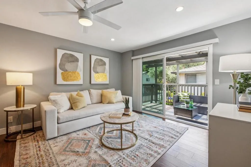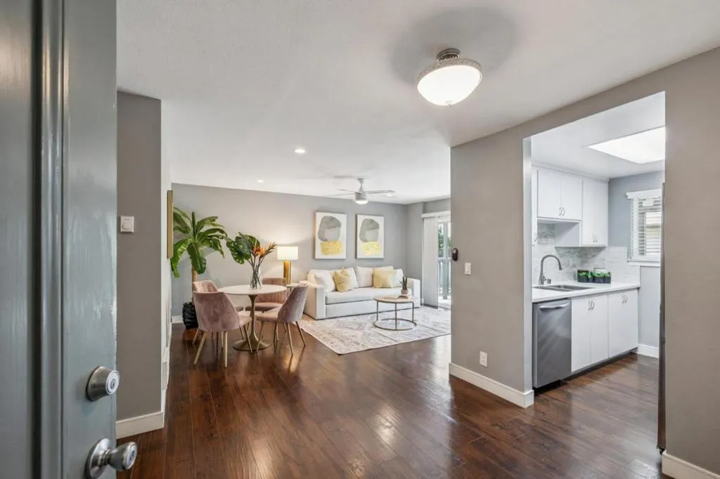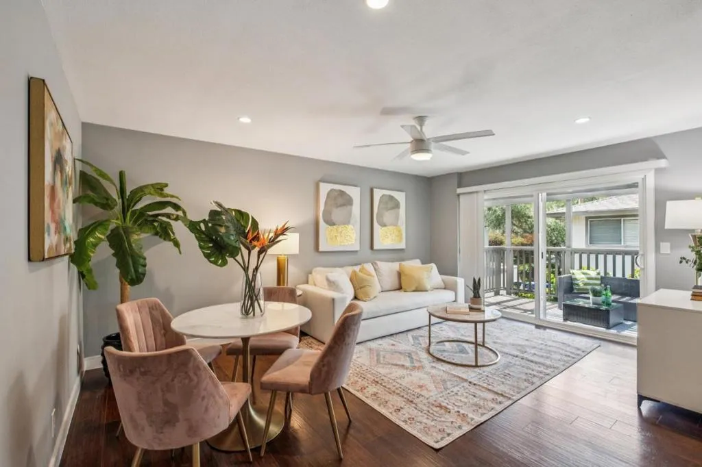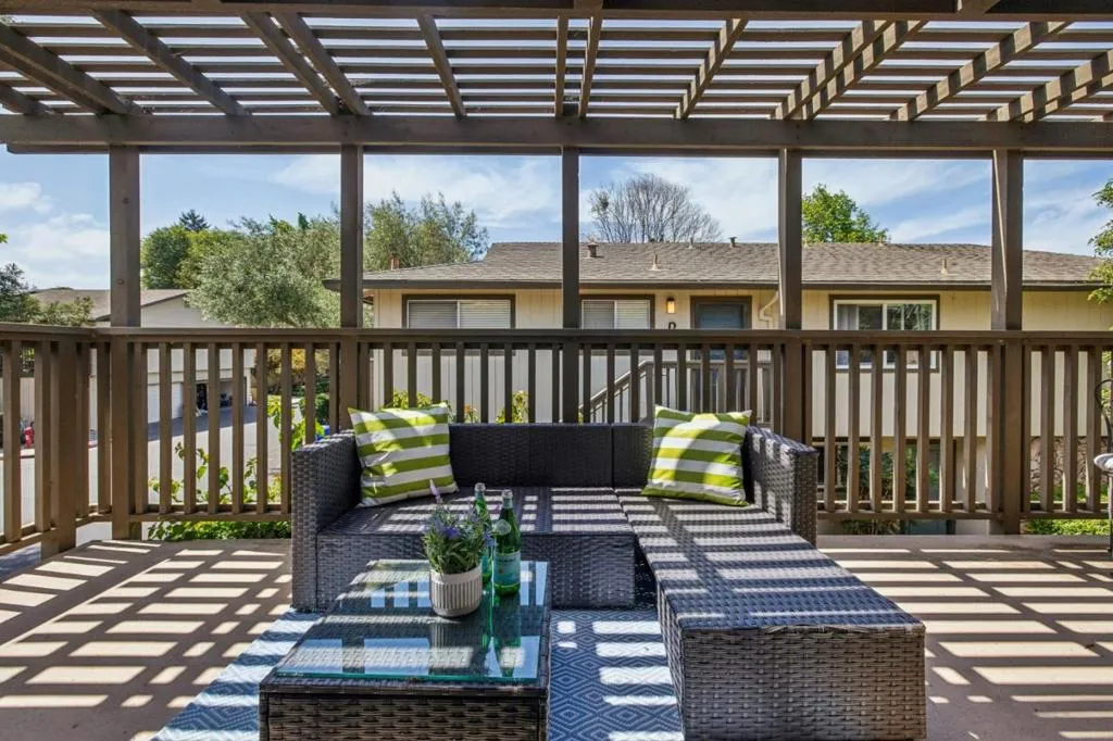 Immaculate, fully upgraded top-floor condo in Mountain View, offering a rare blend of privacy, natural light, and modern comfort in the heart of Silicon Valley. This private upstairs unit has no neighbors below and only one shared wall, creating a serene, quiet environment. Enjoy a spacious, sun-filled, newly repaired and reinforced patioperfect for entertaining and relaxing. The open living space features recessed lighting, stylish fixtures, fresh designer paint, and newer wood flooring and baseboards throughout. The remodeled kitchen showcases sleek cabinetry and newer stainless-steel appliances, complemented by an upgraded bathroom. Double-pane windows with premium blinds enhance comfort and efficiency. Additional highlights include an in-unit Bosch washer and dryer, ceiling fans in every room, large closets with abundant storage, and a 1-car covered carport with extra storage plus ample guest parking. The well-maintained community offers a clubhouse, pool, & childrens play area. Ideally located minutes from Google and major employers including LinkedIn, Microsoft, Samsung, and Intuit, with easy access to Highways 101, 85, & 237, Caltrain, light rail, downtown, & top-rated schools including Huff Elem School, Crittenden Middle School, & Mountain View High School. Welcome home!