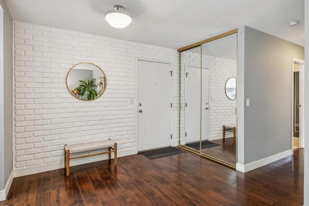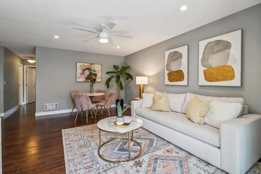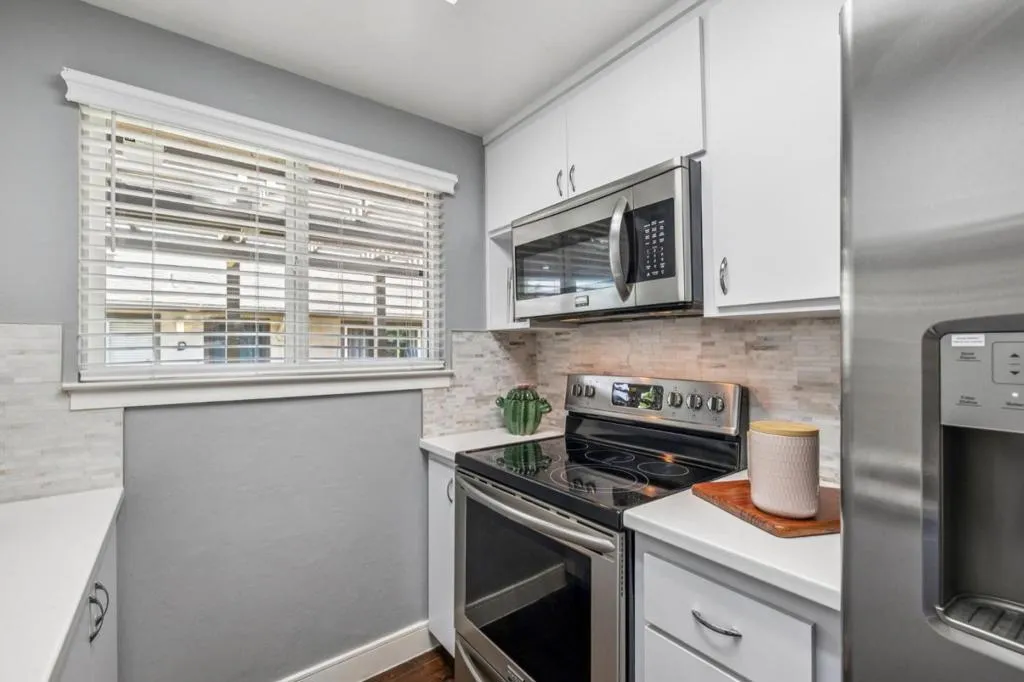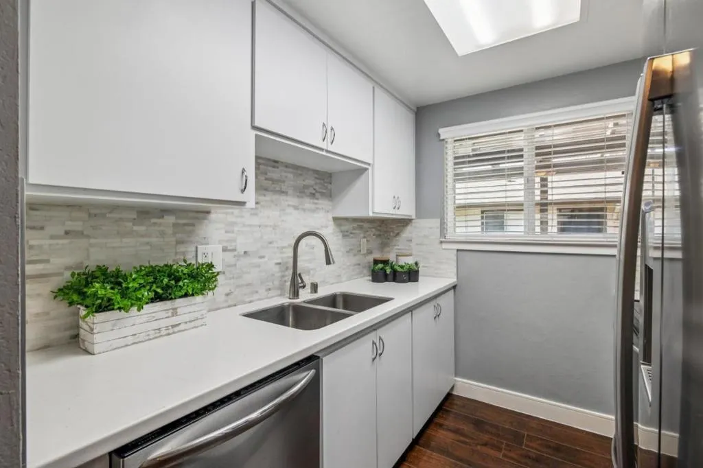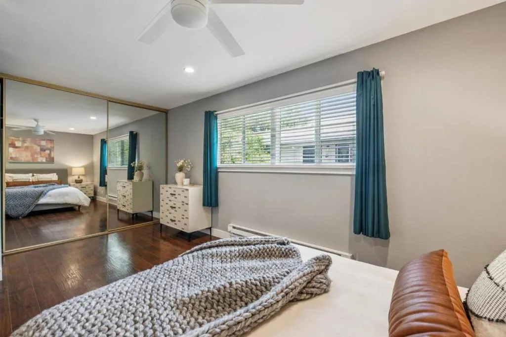 Immaculate, fully upgraded top-floor condo in Mountain View, offering a rare blend of privacy, natural light, and modern comfort in the heart of Silicon Valley. This private upstairs unit has no neighbors below and only one shared wall, creating a serene, quiet environment. Enjoy a spacious, sun-filled, newly repaired and reinforced patioperfect for entertaining and relaxing. The open living space features recessed lighting, stylish fixtures, fresh designer paint, and newer wood flooring and baseboards throughout. The remodeled kitchen showcases sleek cabinetry and newer stainless-steel appliances, complemented by an upgraded bathroom. Double-pane windows with premium blinds enhance comfort and efficiency. Additional highlights include an in-unit Bosch washer and dryer, ceiling fans in every room, large closets with abundant storage, and a 1-car covered carport with extra storage plus ample guest parking. The well-maintained community offers a clubhouse, pool, & childrens play area. Ideally located minutes from Google and major employers including LinkedIn, Microsoft, Samsung, and Intuit, with easy access to Highways 101, 85, & 237, Caltrain, light rail, downtown, & top-rated schools including Huff Elem School, Crittenden Middle School, & Mountain View High School. Welcome home!