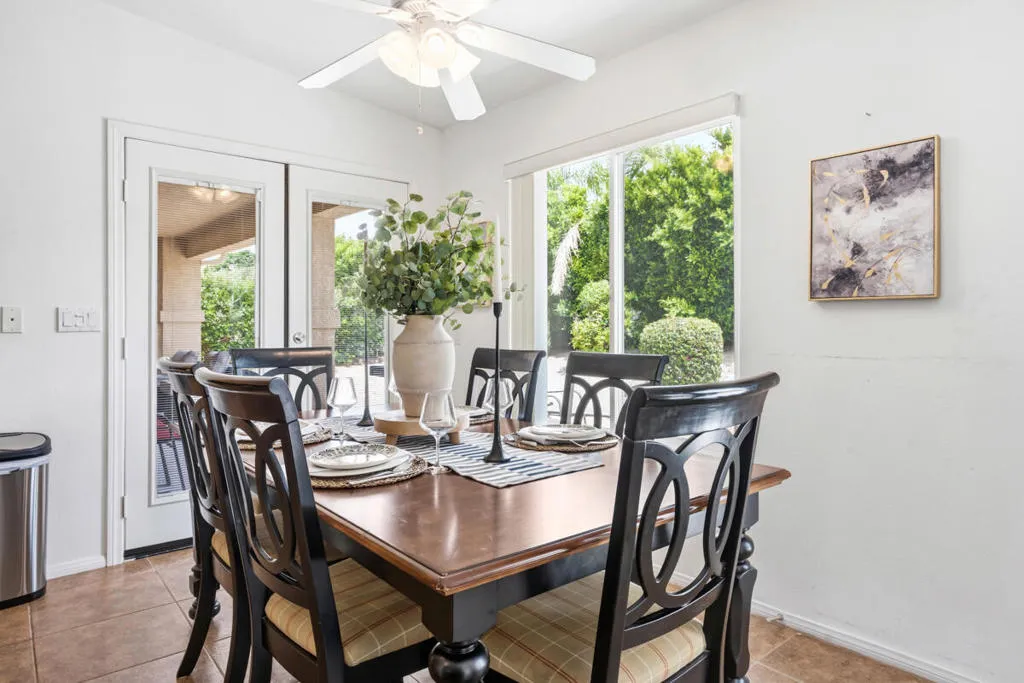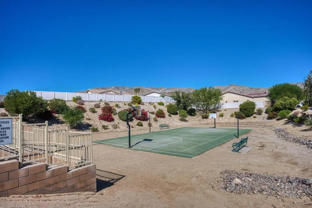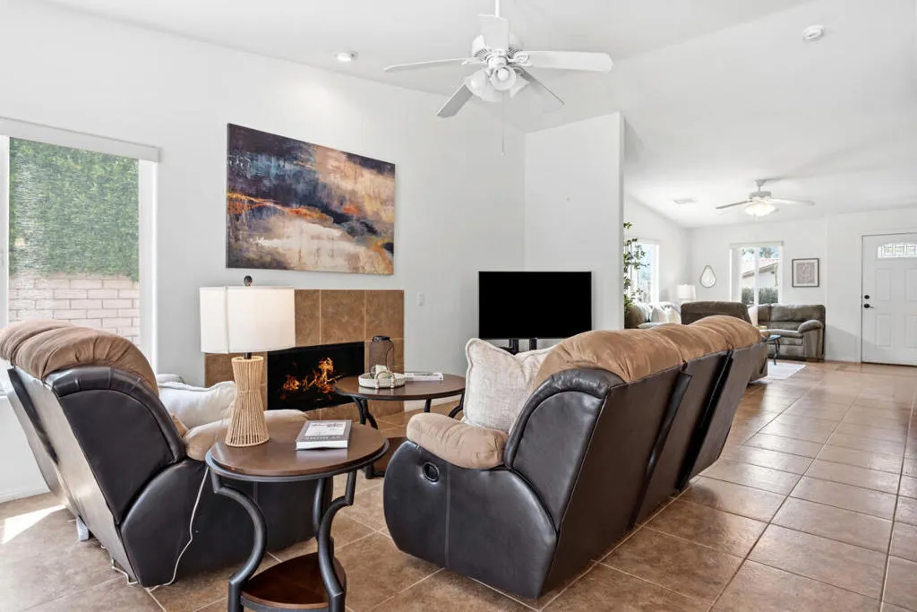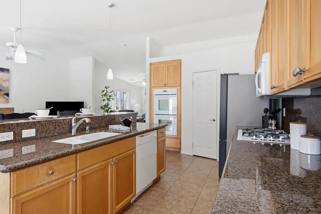 A Mission Lakes Country Club beauty offered fully furnished with owned solar, updated HVAC system, and in impeccable condition just a short distance from the golf course and clubhouse. This thoughtfully designed 3-bedroom, 3-bath residence spans approximately 1,890 square feet and the average electricity bill is about $20 a month. The home showcases vaulted ceilings and tile flooring throughout, creating a bright and open living environment. The expansive main living area features a natural gas fireplace that flows seamlessly into the dining space and a generous kitchen complete with granite surfaces, ample storage, a double oven, and a newer Samsung refrigerator. The primary suite offers a spacious retreat with a custom walk-in shower and large closet. Additional highlights include an indoor laundry room with washer and gas dryer, and an attached 2-car garage with golf cart parking and a 240-volt outlet for electric vehicle charging. Outside, the low-maintenance, drought-tolerant landscaping enhances both curb appeal and efficiency. The private backyard is designed for relaxation, featuring a covered patio, outdoor seating, firepit, and natural gas barbecue. Residents also enjoy an unlimited golf membership for two, fitness club, pool, included with the monthly HOA dues.