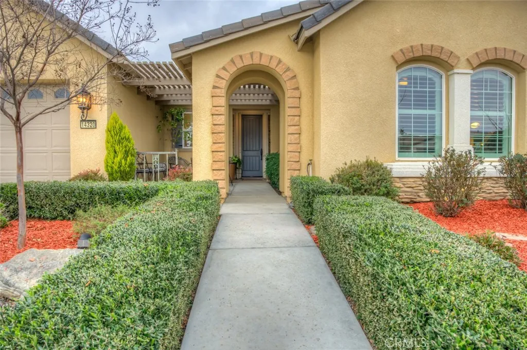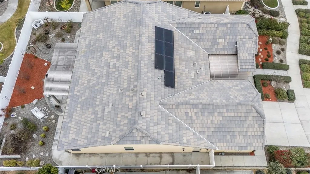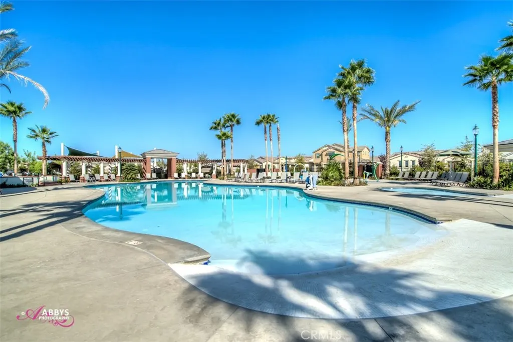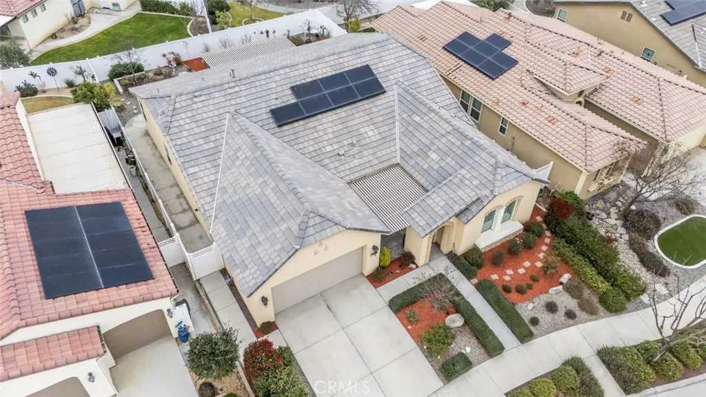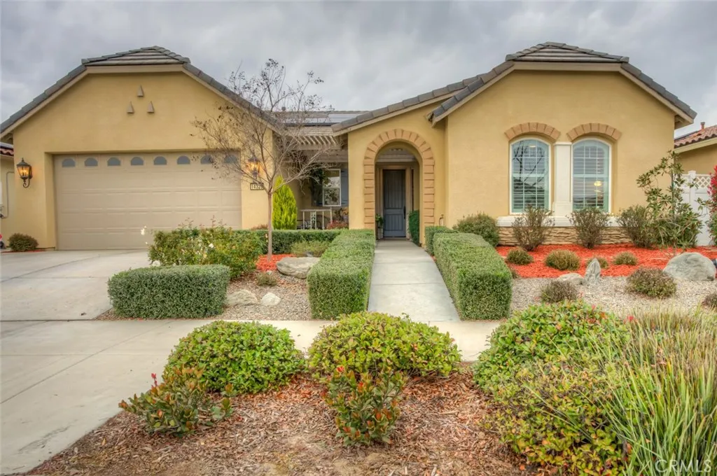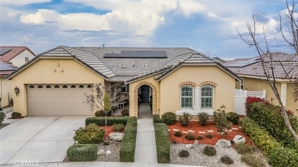 Resort-style living in the prestigious gated 55+ community of Highgate Regents. This impeccably designed 3-bedroom, 2-bath residence with a 2-car garage offers a desirable split-wing floor plan and an elegant open-concept great room enhanced by tray ceilings and recessed lighting. The chef's kitchen showcases quartz countertops, an island, custom cabinetry with rich oil-rubbed bronze hardware, stainless steel appliances, and a well-appointed indoor laundry room with built-in storage. Luxury vinyl plank flooring flows seamlessly. The private primary suite is a true retreat, featuring dual vanities, a soaking tub, separate glass-enclosed shower, and a spacious walk-in closet. The designed backyard offers a covered patio, pergola, and expansive entertaining space. There is a tankless water heater and 7 solar panels. Enjoy amazing community with amenities including a clubhouse, resort-style pool, pickleball courts and so much more.
