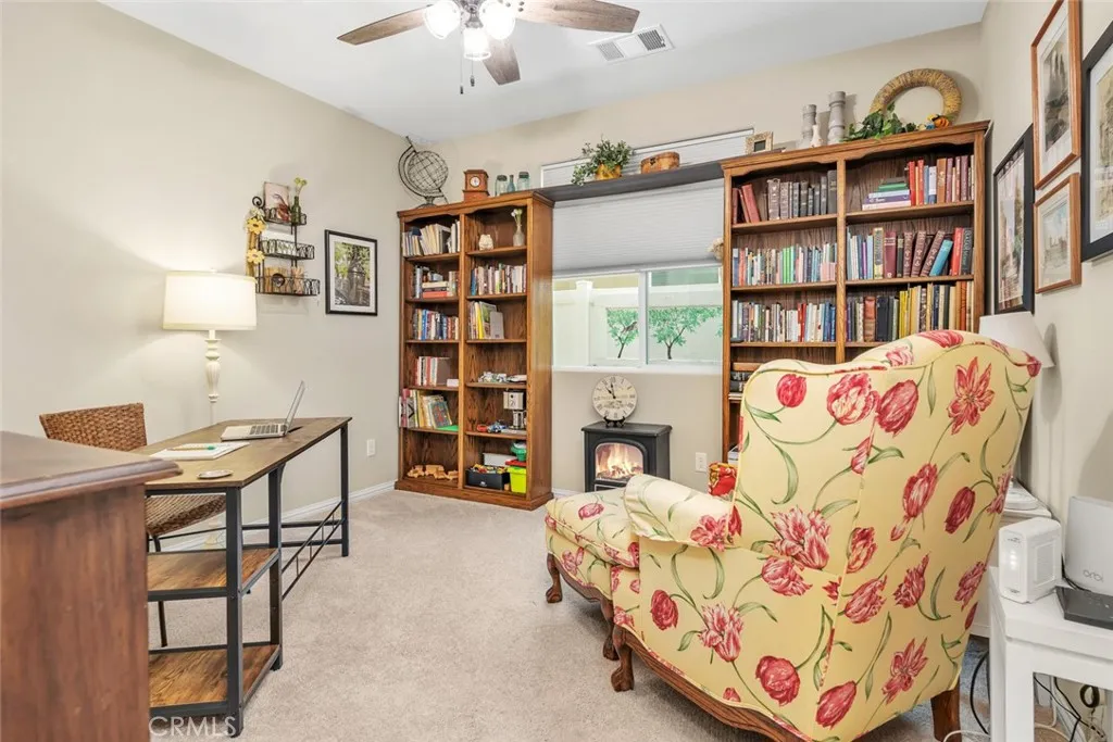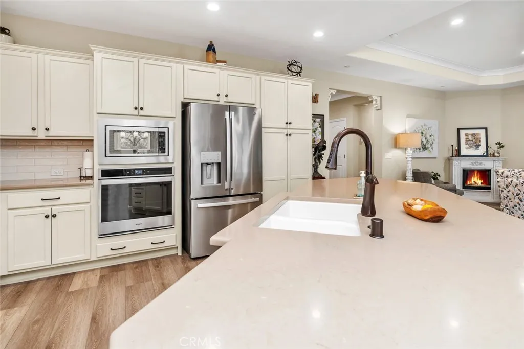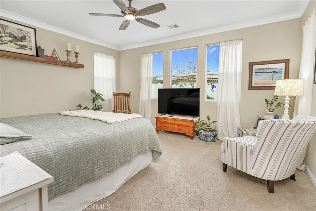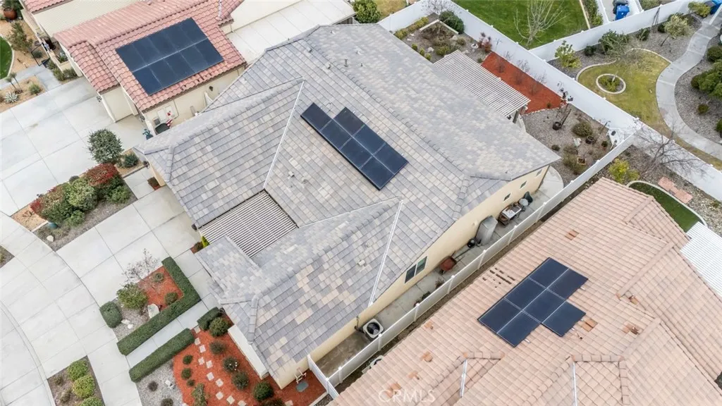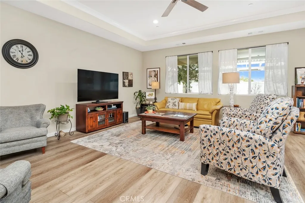 Resort-style living in the prestigious gated 55+ community of Highgate Regents. This impeccably designed 3-bedroom, 2-bath residence with a 2-car garage offers a desirable split-wing floor plan and an elegant open-concept great room enhanced by tray ceilings and recessed lighting. The chef's kitchen showcases quartz countertops, an island, custom cabinetry with rich oil-rubbed bronze hardware, stainless steel appliances, and a well-appointed indoor laundry room with built-in storage. Luxury vinyl plank flooring flows seamlessly. The private primary suite is a true retreat, featuring dual vanities, a soaking tub, separate glass-enclosed shower, and a spacious walk-in closet. The designed backyard offers a covered patio, pergola, and expansive entertaining space. There is a tankless water heater and 7 solar panels. Enjoy amazing community with amenities including a clubhouse, resort-style pool, pickleball courts and so much more.