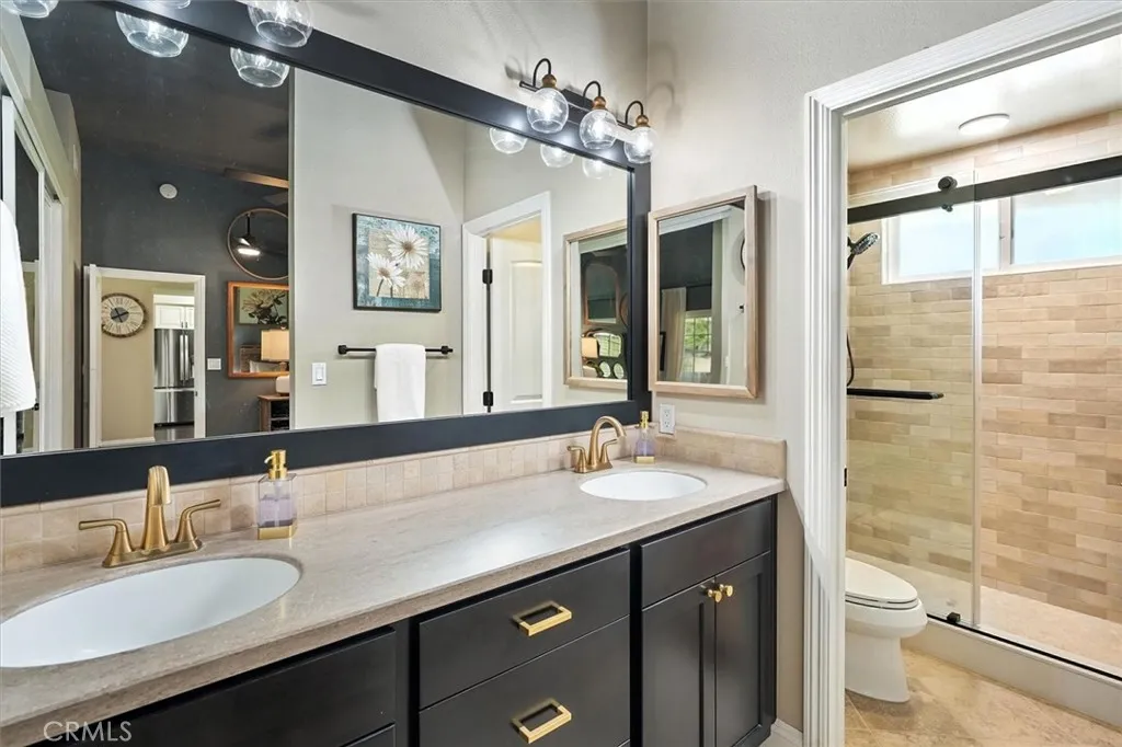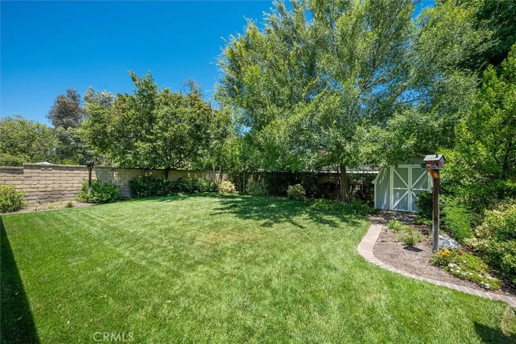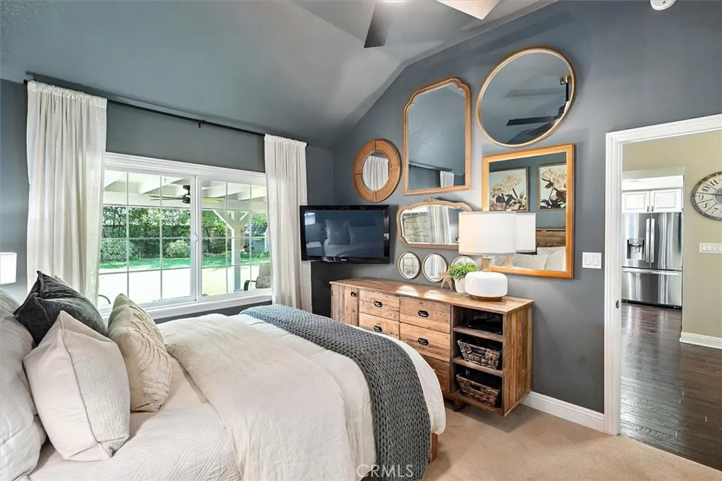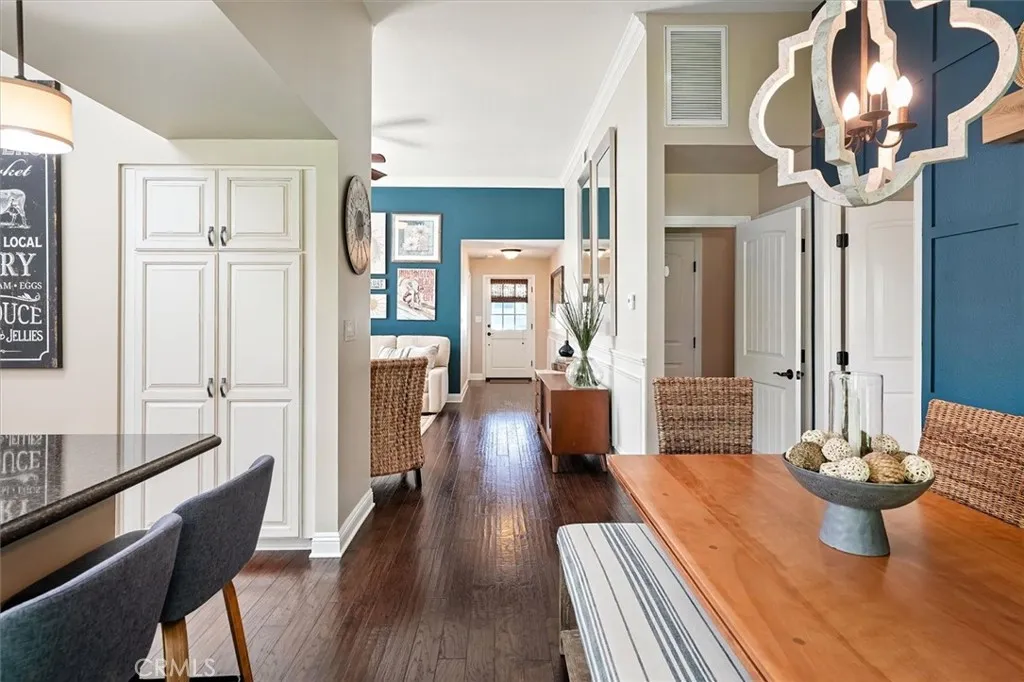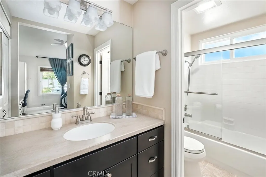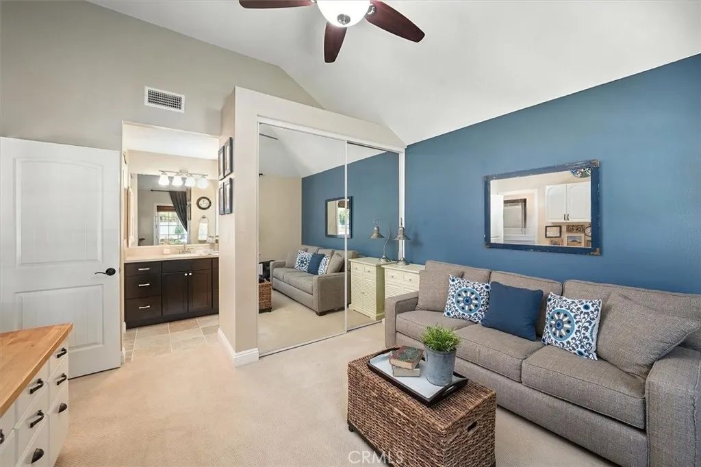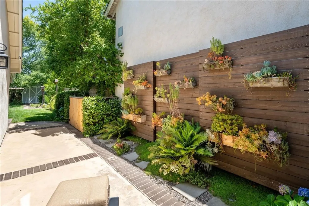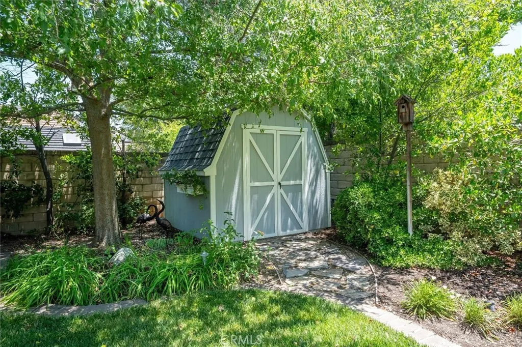 Beautifully renovated and meticulously maintained bungalow-style home on a cul-de-sac in the heart of Valencia, located just behind Granary Square and featuring an oversized backyard and a floorplan that lives like a single story with most living spaces on the main level. Situated in one of Valencia’s most desirable neighborhoods, the home offers exceptional convenience to shopping, restaurants, entertainment, medical facilities, and miles of scenic paseos and biking trails. The community offers neighborhood pools and parks, easy freeway access, and is less than an hour’s drive to the beach. The area is known for its top-rated schools, with no Mello-Roos and low HOA fees. This thoughtfully designed floor plan includes three ensuite bedrooms—two located downstairs, with one currently serving as an office or flex space that can accommodate a king-size bed, and another ensuite situated on the upper floor. The home features wood floors, custom wood paneling and wall treatments, and high ceilings. The kitchen includes quartz countertops, custom cabinets with pull-out shelving, and soft-close drawers and doors, along with an extra pantry. The bathrooms are equipped with new vanities, fixtures, and solid surface counters. The property offers excellent storage with an oversized attic and a backyard shed. Additional features include dual-pane windows, a metal roof, a whole house fan, automatic sprinklers, outdoor lighting, and outdoor ceiling fans. The expansive backyard includes a covered patio and a trash enclosure. The garage is equipped with a workbench, attic storage, and cabinets.