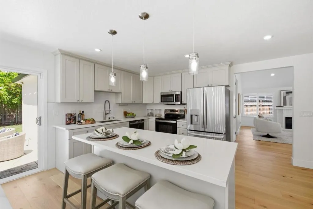 Comfortable and thoughtfully designed, this 3-bedroom, 2-bath home offers 1,442 sq. ft. of inviting living space with beautiful flooring throughout. The kitchen features quartz countertops, a gas range, a built-in oven, an island, a dishwasher, and a refrigerator, along with an eat-in dining area ideal for both daily living and entertaining. The primary includes a walk-in closet and a private bath with a stall shower and sliding doors to the backyard. A separate family room and fireplace add warmth and character. Additional highlights include a laundry in the garage, a 2-car garage, forced-air heating, and central A/C for year-round comfort. Located within a well-regarded local school district, this home offers a functional layout and a welcoming atmosphere suited for a variety of lifestyles.