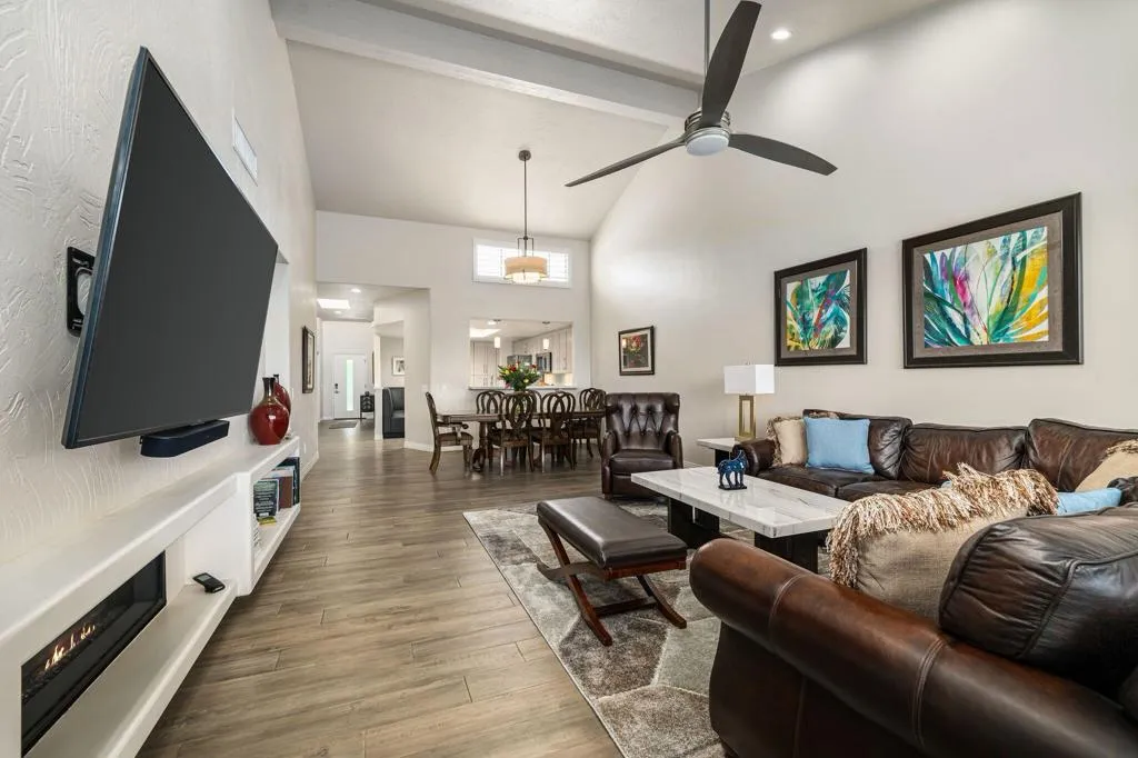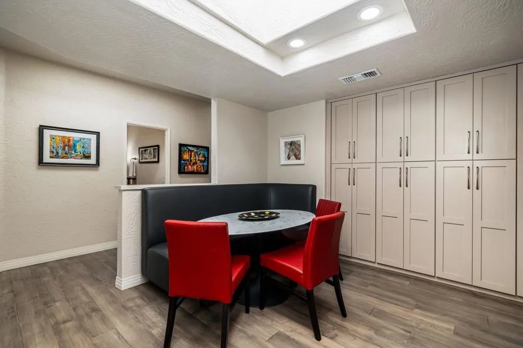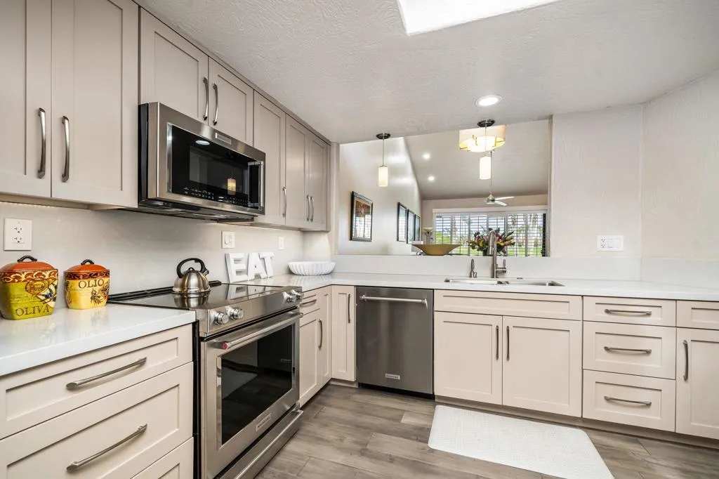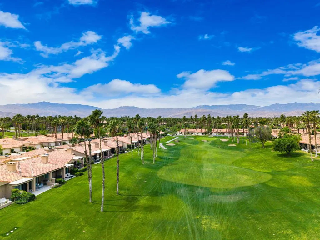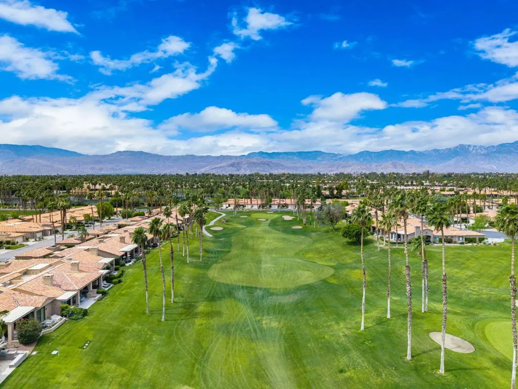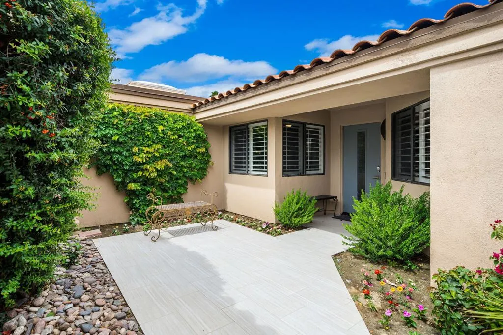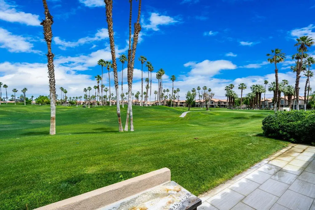 Updated Golf Course Condo with Panoramic Views! Welcome to this highly sought-after Tamarisk Plan, ideally situated within the guard-gated Palm Valley Country Club in the heart of Palm Desert. Offered fully furnished and move-in ready, this tastefully updated residence delivers effortless desert living with breathtaking westerly views of the mountains and the 18th hole of the Challenge Course. This spacious home features 3 ensuite bedrooms plus a powder room, providing ideal comfort and privacy for both residents and guests. A private gated front courtyard creates a warm and inviting entry, while the 2-car garage adds functionality and ease. Designed for indoor-outdoor living, the expansive fairway patio captures stunning panoramic views and is accessible directly from the living room and the primary suite - perfect for enjoying morning coffee or evening sunsets. Inside, the great room impresses with soaring ceilings, enhanced by new ceiling fans and modern lighting, creating a bright and open ambiance. The updated kitchen is thoughtfully designed with a modern designer table with a builtin bench seating, upgraded cabinetry, appliances, and lighting, along with bar counter seating and a separate dining area that flows seamlessly into the living space. The living room features a contemporary fireplace, custom display shelving, and a redesigned bar area with built-in wine storage, updated cabinetry, and a beverage refrigerator - ideal for entertaining. New plank flooring runs throughout the home, with plush carpet in the bedrooms and tile in the bathrooms for comfort and style. The primary suite is a true retreat, offering private patio access and an updated bathroom with granite counters, dual vanity area, and separate tub and shower. Both guest suites include ensuite updated bathrooms with modern showers and granite countertops, ensuring a luxurious experience for visitors. Perfectly positioned, the community pool and spa are conveniently located just across the street, with another nearby--enhancing the resort-style lifestyle this home provides. Located in one of the desert's premier communities, Palm Valley Country Club offers two Ted Robinson-designed golf courses, fitness center & spa, tennis, pickleball, and 46 pools & spas. HOA includes social membership, guard-gated security, cable/internet, exterior maintenance, roof, landscaping & trash. Short-term rentals allowed (28 days or less) with City of Palm Desert permit.