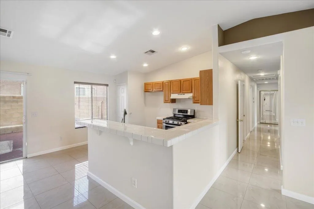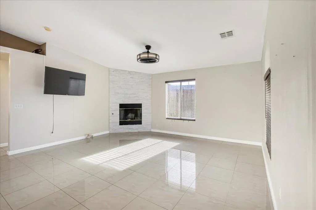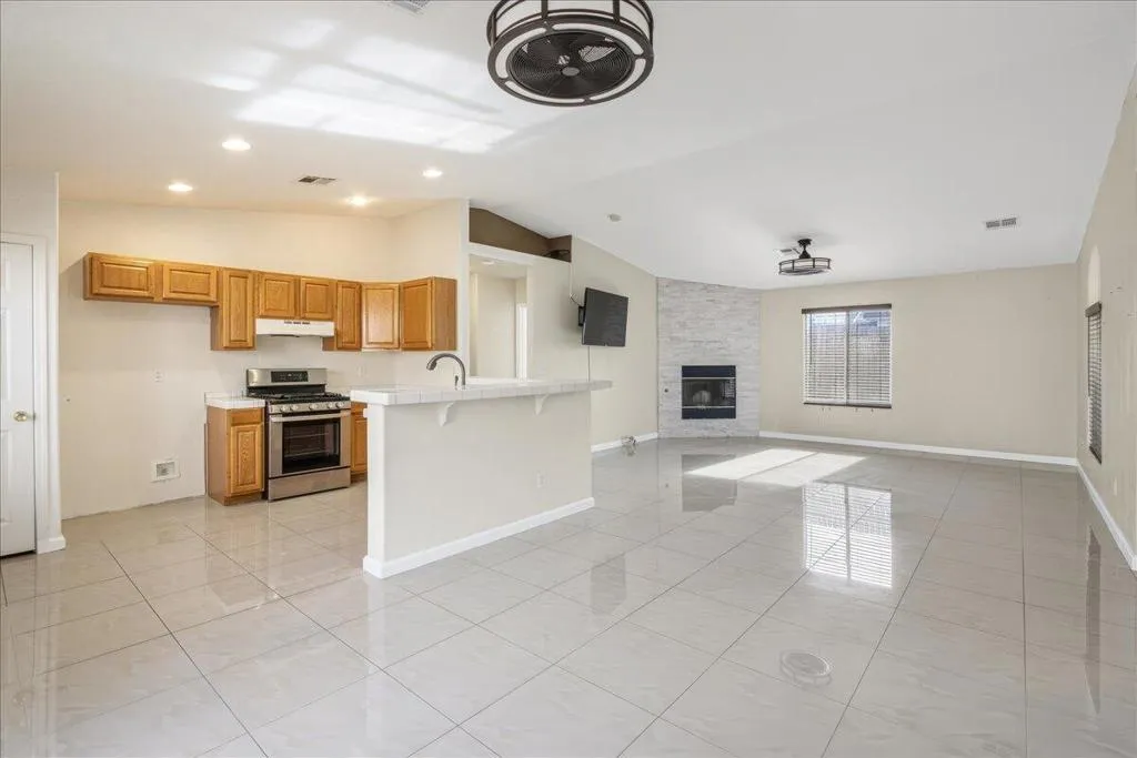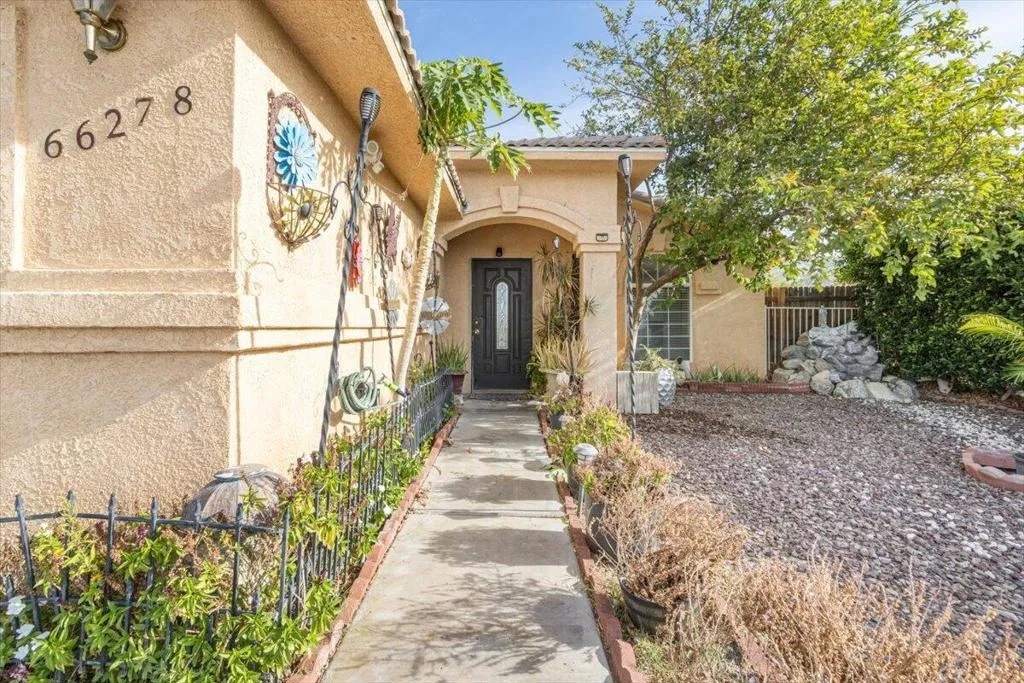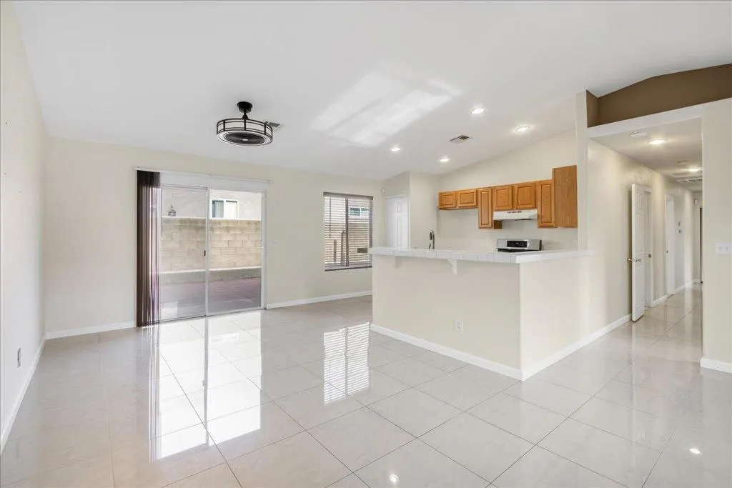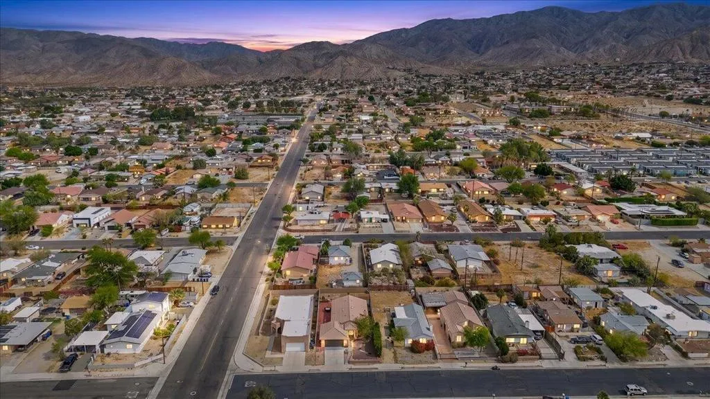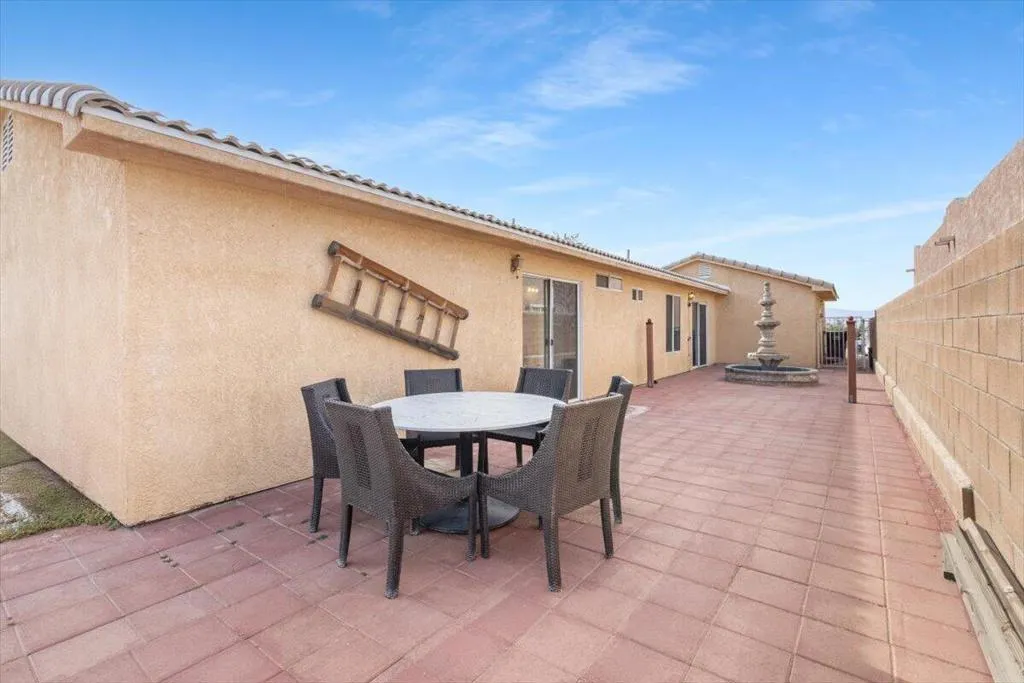 Welcome to this spacious 4-bedroom, 2-bathroom home offering comfort, functionality, and an ideal desert lifestyle. Conveniently located near schools and parks, with easy freeway access, you're just a short drive from downtown Palm Springs and Joshua Tree National Park.Inside, enjoy an open and airy floor plan with high ceilings, abundant natural light, and expansive tile flooring throughout the main living areas. The living room features a stylish tiled fireplace and flows seamlessly into the dining area and kitchen, complete with ample counter space and a breakfast bar--perfect for everyday living and entertaining.The home offers generously sized bedrooms, including a primary suite with updated flooring, a walk-in closet, and direct access to the backyard. Additional highlights include ceiling fans, mirrored closet doors, and an indoor laundry area.Step outside to a spacious backyard featuring a large patio, decorative fountain, and plenty of room to create your ideal outdoor retreat.