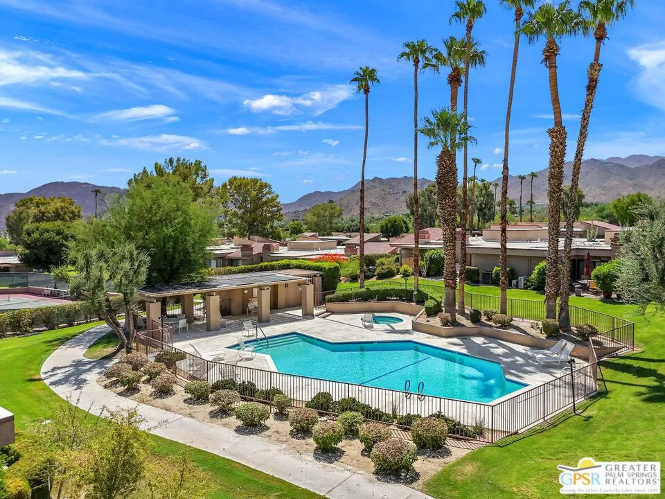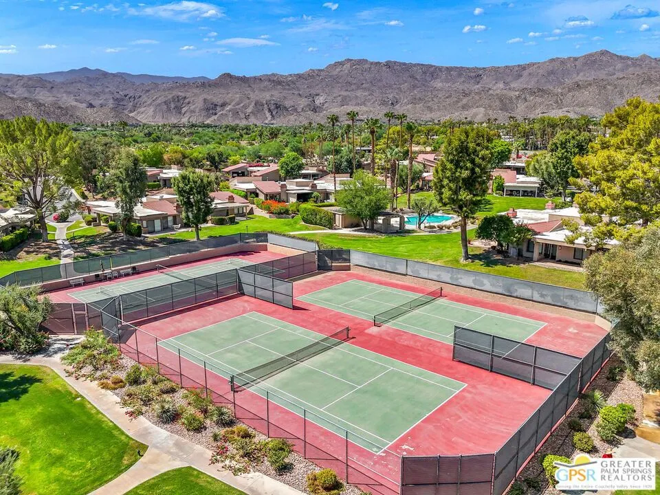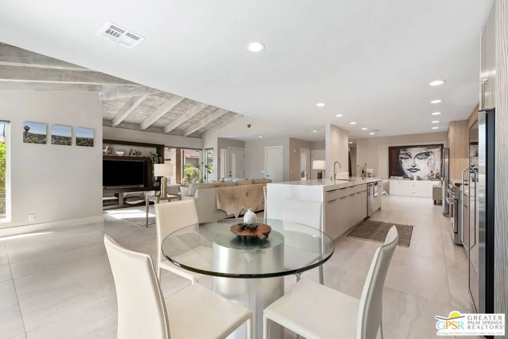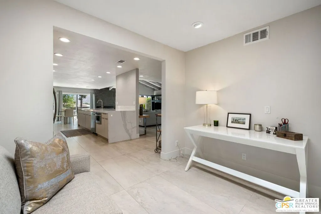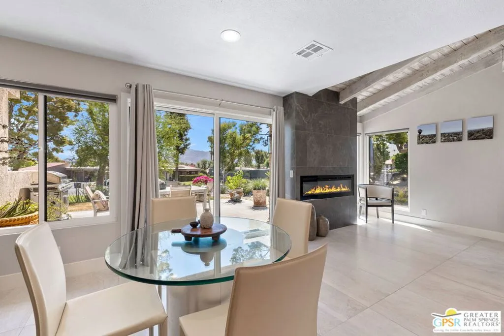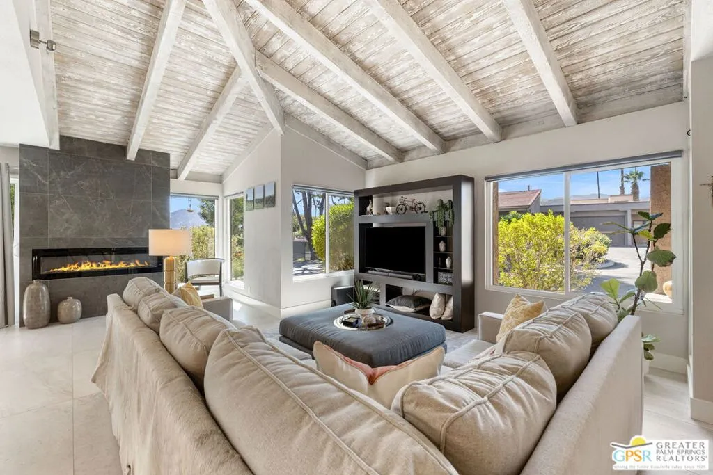 The ONE to see at gated Indian Hills in prime South Palm Desert. Elevated, furnished, and dialed in with designer finishes that feel straight out of Elle Decor. Big 180 degree mountain views meet dramatic beamed and vaulted ceilings, creating a light filled living experience that feels both refined and relaxed. A modernist fireplace anchors the main living area while living and dining spaces flow around a stunning kitchen with quartz counters, sleek cabinetry, curated lighting, and a 150 bottle wine refrigerator ready for entertaining. A den or study adds flexibility. The primary suite features an L shaped walk in closet with custom built ins and a beautifully updated bath with walk in shower and dual vanities. Guest Bedroom Two and bath are equally polished. Patio living takes in tennis courts and lush green space. Laundry tucked into the hall. Two car garage. Indian Hills delivers resort style pools, spas, tennis, and beautifully maintained grounds, all moments from El Paseo.