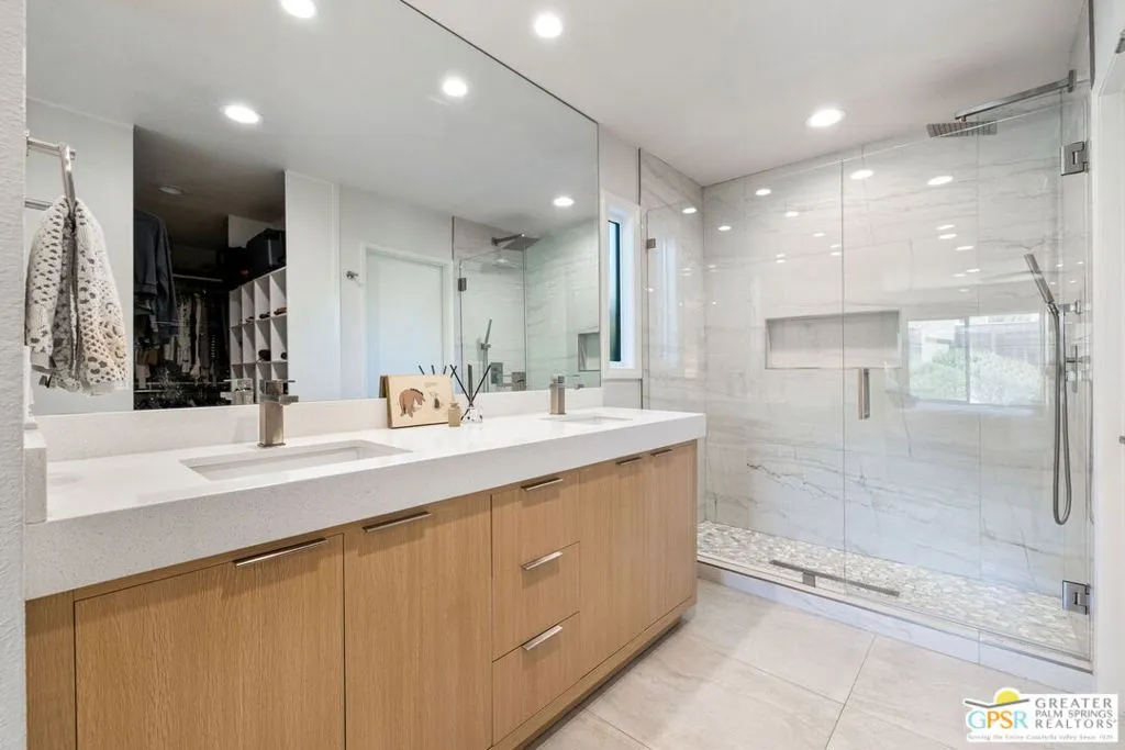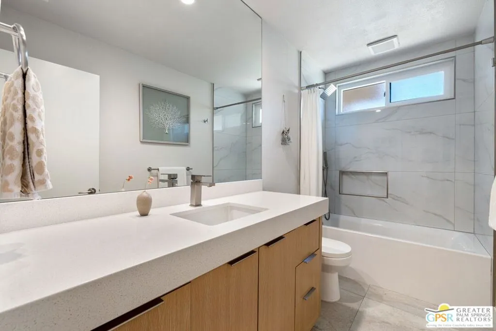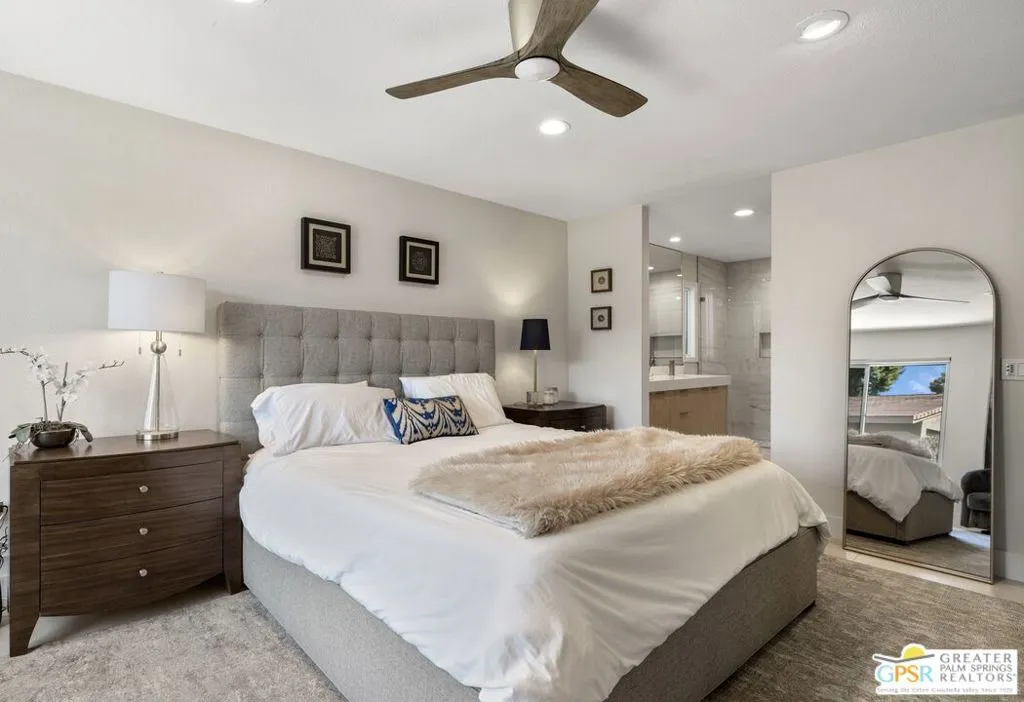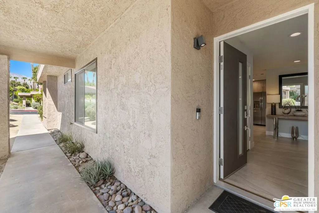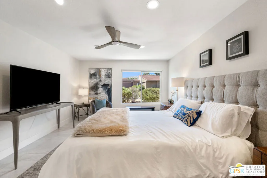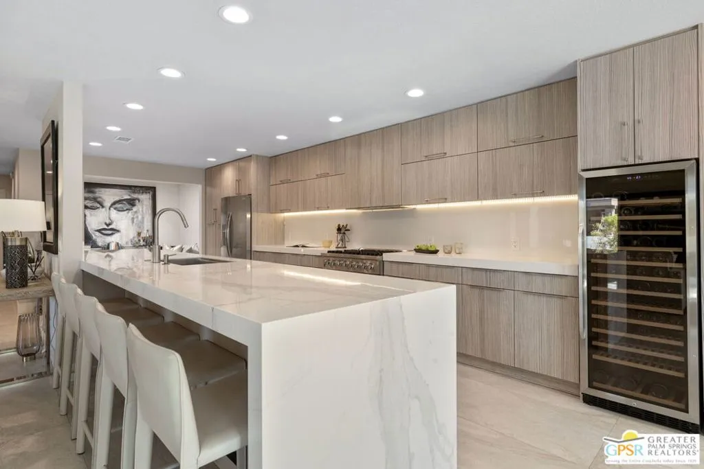 The ONE to see at gated Indian Hills in prime South Palm Desert. Elevated, furnished, and dialed in with designer finishes that feel straight out of Elle Decor. Big 180 degree mountain views meet dramatic beamed and vaulted ceilings, creating a light filled living experience that feels both refined and relaxed. A modernist fireplace anchors the main living area while living and dining spaces flow around a stunning kitchen with quartz counters, sleek cabinetry, curated lighting, and a 150 bottle wine refrigerator ready for entertaining. A den or study adds flexibility. The primary suite features an L shaped walk in closet with custom built ins and a beautifully updated bath with walk in shower and dual vanities. Guest Bedroom Two and bath are equally polished. Patio living takes in tennis courts and lush green space. Laundry tucked into the hall. Two car garage. Indian Hills delivers resort style pools, spas, tennis, and beautifully maintained grounds, all moments from El Paseo.