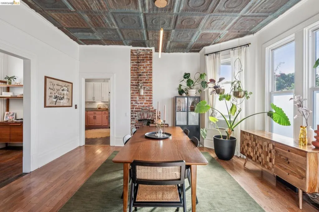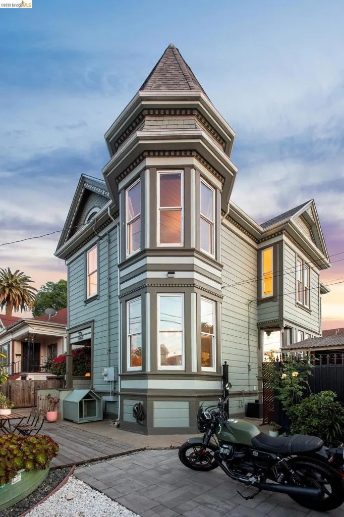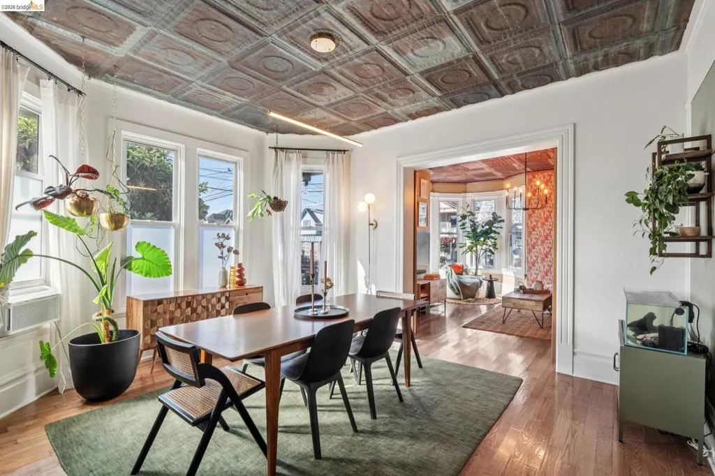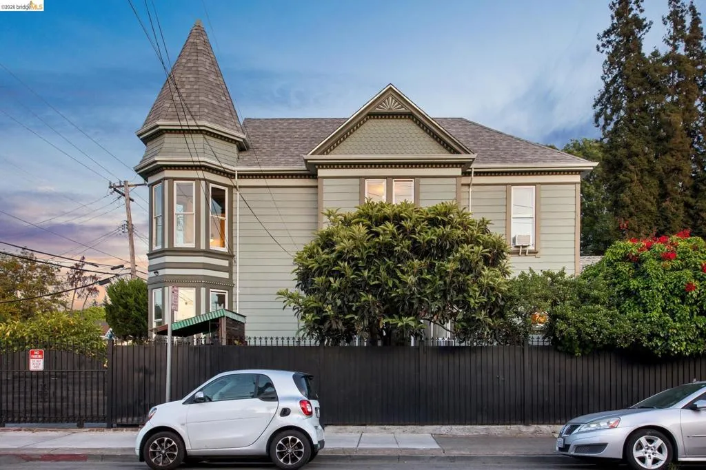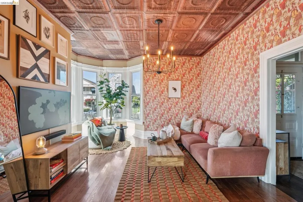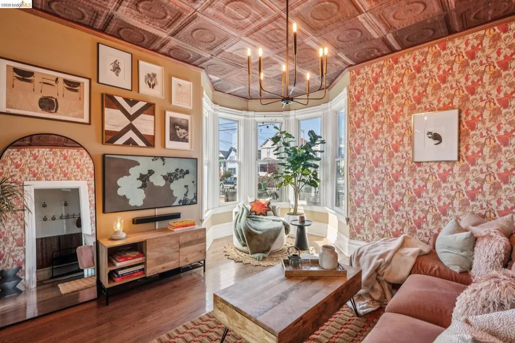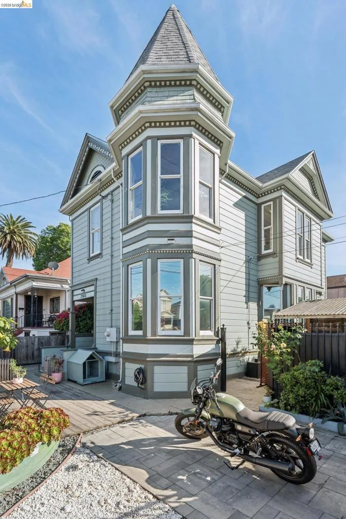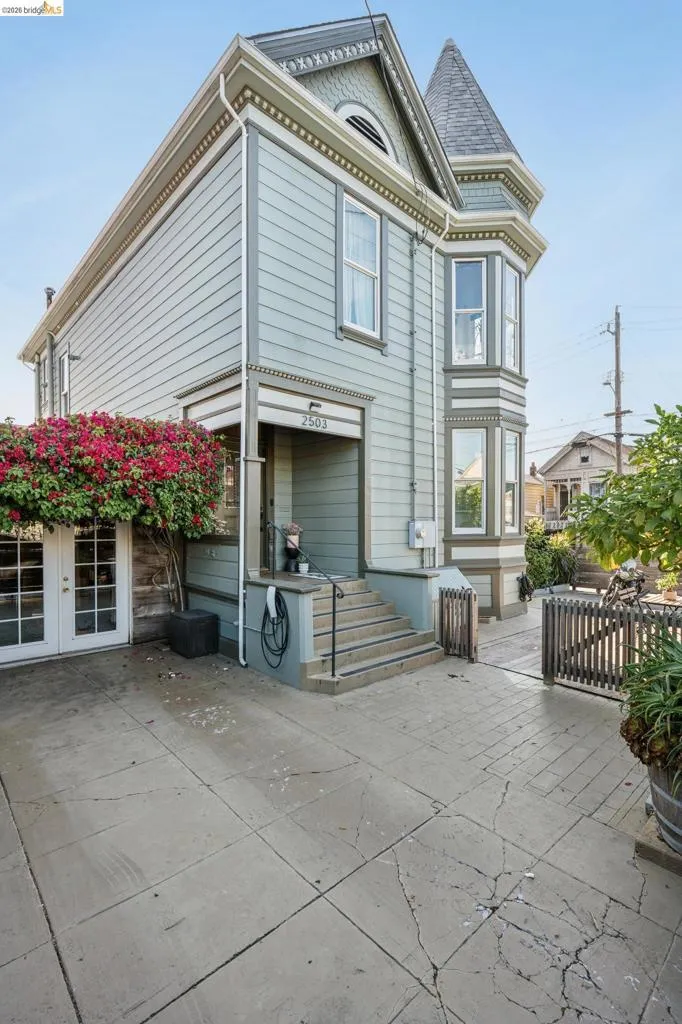 What happens when a gifted artist's wonderland gets a modern soul? This 6bd/2.5ba Victorian stunner at 2503 E 16th Street, Oakland, is the 3,314 sq ft* jewelry box you've heard whispers about — eclectic, warm, and dripping with character — but now she's been loved even more. The entry greets you with greenery and florals. Inside, natural light pours through the parlor, illuminating custom wallpaper, bronze pocket doors, and original wood floors. Antique embossed tin ceilings run throughout, creating a rich opulence that stops you in your tracks. The dining room brings brick, abundant windows, and room for all your vibrant dinner parties. The kitchen is fresh, with new (2026) paint and refrigerator. Upstairs, a Murphy bed and smart storage make the back bedroom work harder, and the updated vanity in the bathroom and resurfaced clawfoot tub feel polished and intentional. Out back, the converted garage is ready for your creative vision — redwood boards, custom window treatments, new (2026) torch down roof overhead. The bonus room now has a proper kitchenette (butcher block, sink, cabinets, fridge), making it a legitimate home office, guest suite, or income opportunity*. The side yard is flagstone and landscaped. There's a cedar fence framing the front yard, a Tesla charger in place, and a hot tub running on an efficient heat pump system. This beguiling Victorian has always had it all. Now it has even more. 2503 E 16th Street is in a convenient location close to downtown Oakland, San Francisco, and transportation nodes. Sewer and sidewalk compliant.