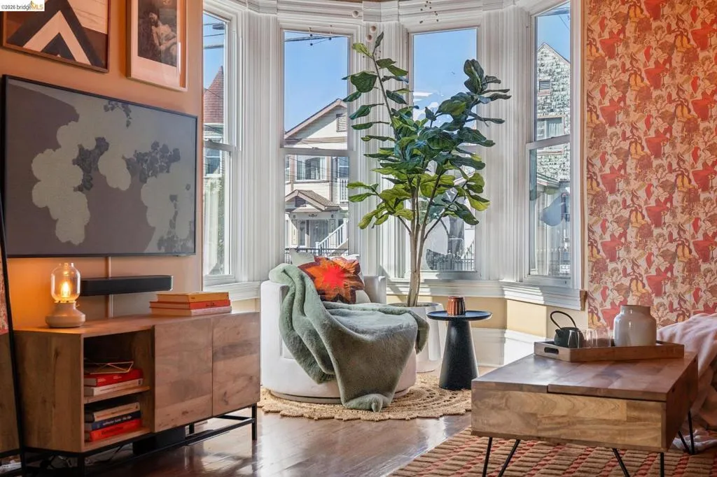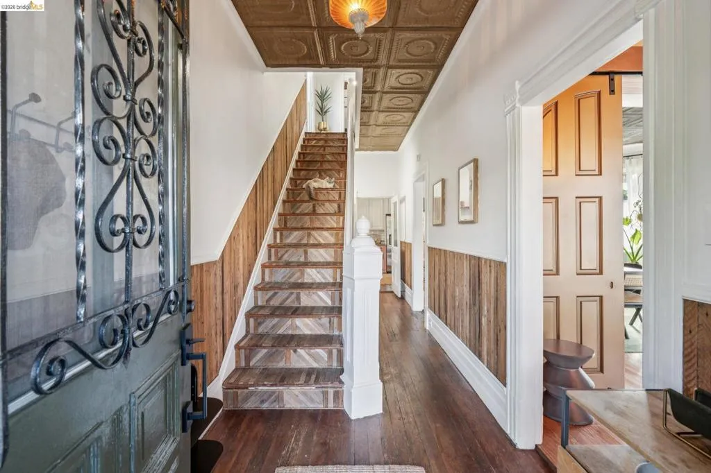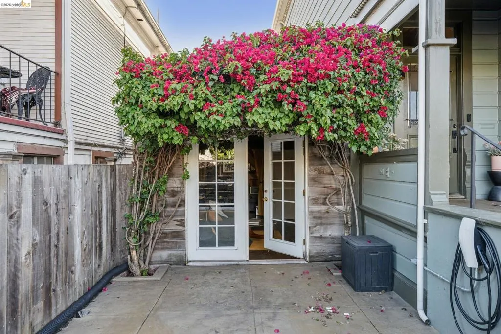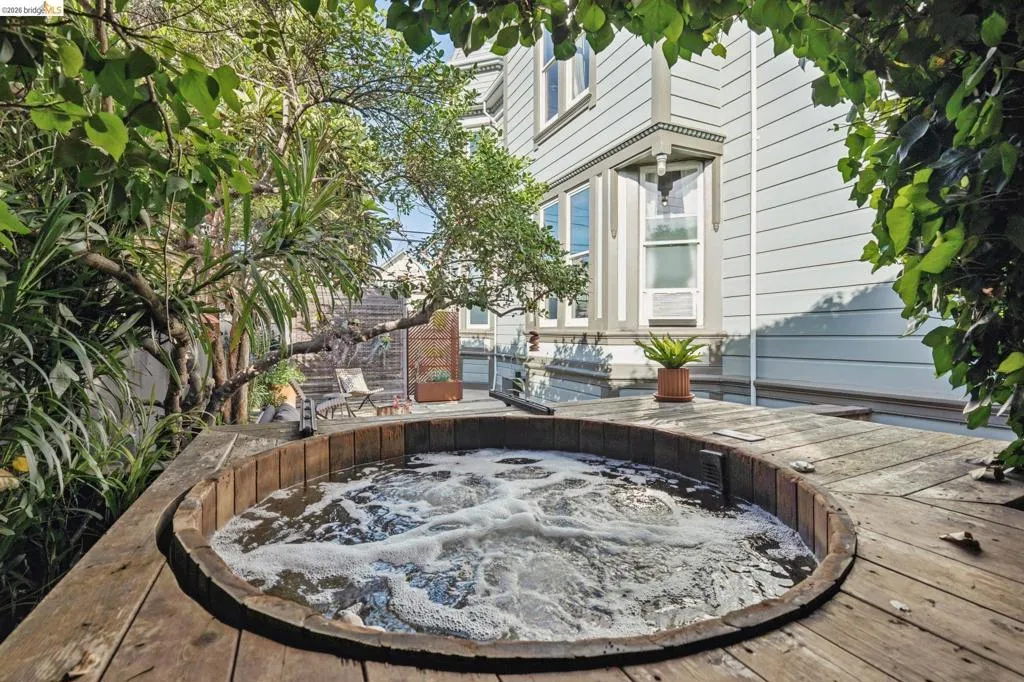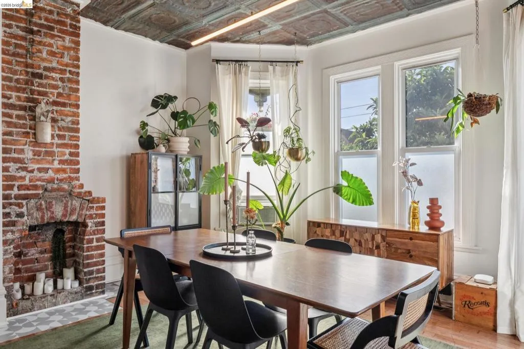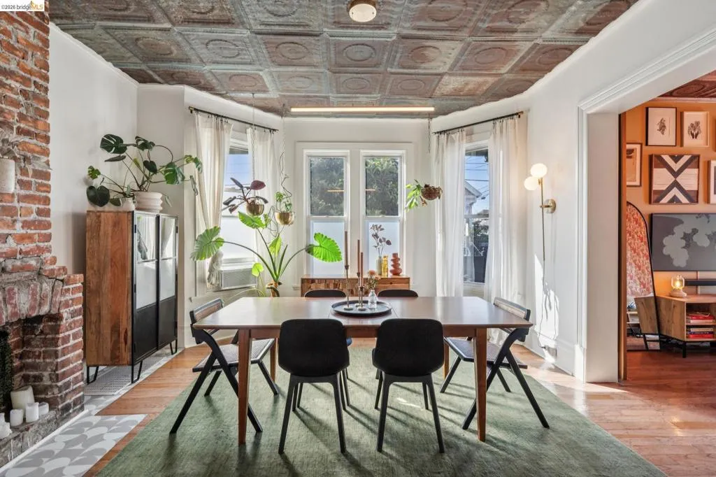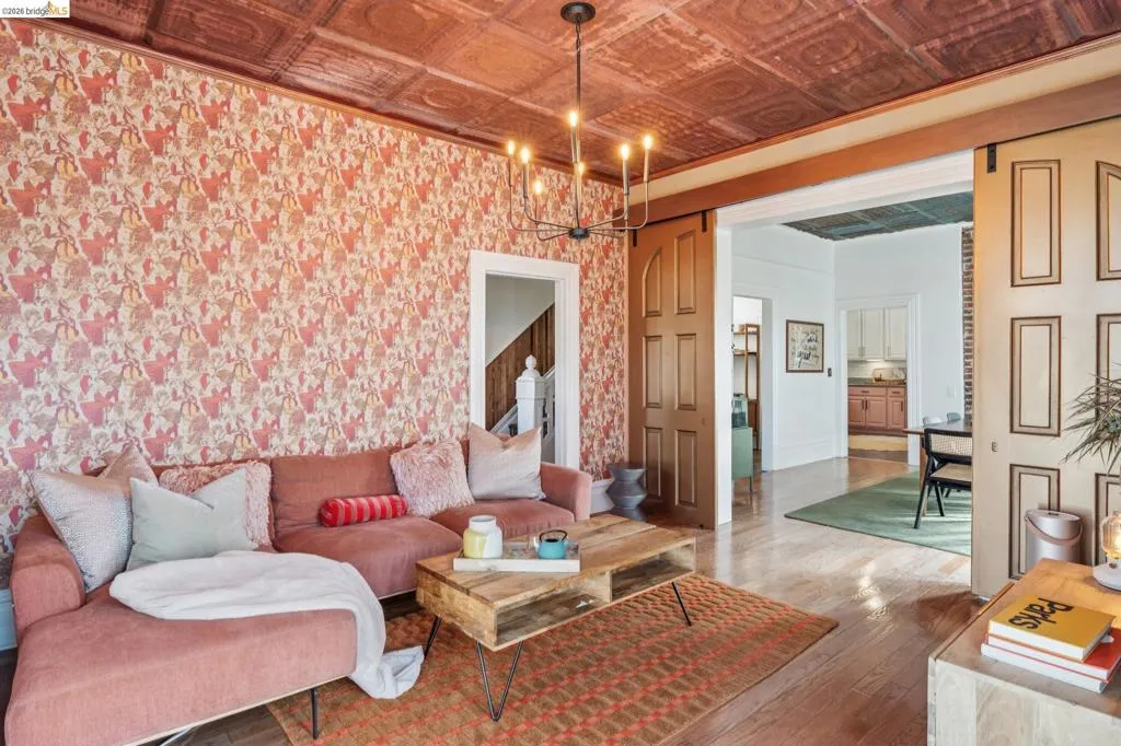 What happens when a gifted artist's wonderland gets a modern soul? This 6bd/2.5ba Victorian stunner at 2503 E 16th Street, Oakland, is the 3,314 sq ft* jewelry box you've heard whispers about — eclectic, warm, and dripping with character — but now she's been loved even more. The entry greets you with greenery and florals. Inside, natural light pours through the parlor, illuminating custom wallpaper, bronze pocket doors, and original wood floors. Antique embossed tin ceilings run throughout, creating a rich opulence that stops you in your tracks. The dining room brings brick, abundant windows, and room for all your vibrant dinner parties. The kitchen is fresh, with new (2026) paint and refrigerator. Upstairs, a Murphy bed and smart storage make the back bedroom work harder, and the updated vanity in the bathroom and resurfaced clawfoot tub feel polished and intentional. Out back, the converted garage is ready for your creative vision — redwood boards, custom window treatments, new (2026) torch down roof overhead. The bonus room now has a proper kitchenette (butcher block, sink, cabinets, fridge), making it a legitimate home office, guest suite, or income opportunity*. The side yard is flagstone and landscaped. There's a cedar fence framing the front yard, a Tesla charger in place, and a hot tub running on an efficient heat pump system. This beguiling Victorian has always had it all. Now it has even more. 2503 E 16th Street is in a convenient location close to downtown Oakland, San Francisco, and transportation nodes. Sewer and sidewalk compliant.