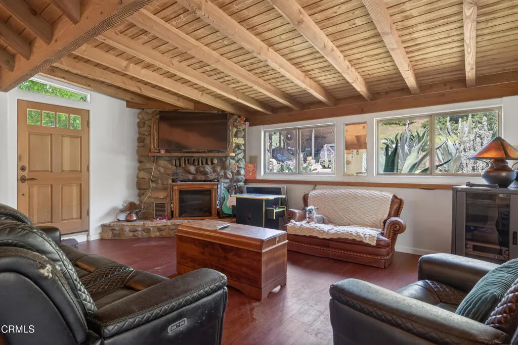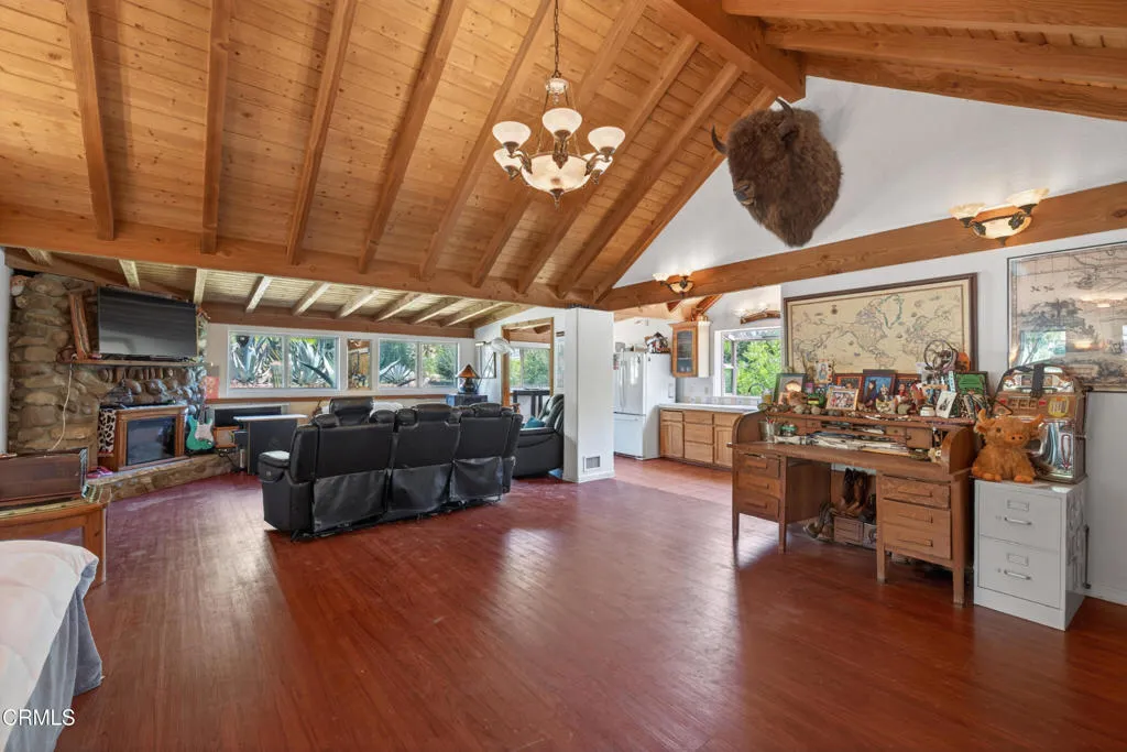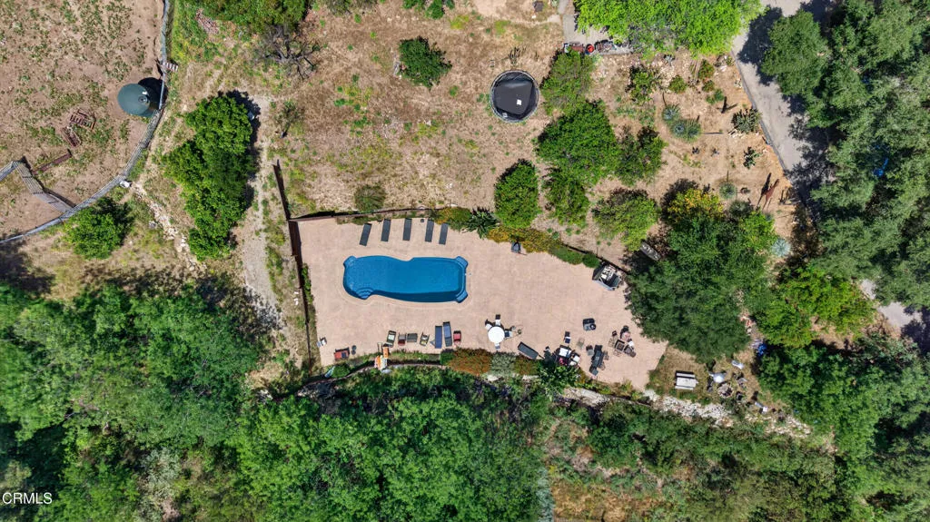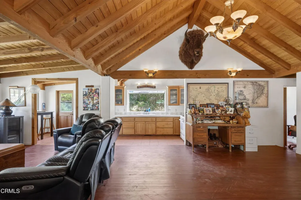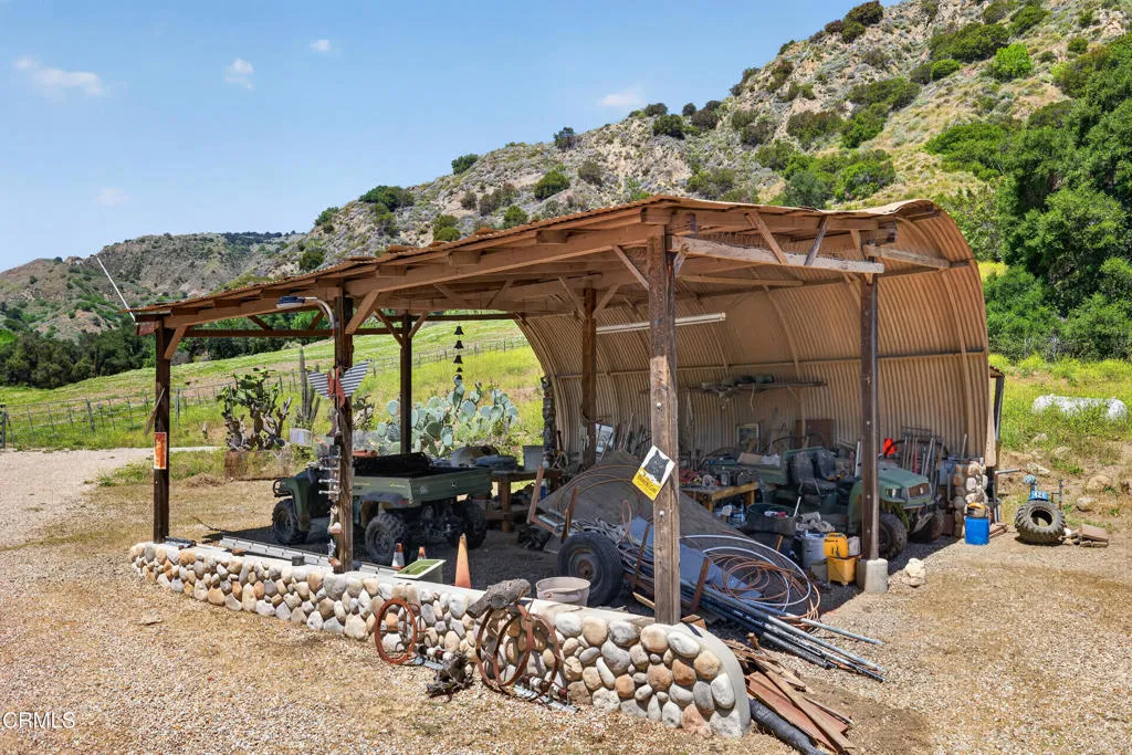 Step into your own private sanctuary--an enchanting, secluded rural ranch where the gentle melody of birdsong greets each morning and majestic mountains beckon herds of dear and owls, hawks, and falcons just beyond your doorstep. Encompassing over 77 acres of pristine landscape, that's surrounded by 5000 unspoiled acres this extraordinary property offers boundless opportunities for exploration and tranquility. Traverse your private trails by ATV or on foot, winding past two serene creeks and ascending to breathtaking mountaintop vistas. Wander through your flourishing orchard and savor a bounty of organic fruit, including lemons, tangelos, oranges, pomegranates, avocados, pears, walnuts, and more!The charming one-bedroom, one-bathroom cabin was thoughtfully rebuilt in 2005, preserving its character while enhancing comfort. Originally designed as a two-bedroom home, it now features an expanded deck that invites you to relax and take in the surrounding beauty. Inside, timeless details abound--from the original wood-burning fireplace dating back to circa 1915 to the elegant newer vaulted wood ceilings that create a sense of openness and light. The home is equipped with a water filtration system and reverse osmosis drinking water for modern convenience. Distinctive touches, including a striking mounted bison head and a beautiful stained-glass window, lend warmth and personality, while the bedroom offers custom-built wooden drawers for added charm and functionality.This one-of-a-kind ranch is further complemented by an expansive 3,500-square-foot barn or hangar, complete with four large roll-up doors--perfect for housing a plane, RV, your boats, or up to eight cars--and even includes one car lift but you could add more for a serious car collector. Enjoy leisurely days by your sparkling private pool, host unforgettable gatherings, or unwind beside the outdoor fire pit under a canopy of stars roasting marshmellows. Several additional outbuildings provide versatile opportunities, whether envisioned as a music studio, guest homes, ADUs, workshops, office space, or storage for farm equipment.The fully fenced and thoughtfully designed, the property features separate enclosures for pasture and structures, along with a solar-powered, double-gated entry that ensures both privacy and security. This is more than a property--it's a rare and remarkable lifestyle opportunity. Come experience the beauty, serenity, and endless possibilities of this exceptional ranch!