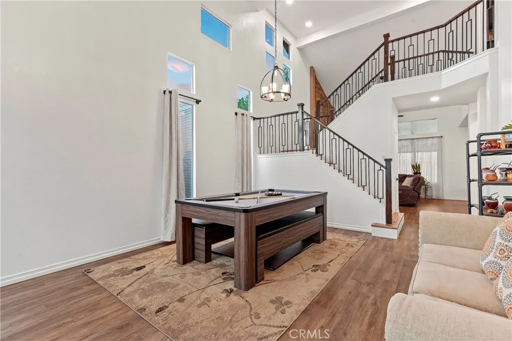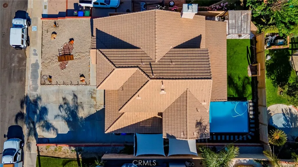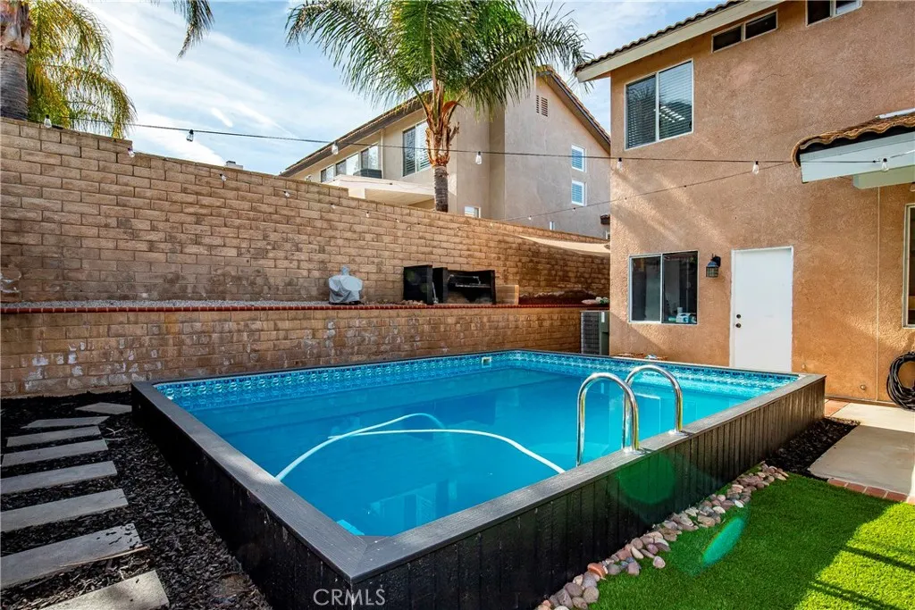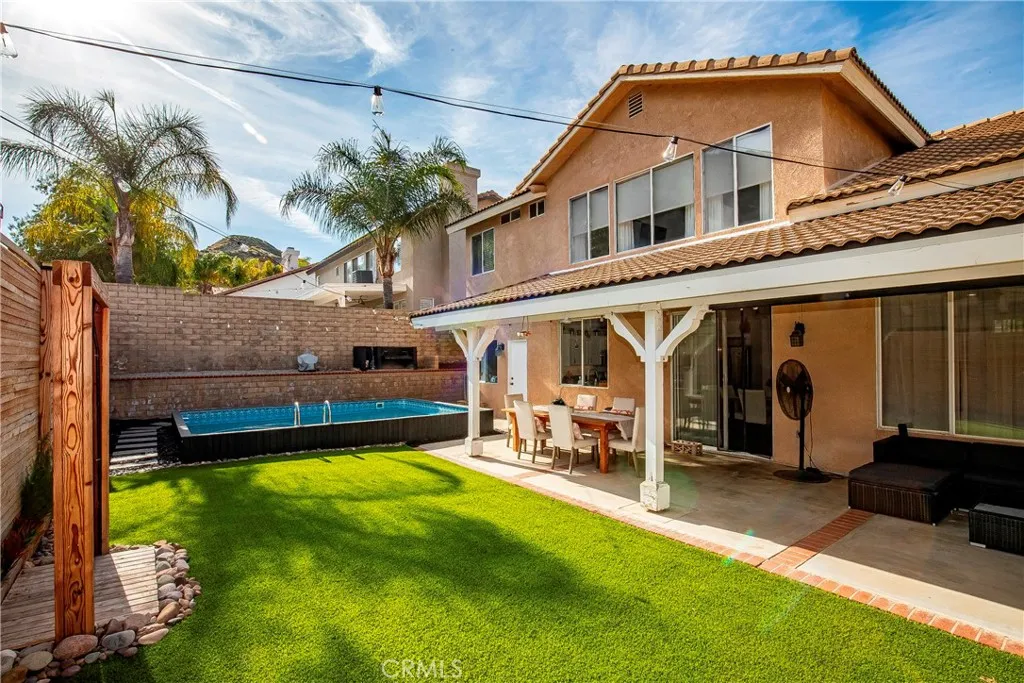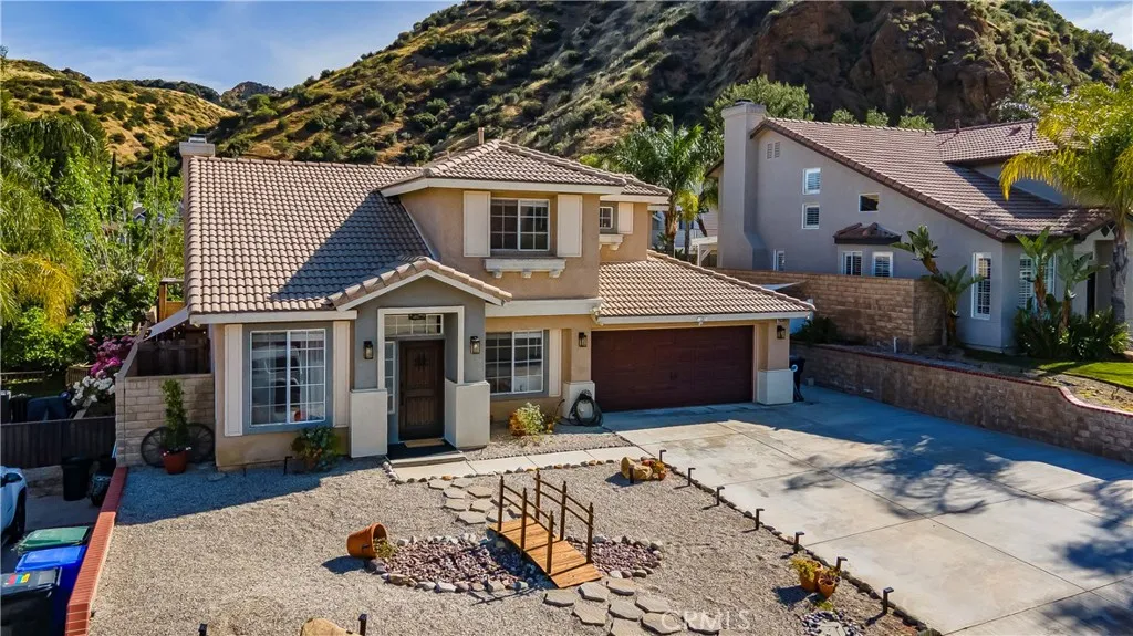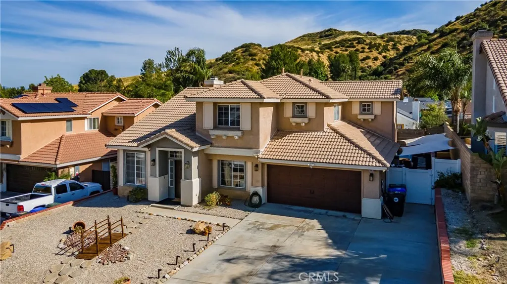 Welcome to this beautiful Castaic pool home filled with custom features! 4 beds, 3 baths over 2,200 sqft, downstairs bed & bath, 3-car tandem garage, custom 2 yr old earthquake proof pool with no HOA or Mello Roos!! Featuring high ceilings, large formal living room. The open floor concept continues into the family room featuring a gorgeous custom stone fireplace and mantle for cozy nights AND a stone accented under the stairs dog sleeping room to match! Also under the stairs is ample shelving for storage.Kitchen remodeled 2 years ago featuring custom island larger and rotated for more space, newer garbage disposal, water filtration system through home, newer microwave and dishwasher, touchless kitchen faucet, granite countertops with beautiful "concrete-like" finish on top, 1 year old silent garage door motor, new smoke and carbon monoxide detectors, new a/c thermostat and a/c vent, all new light switches and plugs throughout. As you head up the stairs to the second floor you step onto the beautiful new wood flooring that continues ithrough the hallway into the primary bedroom featuring a wood wall highlight, wall to wall windows with new motorized blinds to enjoy the stars in privacy. Ample secondary bedrooms also have all new blinds. Exterior features drought resistant front and backyard (sprinkler system still intact) tastefully done to highlight plants, backyard has a beautiful water feature, 8 ft wood treated privacy fence on back wall, custom built gazebo with seating and fire pit and a gated dog run on side yard (with door door going into family room). 220 EV Charger in garage. Too many custom upgrades to mention. This is a must see!