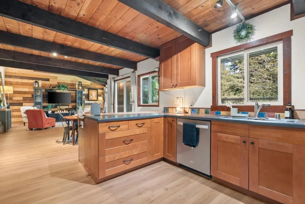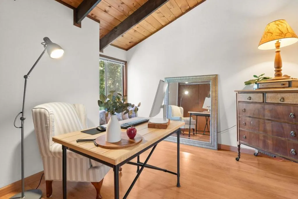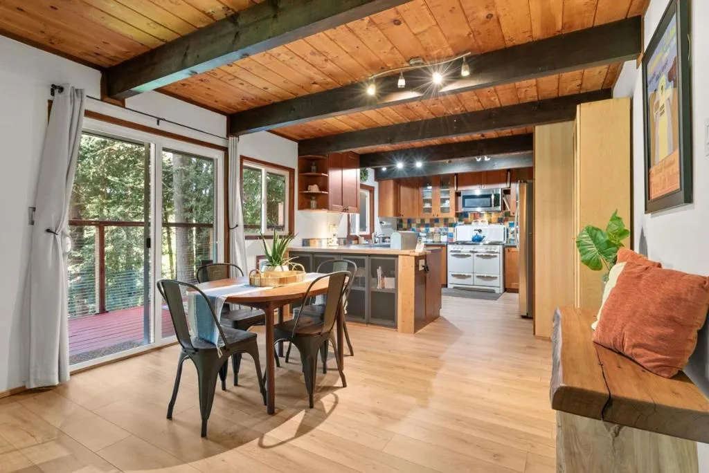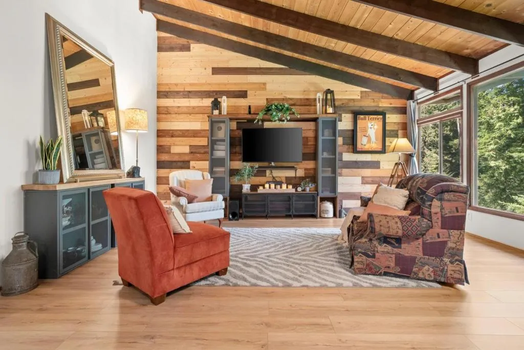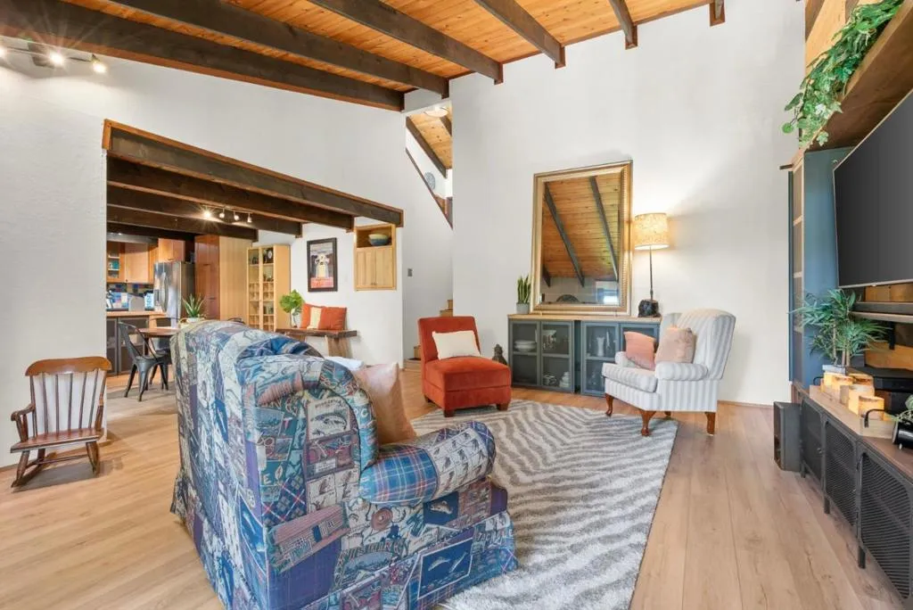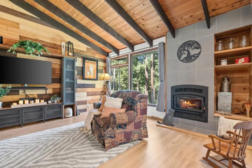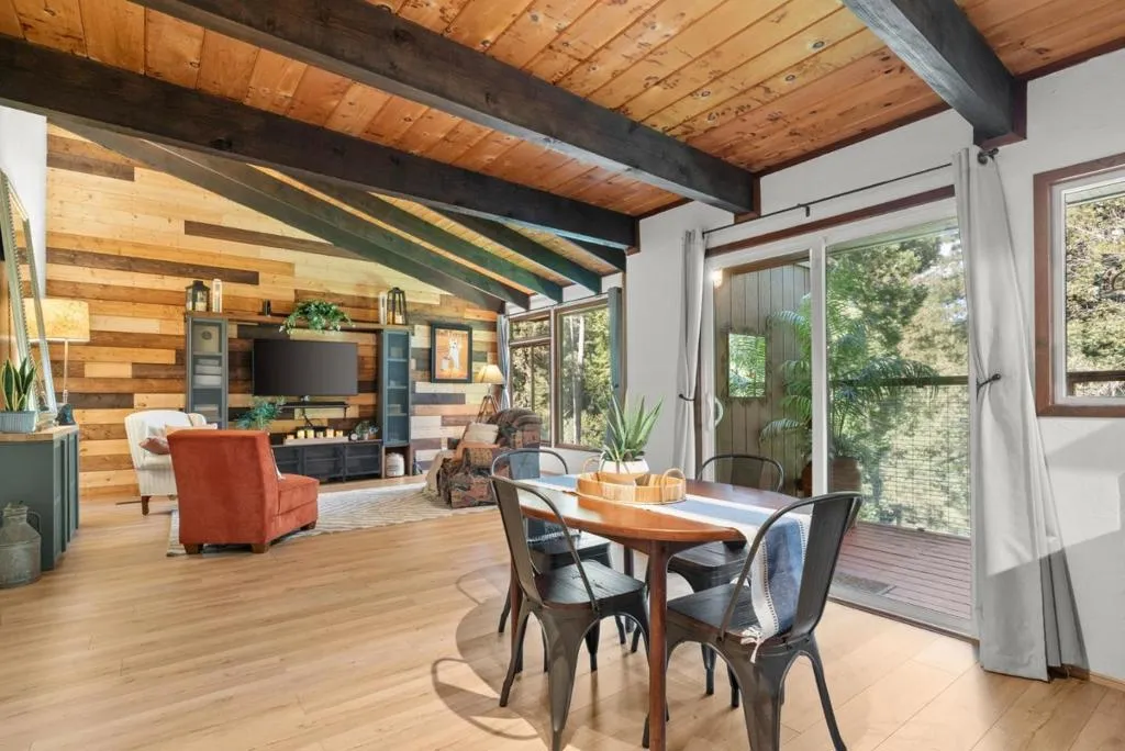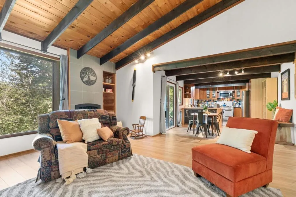 Nestled on a quiet cul-de-sac on a court above the Boulder Creek Golf Course, this charming and unique 3-bedroom, 2-bath home offers well-appointed living spaces designed for both privacy and views through a plethora of windows, open beam ceilings, a cozy fireplace and a stunning wood accent wall in the living room. The attached two-car garage keeps daily life convenient, while the open concept living area flows to a deck that extends outdoor space and overlooks a large lot framed by lush greenery and serene views. The versatile floor plan provides comfortable and flexible spaces with good separation that can function as a home office, guest room, or hobby area. There is a public sewer, no HOA dues and a generator, each simplifying maintenance and ongoing costs. Located close to the course, trails, and local amenities, this property blends character and nature into an inviting and easy-to-love home.