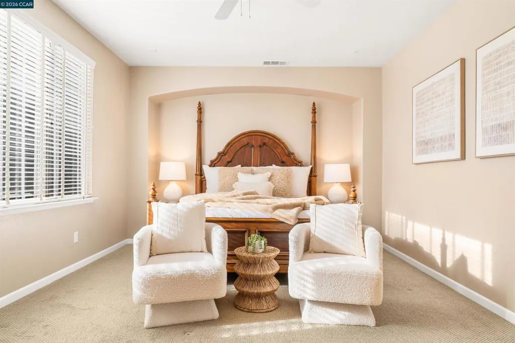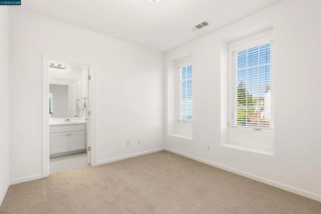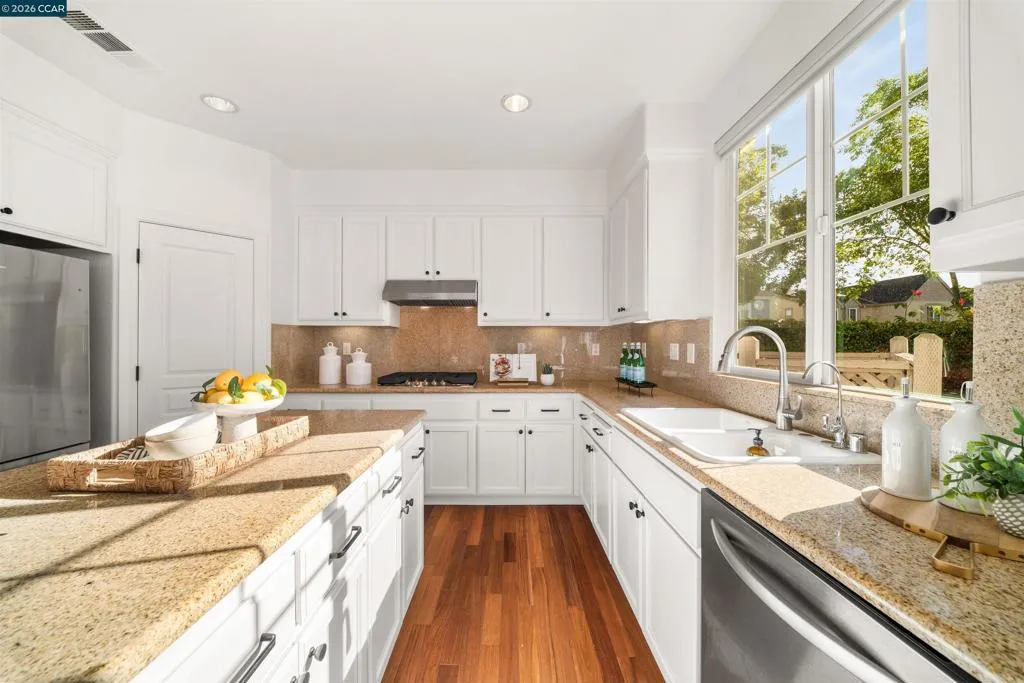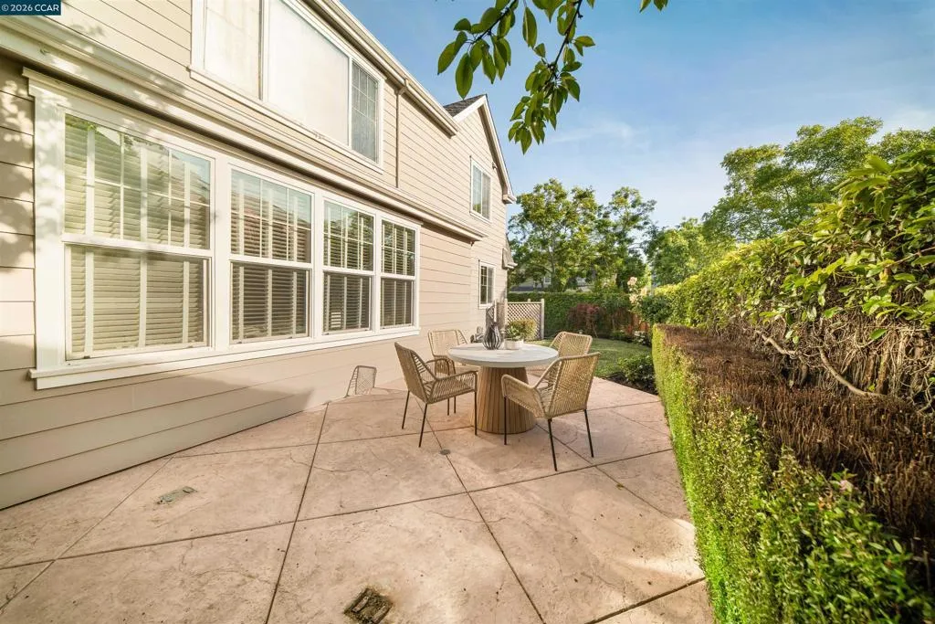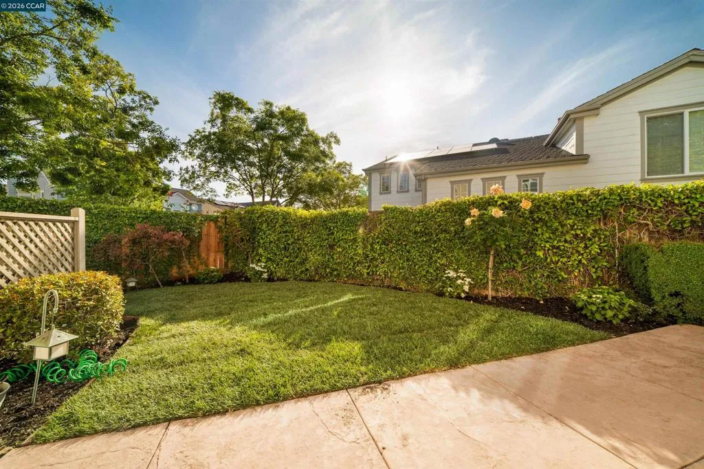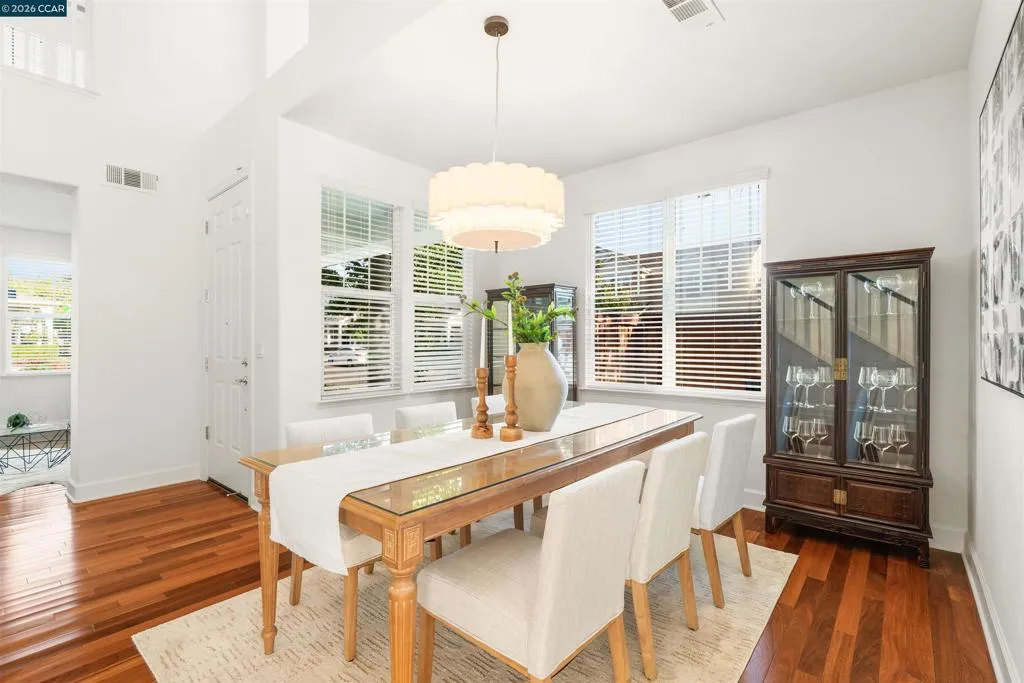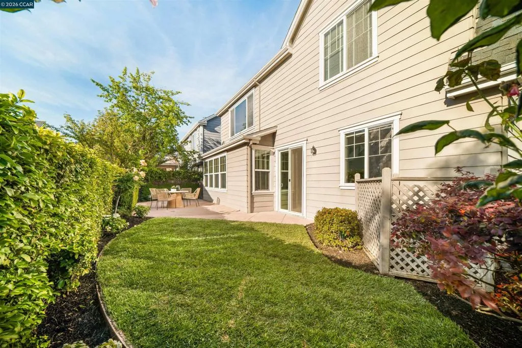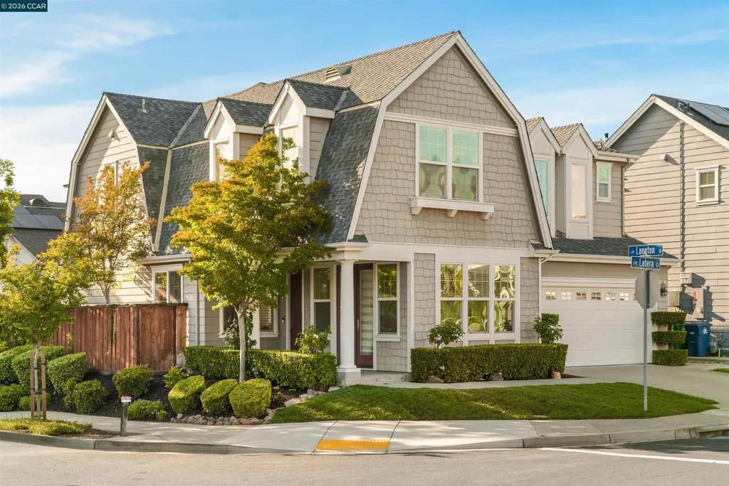Set on a corner lot in a quiet Windemere cul-de-sac, this charming home features soaring ceilings and bright, inviting interiors throughout. The thoughtful floor plan opens to a versatile formal living room with French doors, and can be used as a home office, sitting room, or flex space. The formal dining room flows easily into the beautifully appointed kitchen, complete with built-in stainless steel appliances, a center island, walk-in pantry, and sunny breakfast nook overlooking the spacious family room. A desirable main-level bedroom and full bath complete the first floor. Upstairs, a bright bonus room offers the perfect setting for a media lounge, study area, playroom, or secondary living space. The light-filled primary suite features two closets, including one walk-in, and an ensuite bath with dual sinks, makeup vanity, soaking tub, and walk-in shower. Two additional secondary bedrooms, a shared bath, and an upstairs laundry room add everyday convenience. The low-maintenance backyard includes a lush lawn and spacious patio, ideal for relaxing or entertaining. Enjoy close proximity to neighborhood parks, top-rated San Ramon Valley schools, and shopping and dining at City Center.