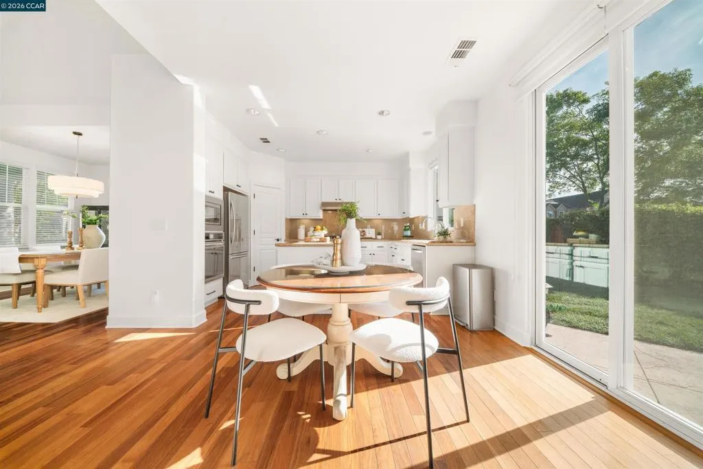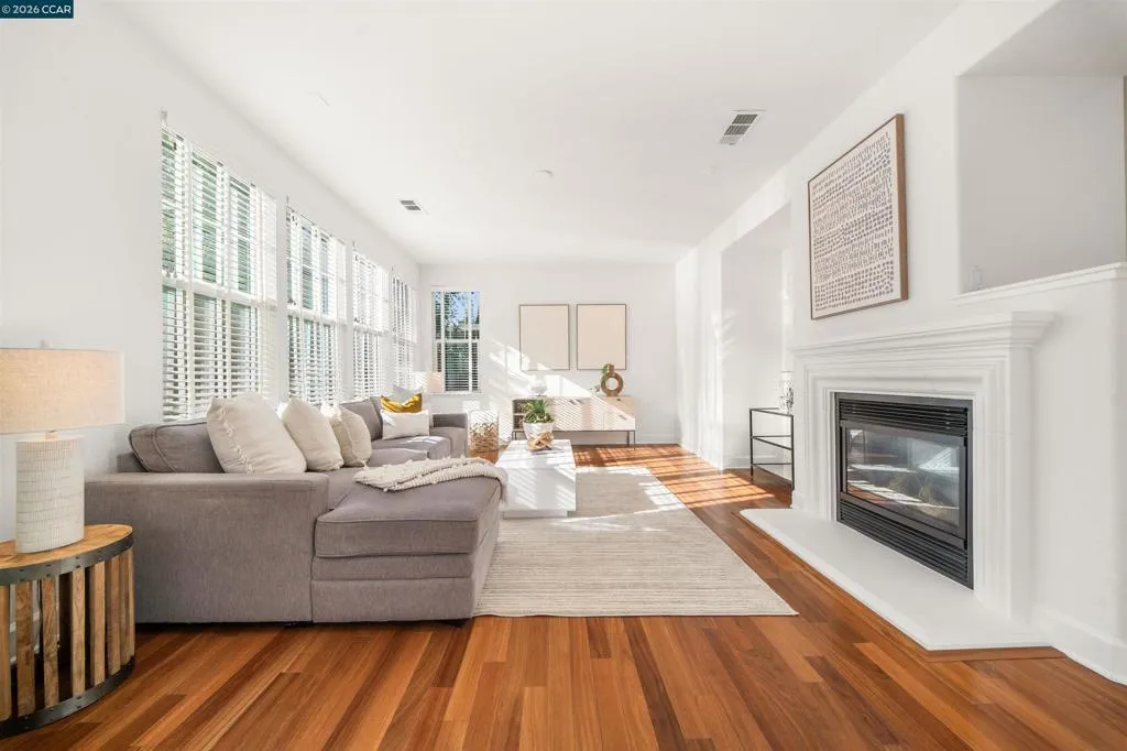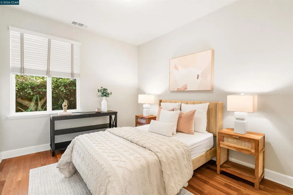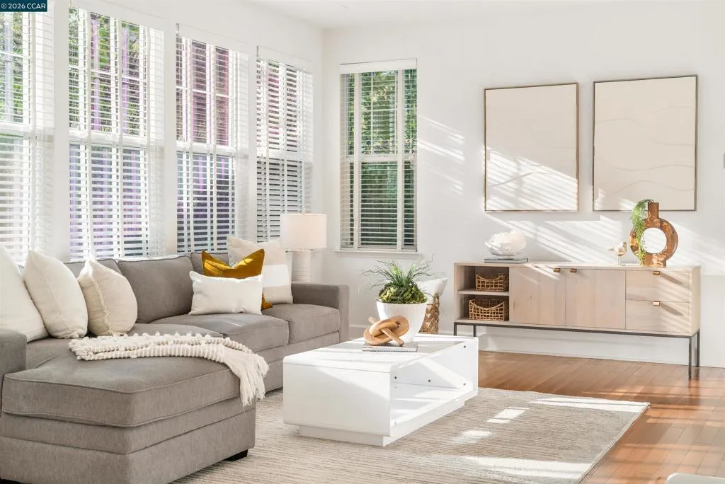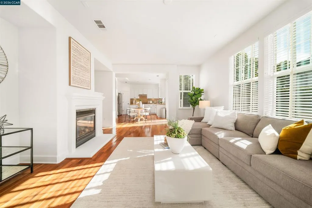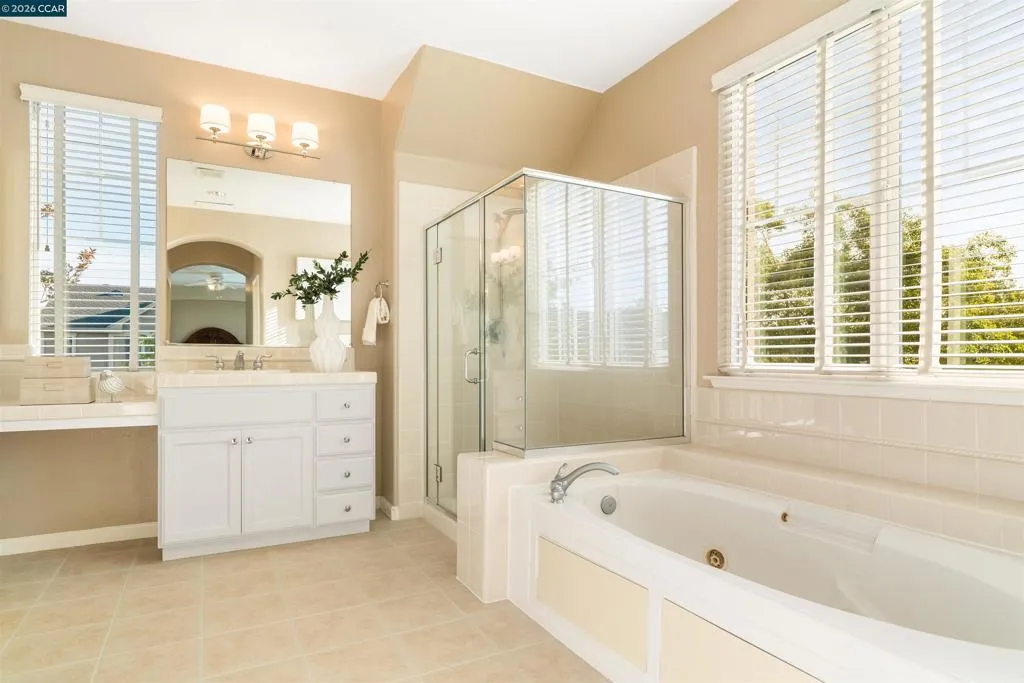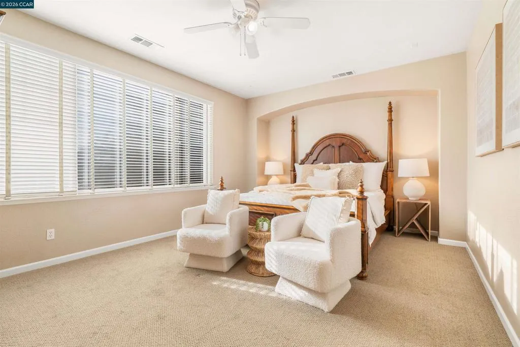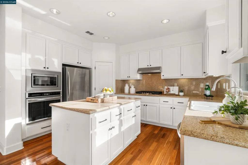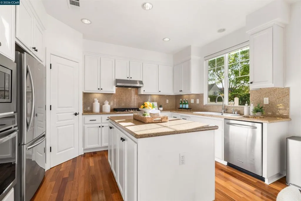 Set on a corner lot in a quiet Windemere cul-de-sac, this charming home features soaring ceilings and bright, inviting interiors throughout. The thoughtful floor plan opens to a versatile formal living room with French doors, and can be used as a home office, sitting room, or flex space. The formal dining room flows easily into the beautifully appointed kitchen, complete with built-in stainless steel appliances, a center island, walk-in pantry, and sunny breakfast nook overlooking the spacious family room. A desirable main-level bedroom and full bath complete the first floor. Upstairs, a bright bonus room offers the perfect setting for a media lounge, study area, playroom, or secondary living space. The light-filled primary suite features two closets, including one walk-in, and an ensuite bath with dual sinks, makeup vanity, soaking tub, and walk-in shower. Two additional secondary bedrooms, a shared bath, and an upstairs laundry room add everyday convenience. The low-maintenance backyard includes a lush lawn and spacious patio, ideal for relaxing or entertaining. Enjoy close proximity to neighborhood parks, top-rated San Ramon Valley schools, and shopping and dining at City Center.